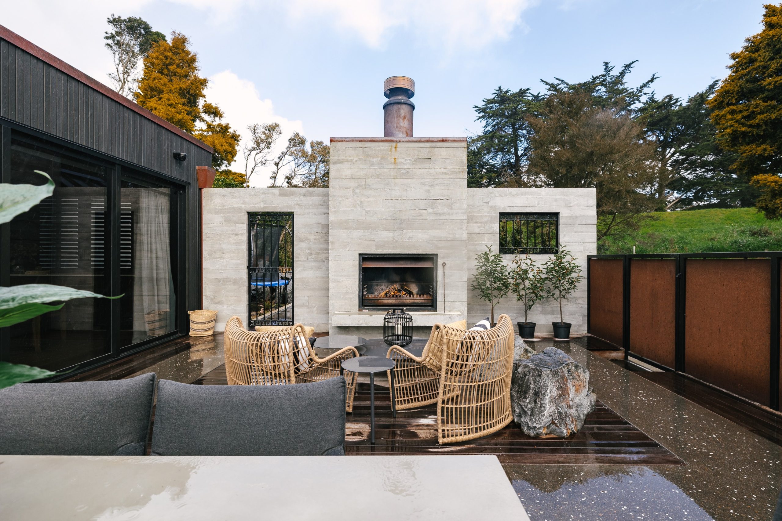 The outdoor fireplace from Heatrite is a cosy feature for entertaining in cooler weather.