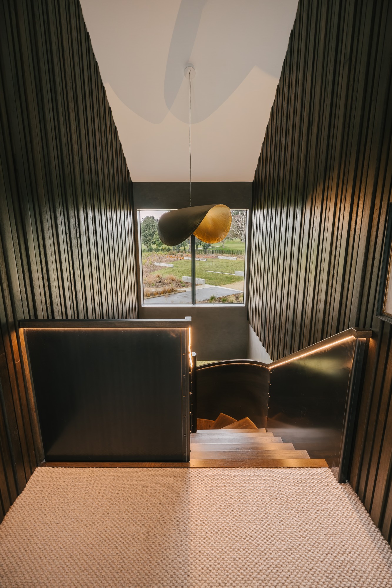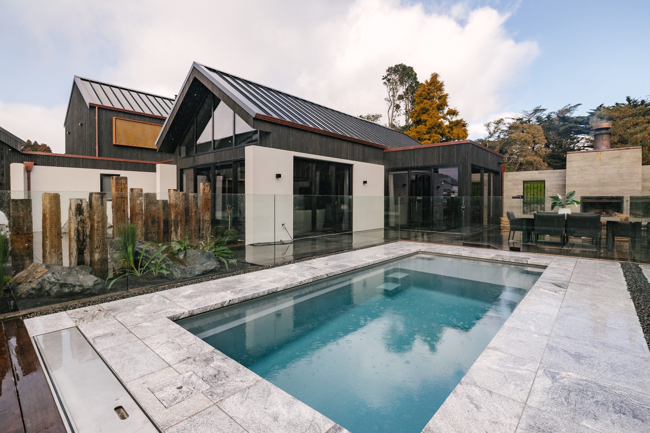 This gabled cedar, concrete and steel residence built by Inhouse Construction enjoys a unique position bordering a golf course, nature reserve and the Manawatū River.