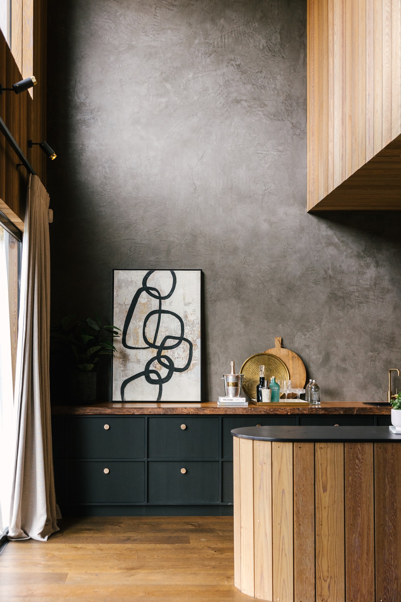 Ben entertains often and wanted the house to feel dramatic but still practical day to day. That influenced how the kitchen was designed as the hub of the home, with vaulted ceilings giving it presence and the material palette reflecting his love of stone, steel and timber,” says Nicola.