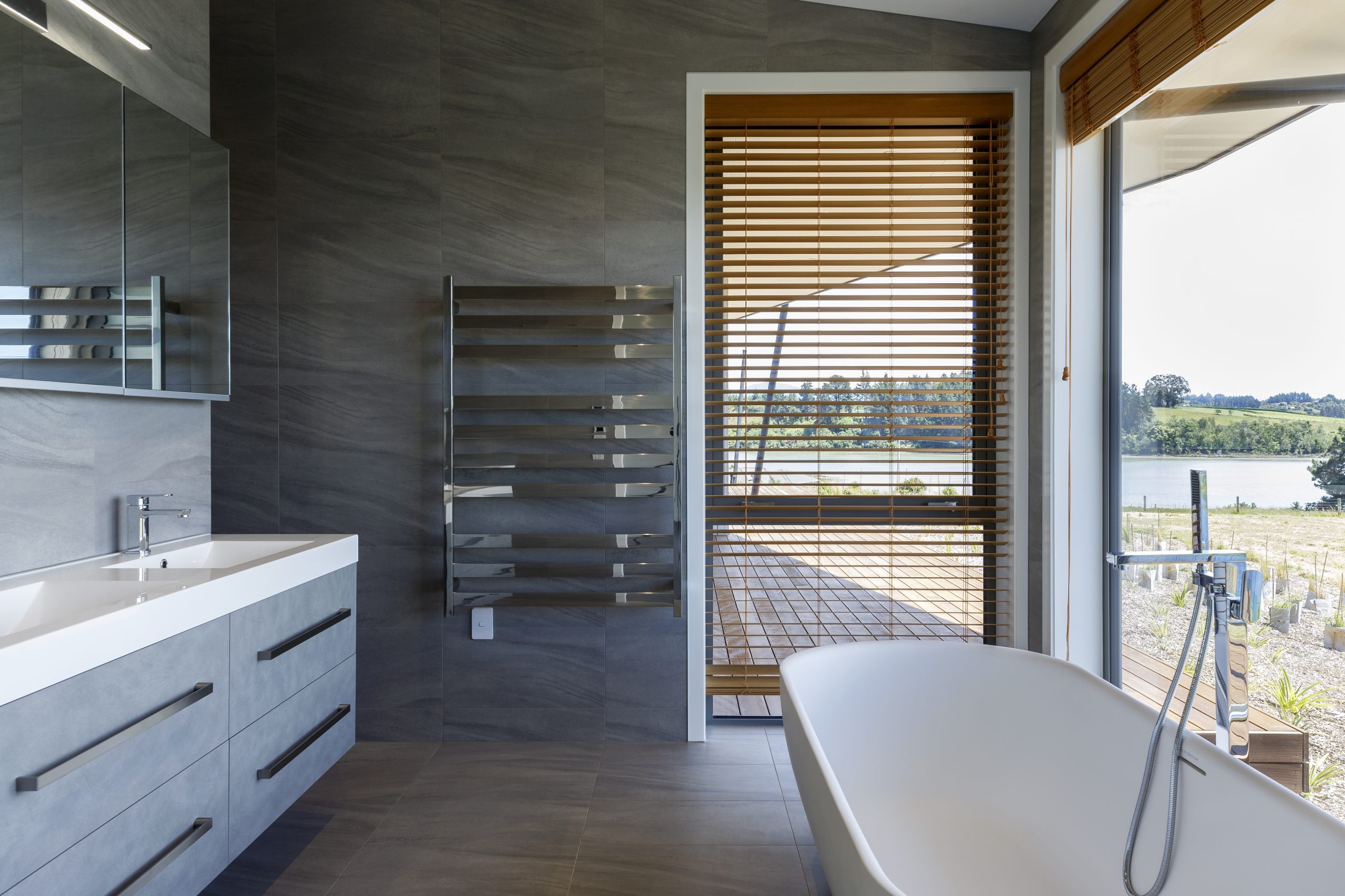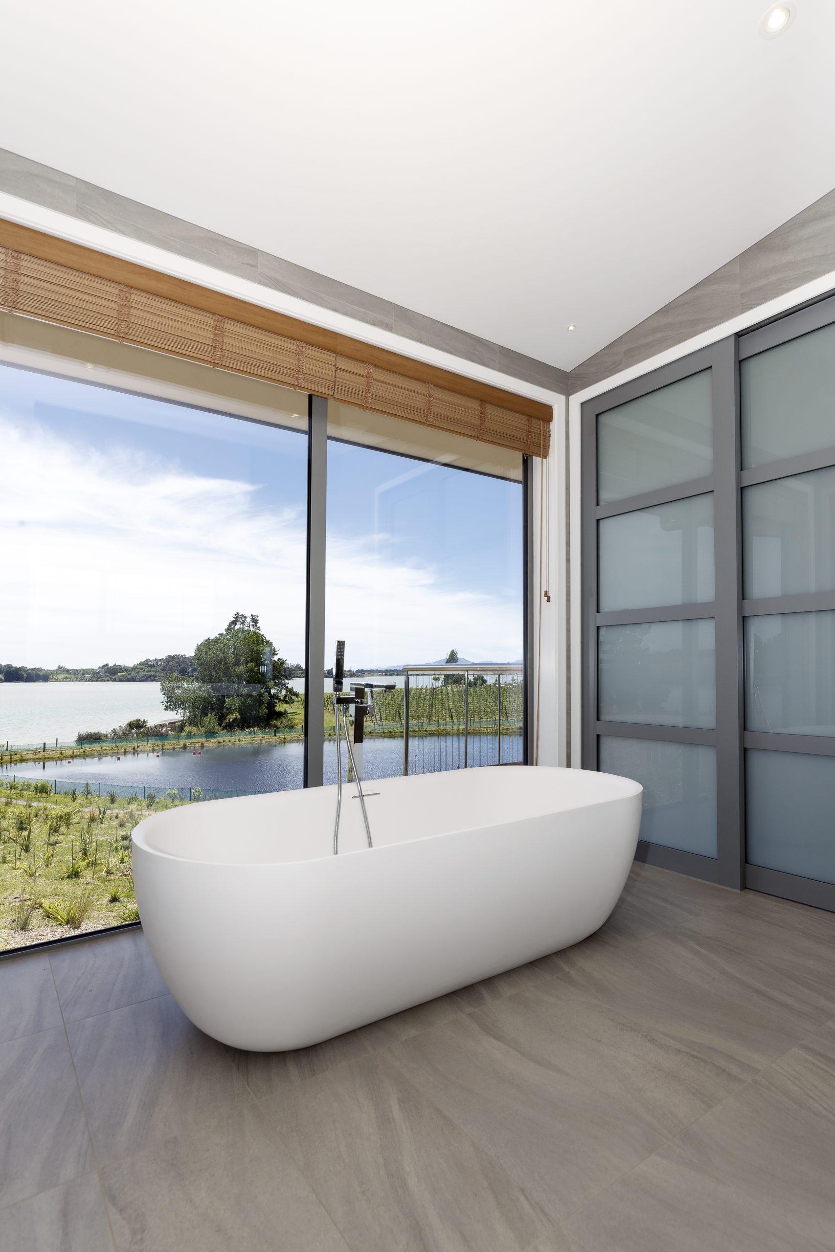 The master ensuite showcases the home’s thoughtful design, balancing luxury with functionality. “The master ensuite is carefully designed to allow a private toilet and shower hidden behind the vanity mirror wall,” Nick says. This innovative layout means the bathroom window can remain open to the view while maintaining privacy. The stand-alone bath is strategically positioned to capture uninterrupted views, enhancing the experience of relaxation. “The fully tiled bathroom features underfloor heating, providing year-round comfort,” he adds. The combination of natural materials, soft lighting, and minimalist design creates a calm atmosphere.