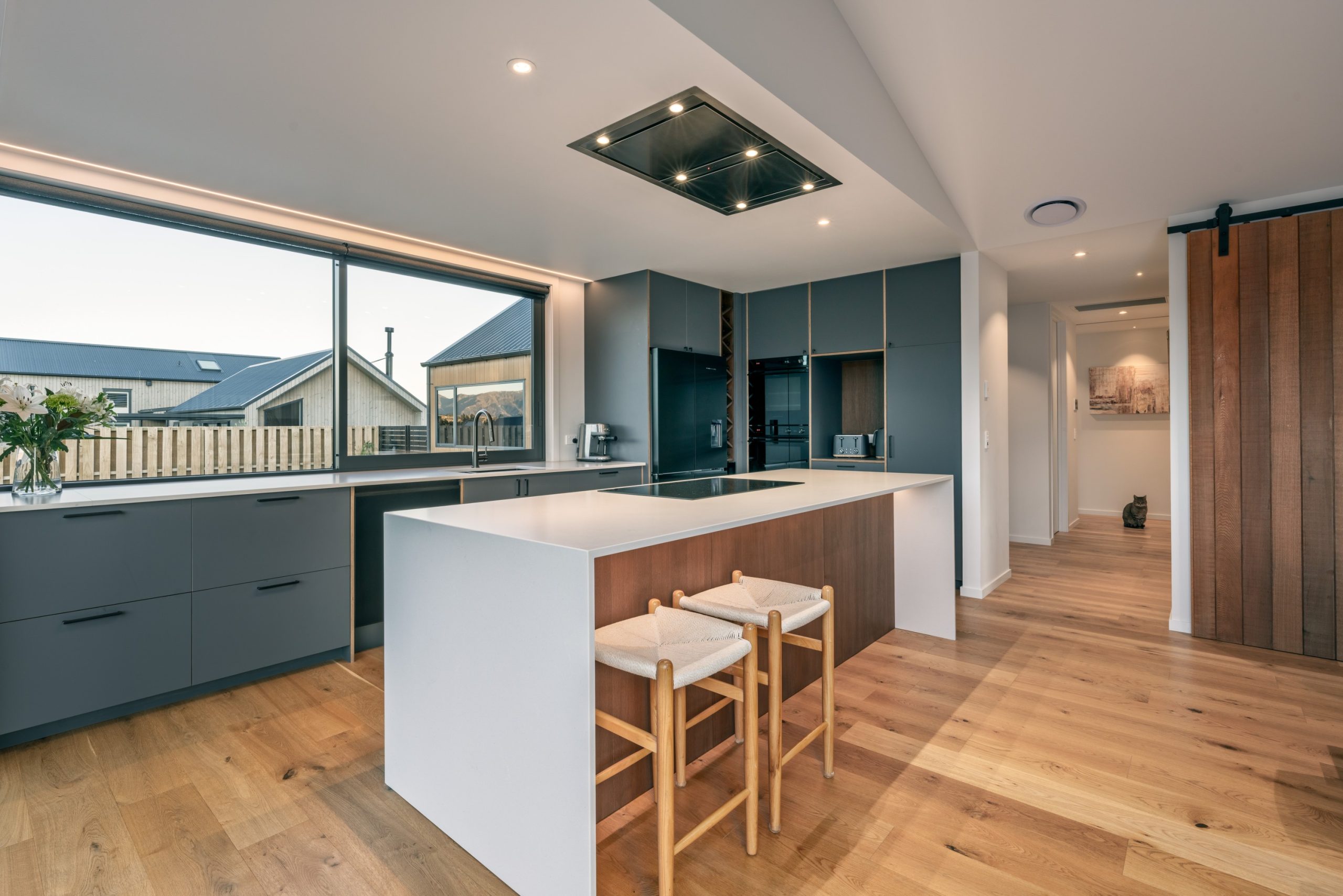 The open-plan kitchen, dining, and living area is designed for entertaining. Jeremy says the floor plan was the heart of the design. “It’s not a huge house, but for the number of usable spaces it contains, it feels quite nice and open. We implemented larger windows to capture specific views and open up spaces more.”