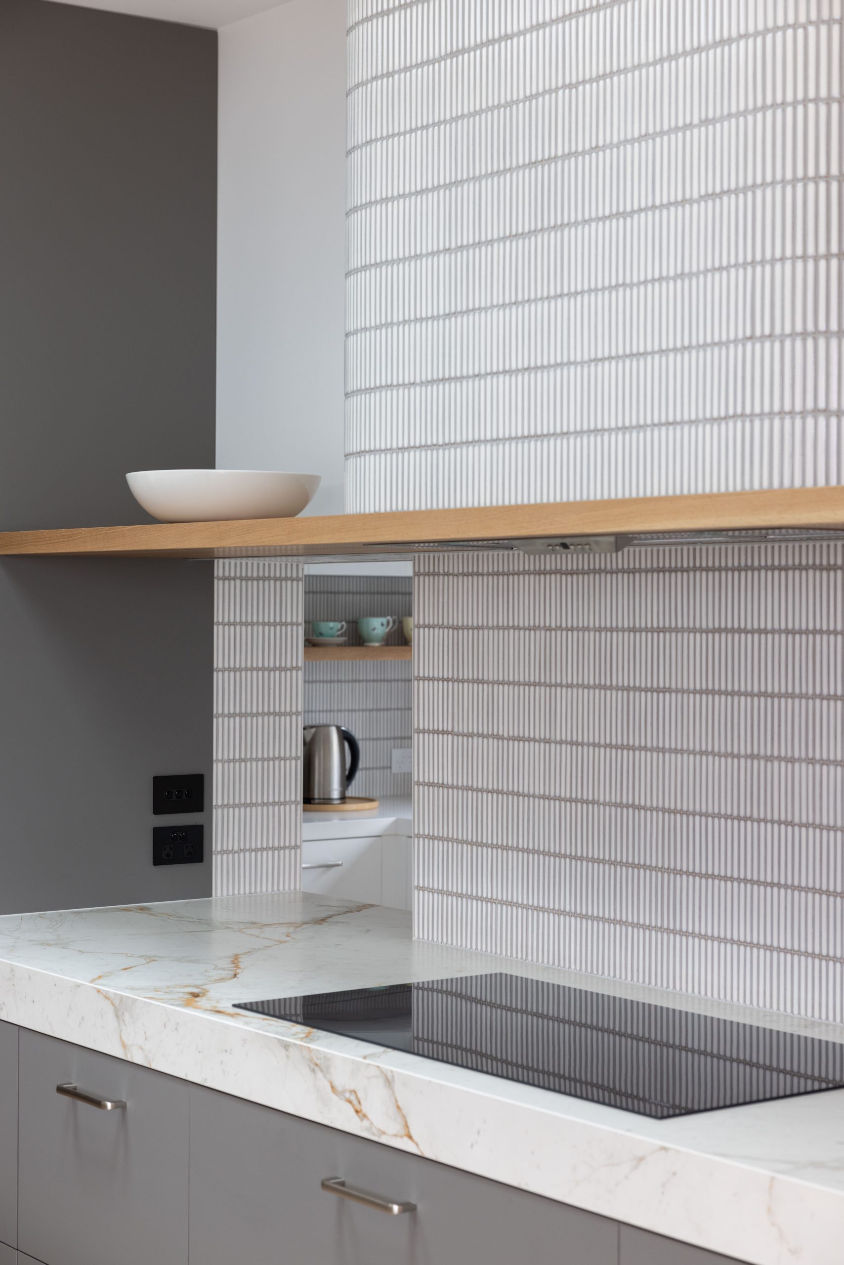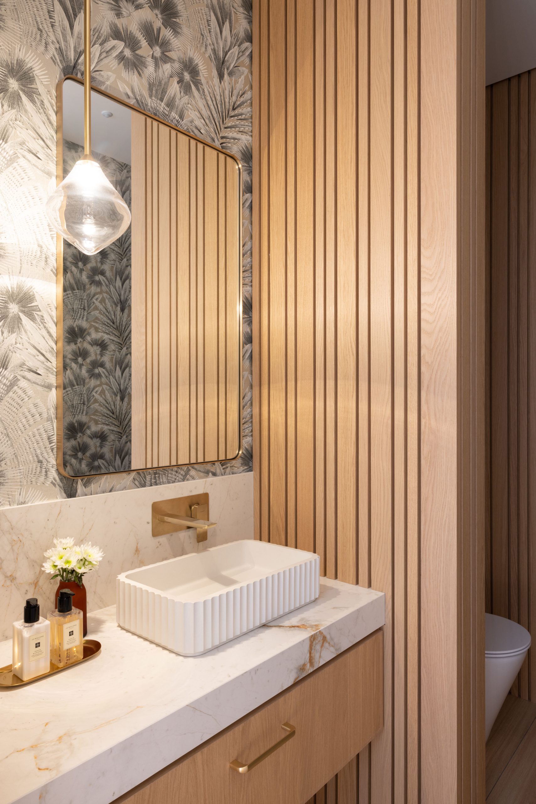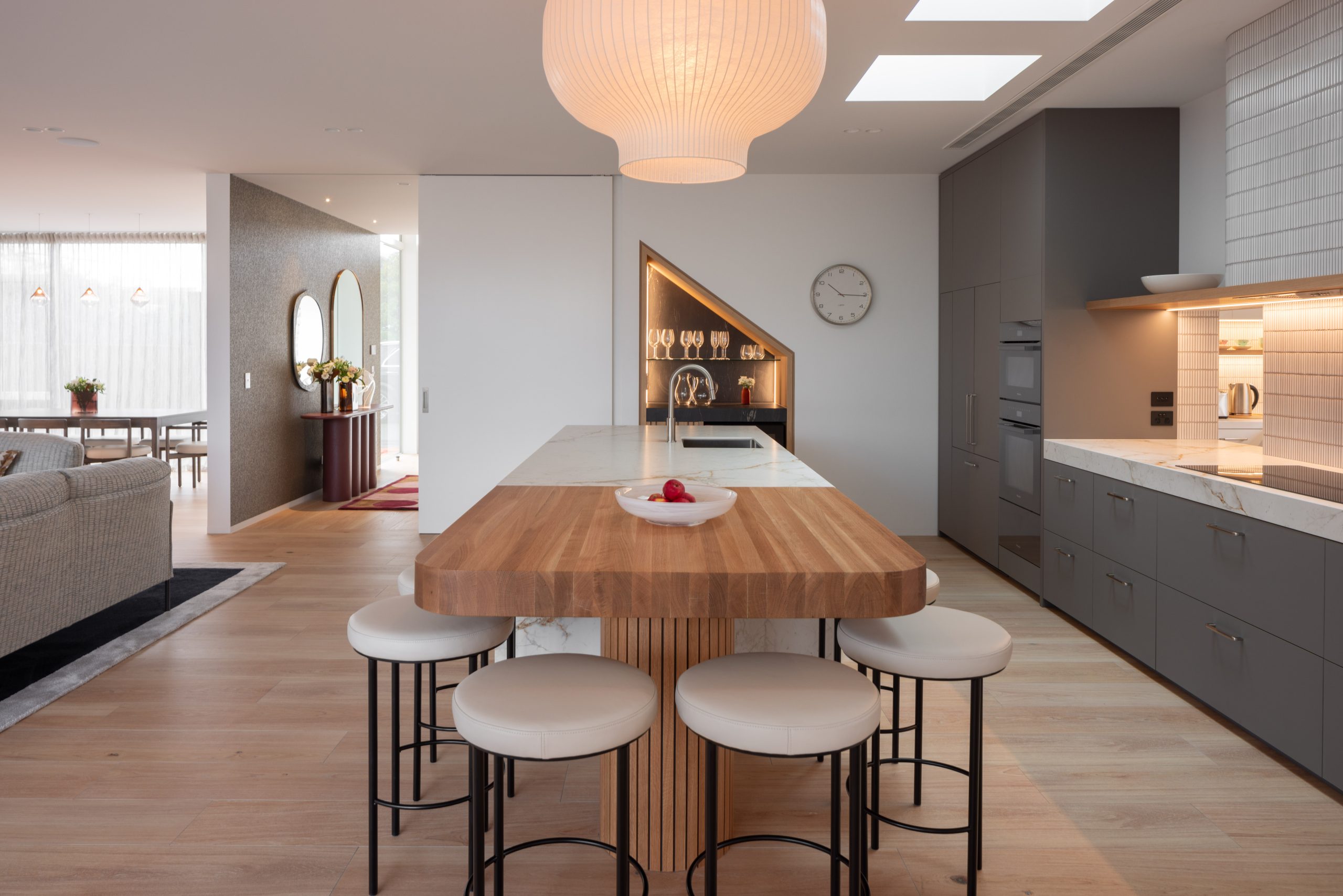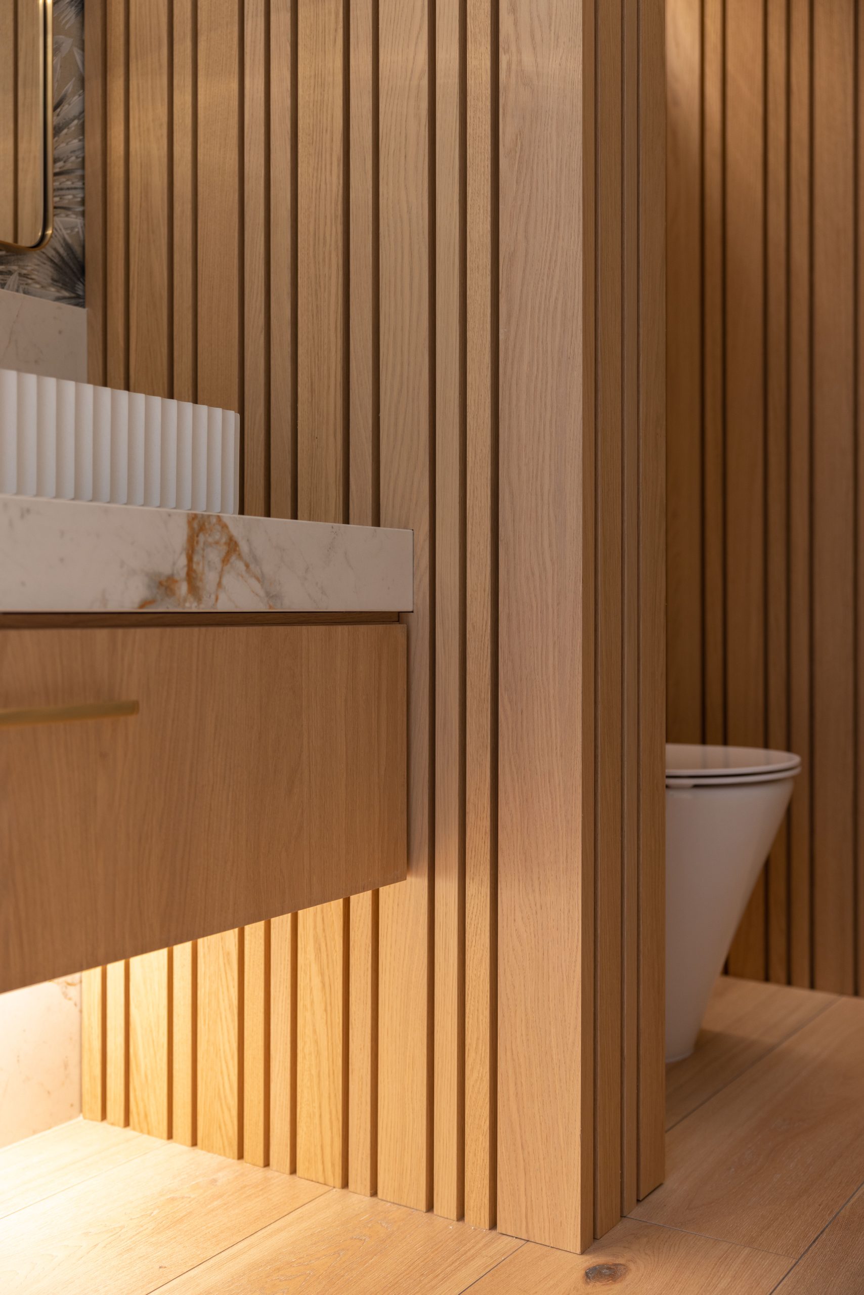 Within the entry hall space into Gordon’s office a hidden entry door was concealed into the timber panelling adding a sense of surprise, while the mix of dark and light timbers throughout the home brings everything together. Joinery fluted finishes, and thoughtful LED lighting added.