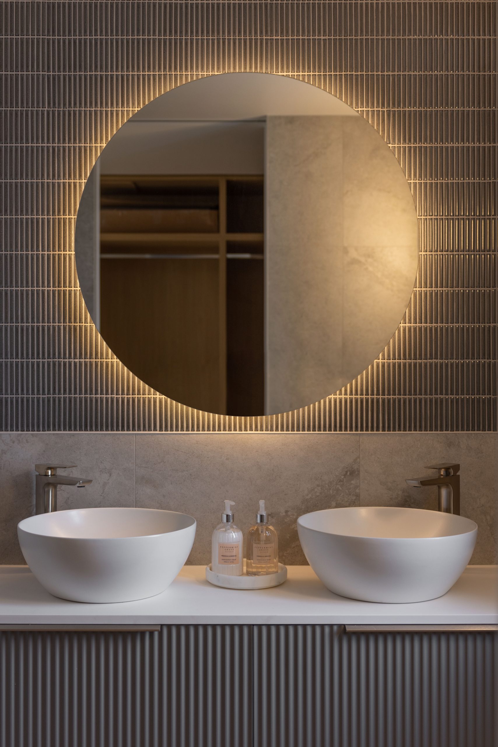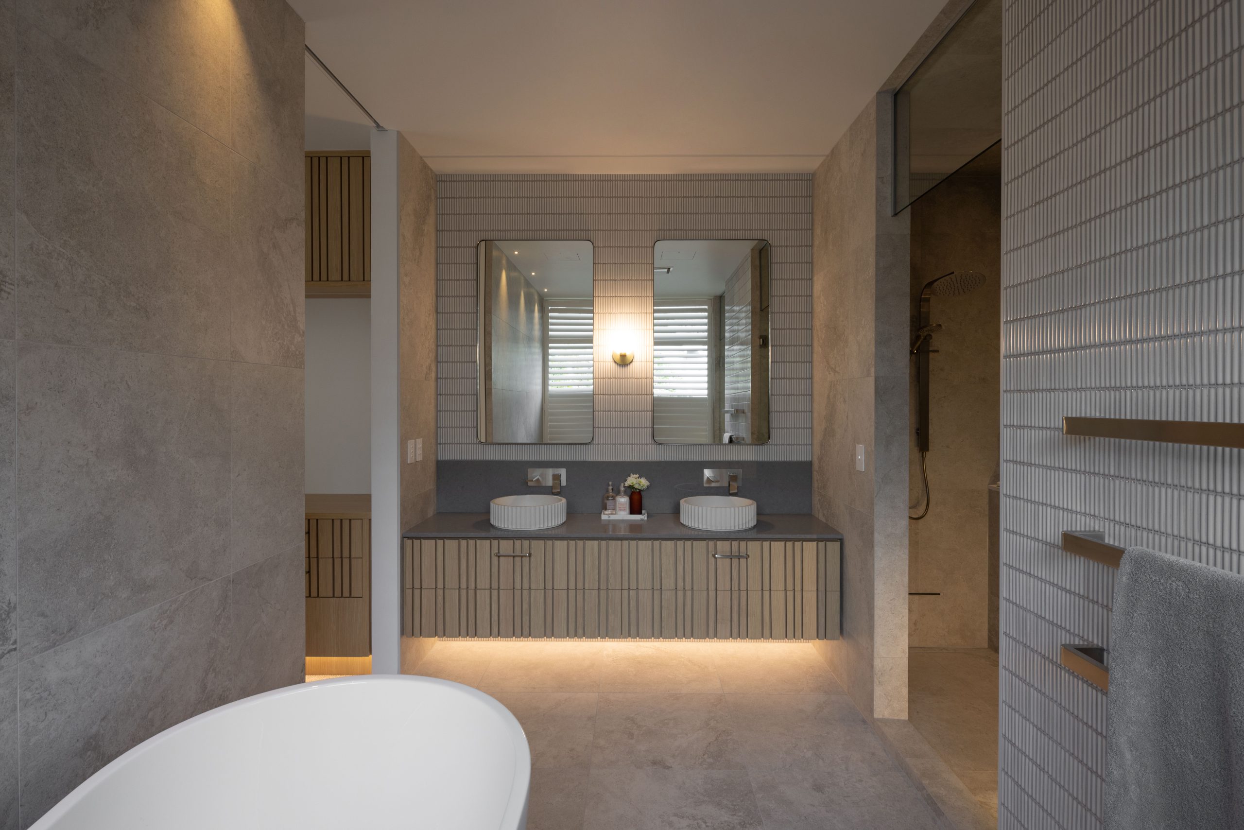 In the bathrooms, a sense of calm was key. Tiles were carefully chosen for their durability and style, and each space features custom vanities and luxurious fixtures like rainfall showers and freestanding baths. Soft lighting and elegant mirrors complete the look, making these spaces feel like a retreat.