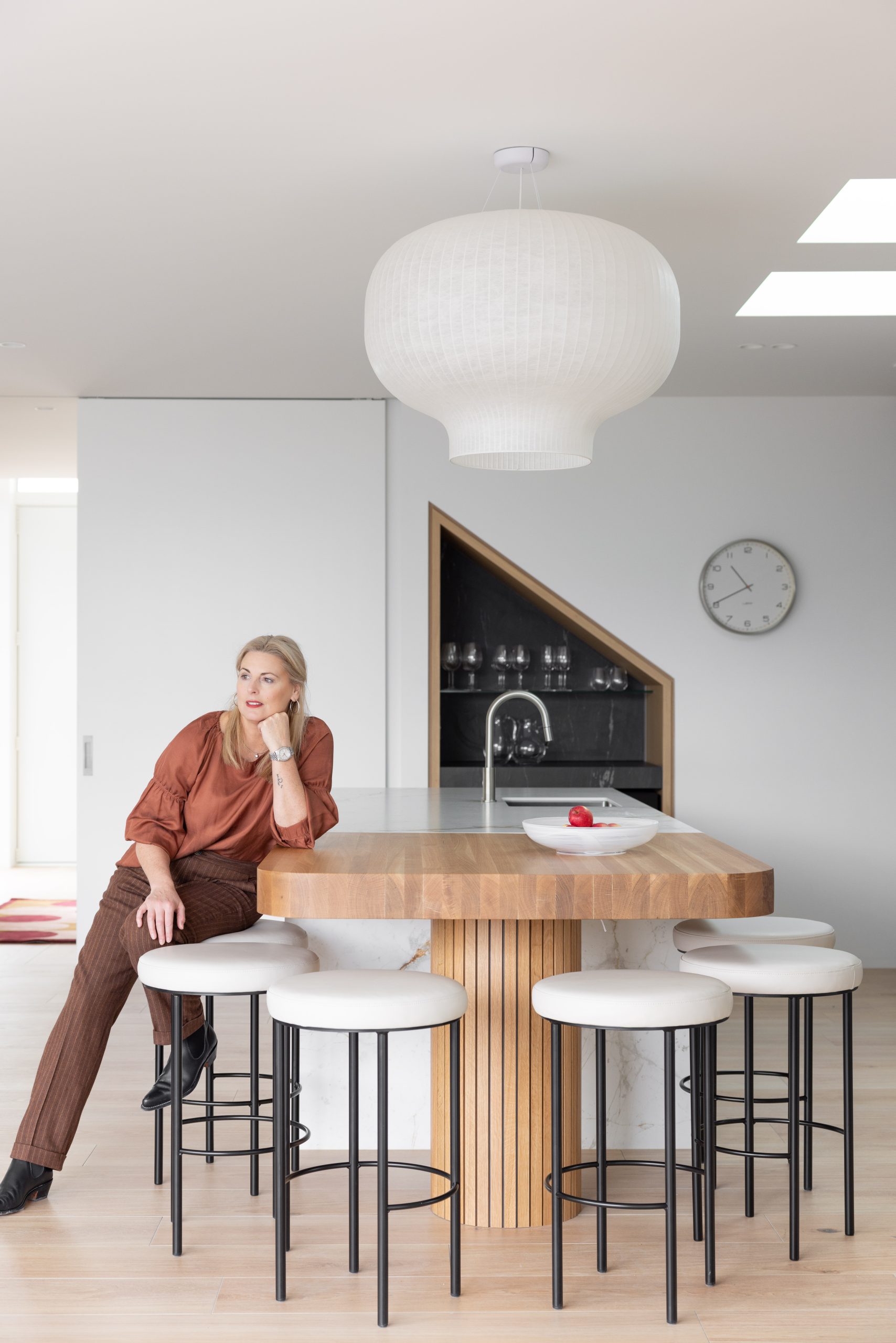 Angelique took this brief to create different feelings from room to room with a cohesive flow. This is achieved by using different aesthetic and feelings within. For example the formal living area, is a cosy oasis of luxurious fabrics and sparkle, ” The kitchen is a clean crisp design using opposite colours of the colour wheel and adding a curved solid timber island sitting area.