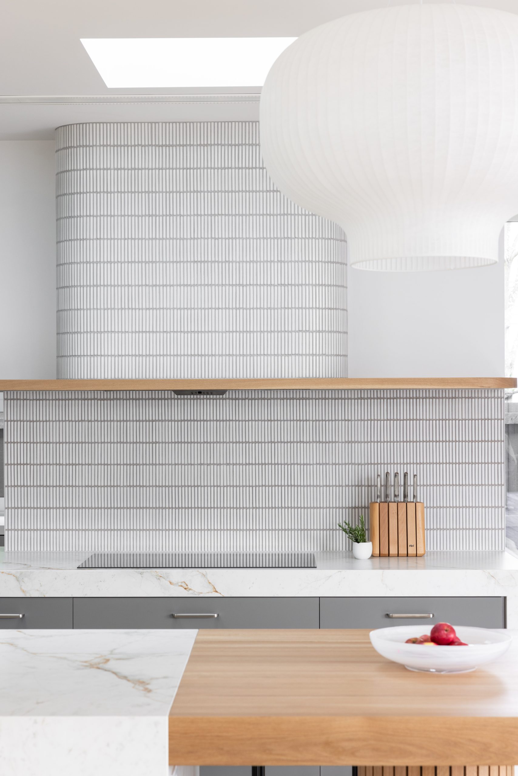 The kitchen is the heart of this home, designed to be beautiful and functional. Custom cabinetry maximises storage while maintaining clean lines, and the textured tile splashback adds character. Above the island, statement lighting enhances the design while being practical for everyday use.