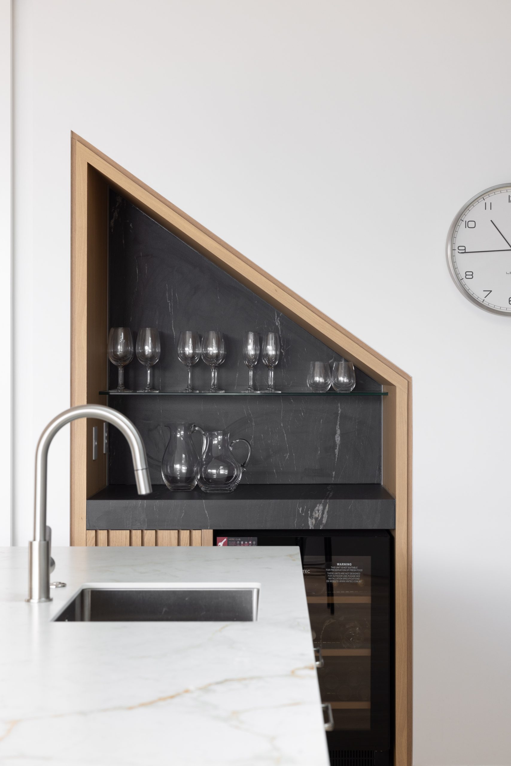 This home has plenty of unique features that reflect the homeowners’ personalities. A servery window between the kitchen and scullery is perfect for Karen’s love of baking, making it easy to pass through hot trays. Meanwhile, Gordon’s idea of a stylish mini bar tucked beneath the stairs adds a fun and functional element, stone finishers.