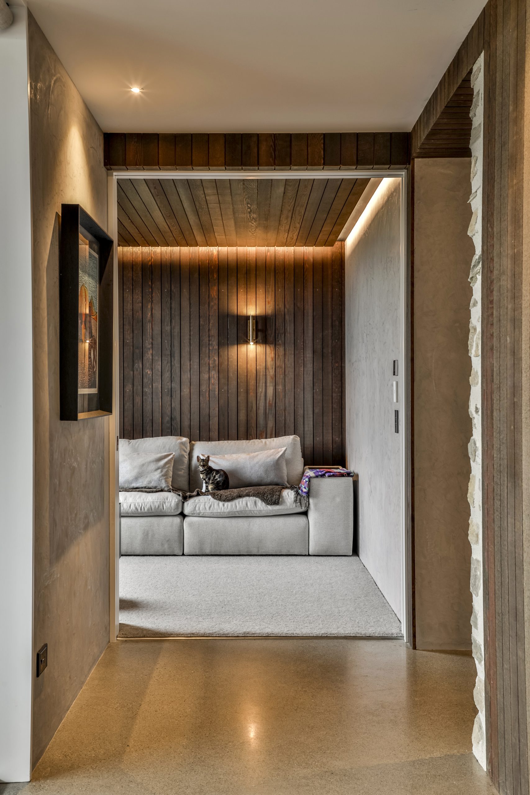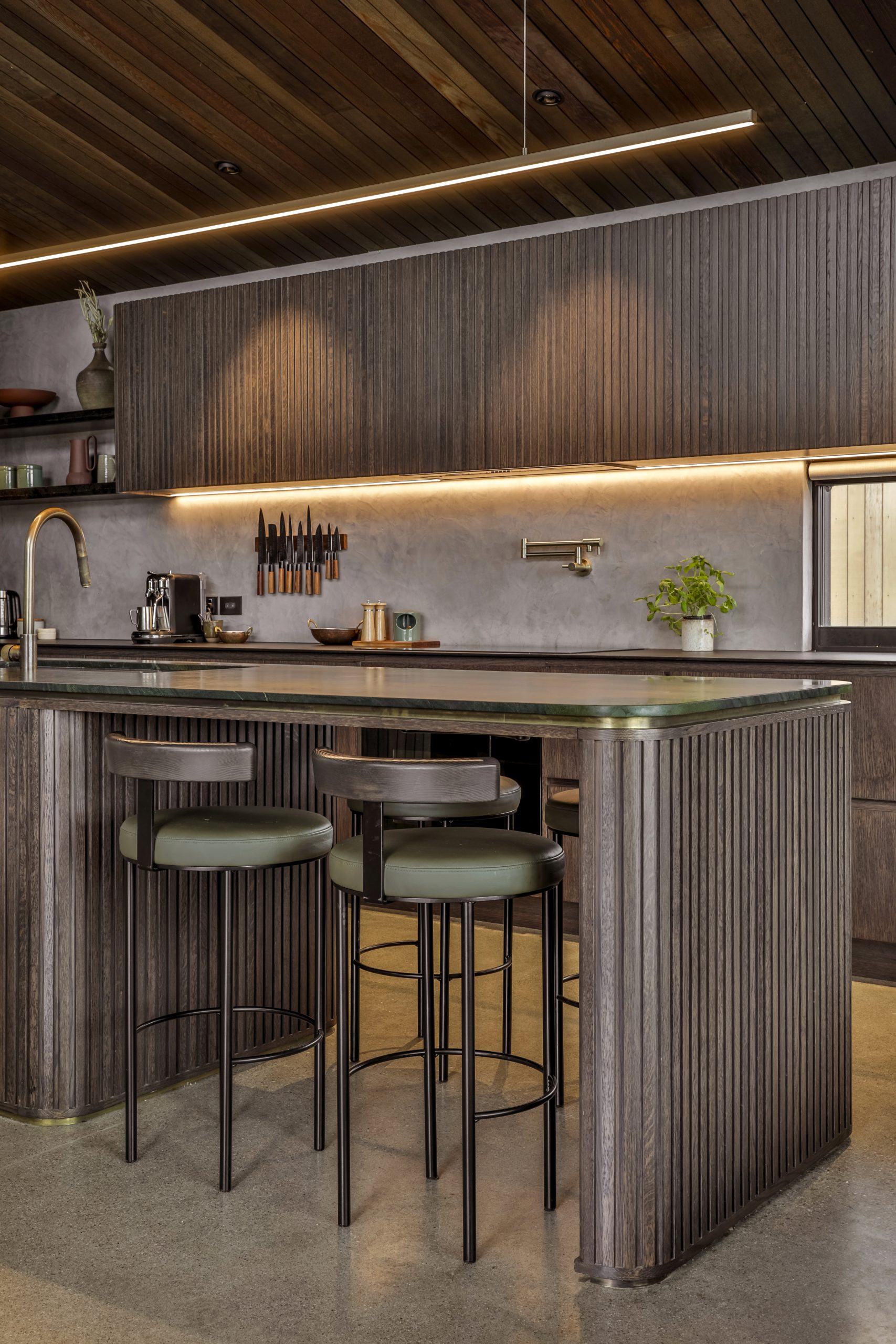 Threefold Architecture and Bagley Construction ensured environmental sustainability was weaved through the home, a key factor during the collaboration. Examples of this include the hydronic in-slab heating and ducted central heating to bedroom areas, both powered by heat pump, high levels of insulation, and thermally broken window joinery with high performance glazing.