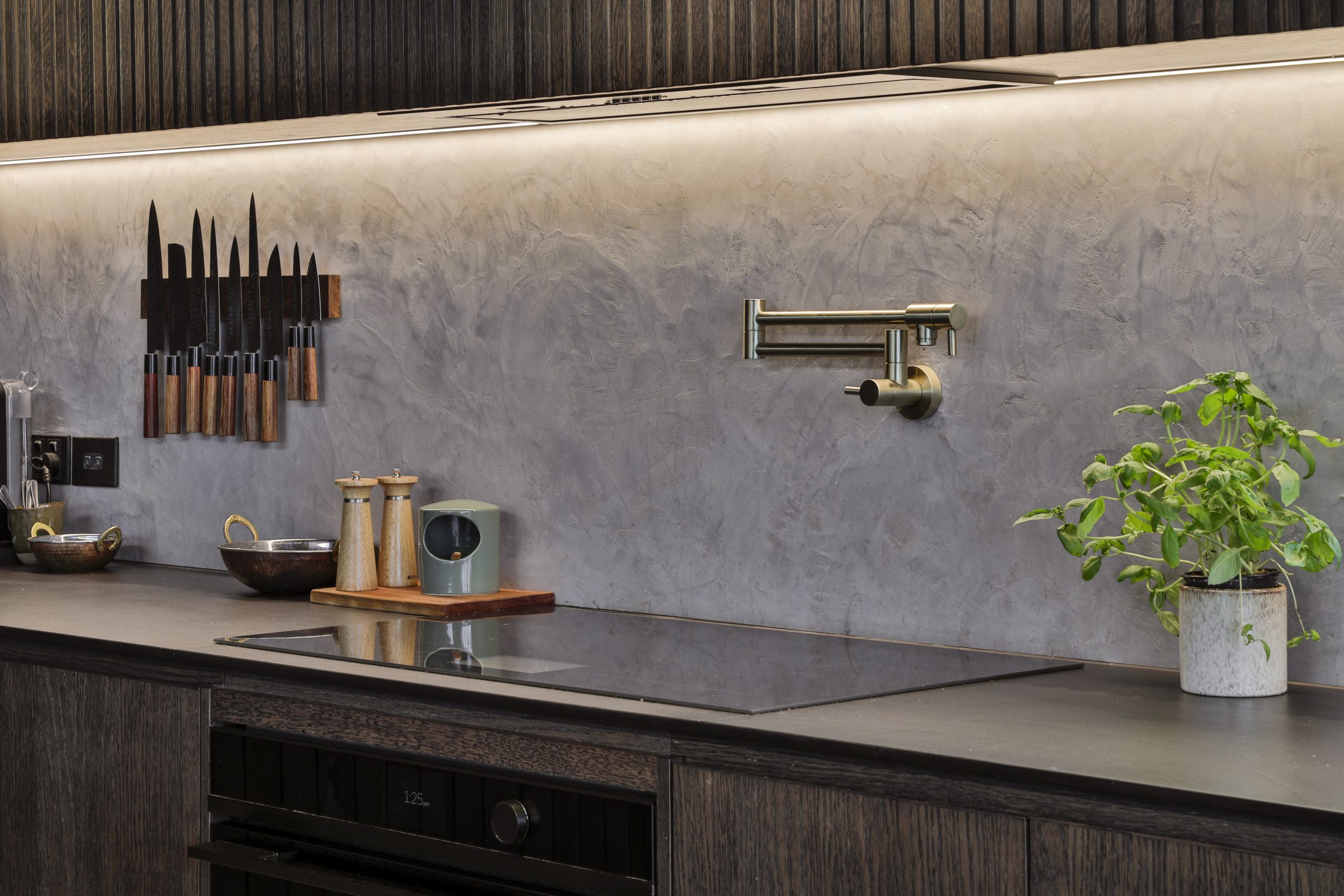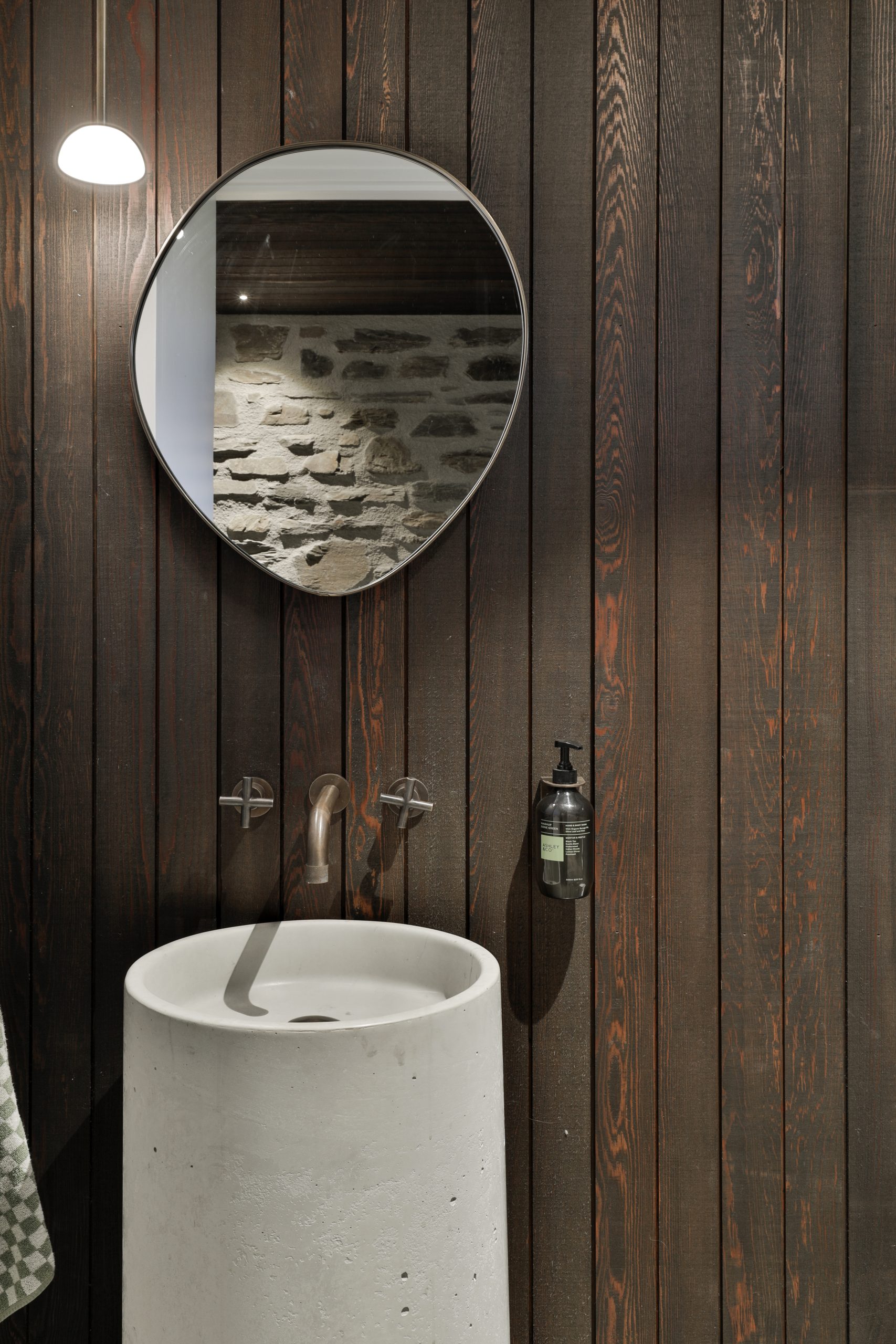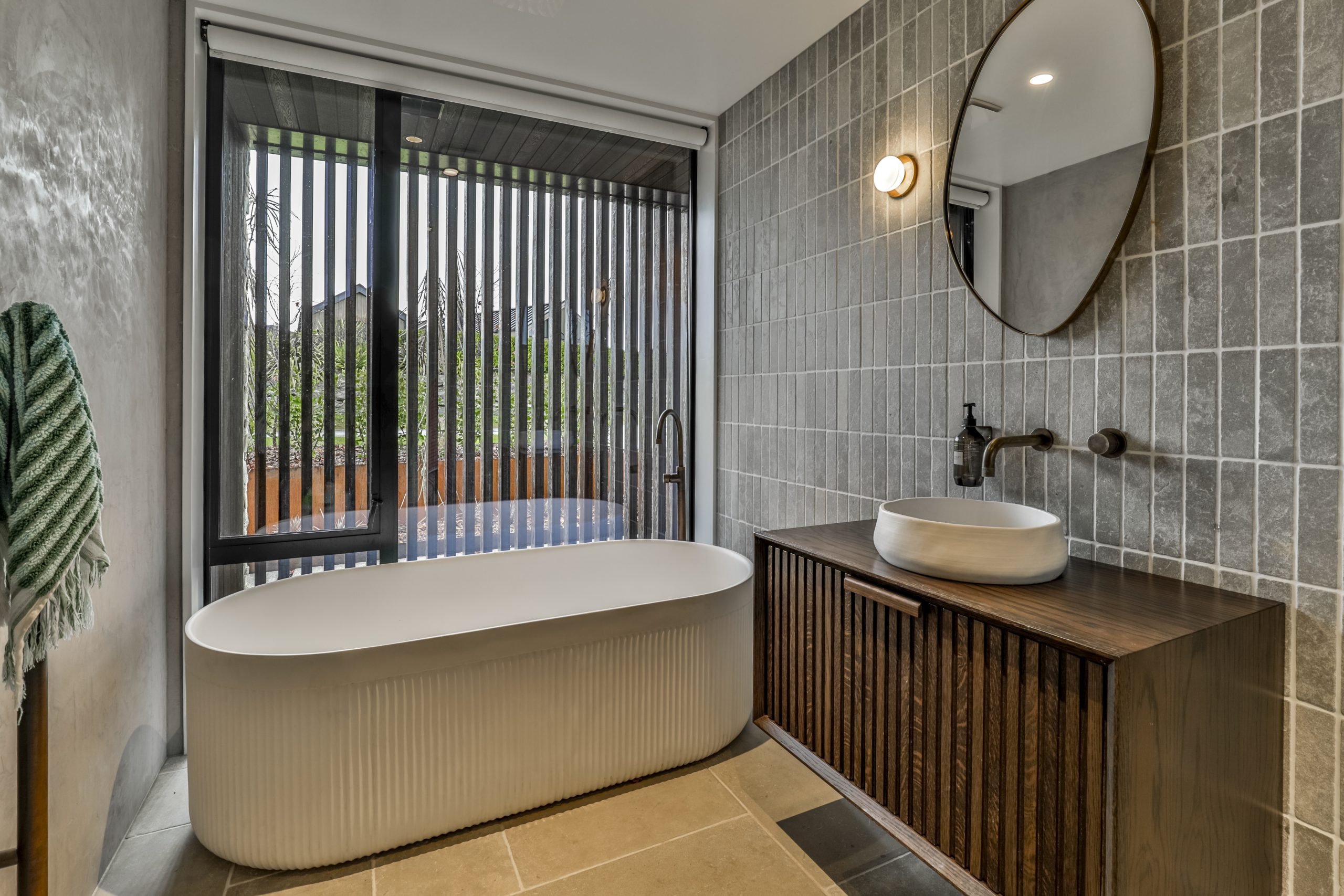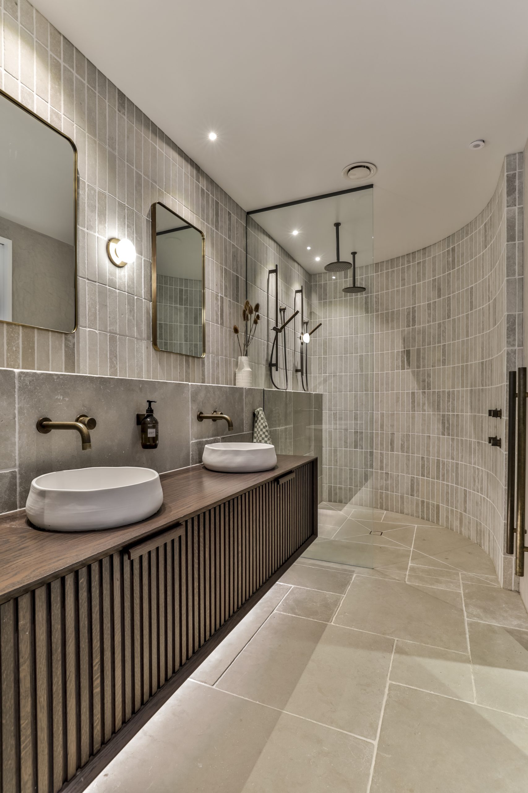 Textured wall finishes add another tactile dimension to the home’s presentation. The curved shower walls and travertine tiles soften the masculine interior, creating a calm oasis while maintaining the natural colour palette that runs throughout the home.