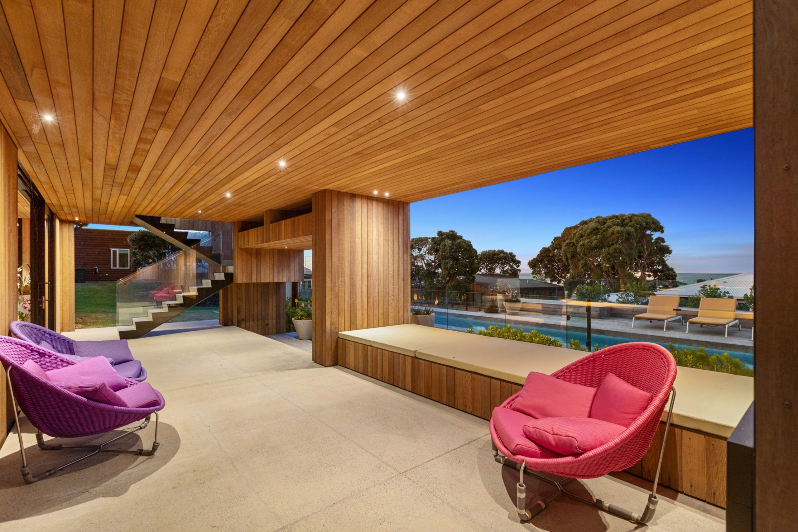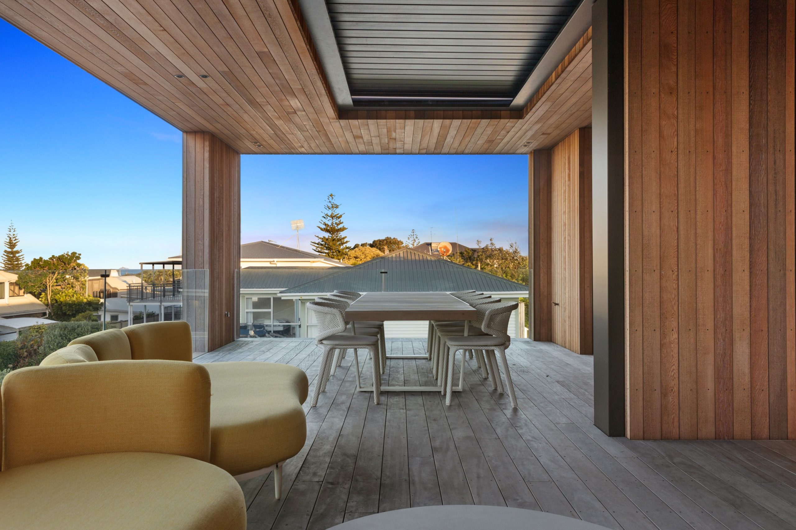 Courtesy of LouvreTec, this motorised Slimline opening roof is a classy final touch to a dreamy large deck space. With aluminium anodised in dark bronze, this smart touch continues the metallic story that runs throughout the home.