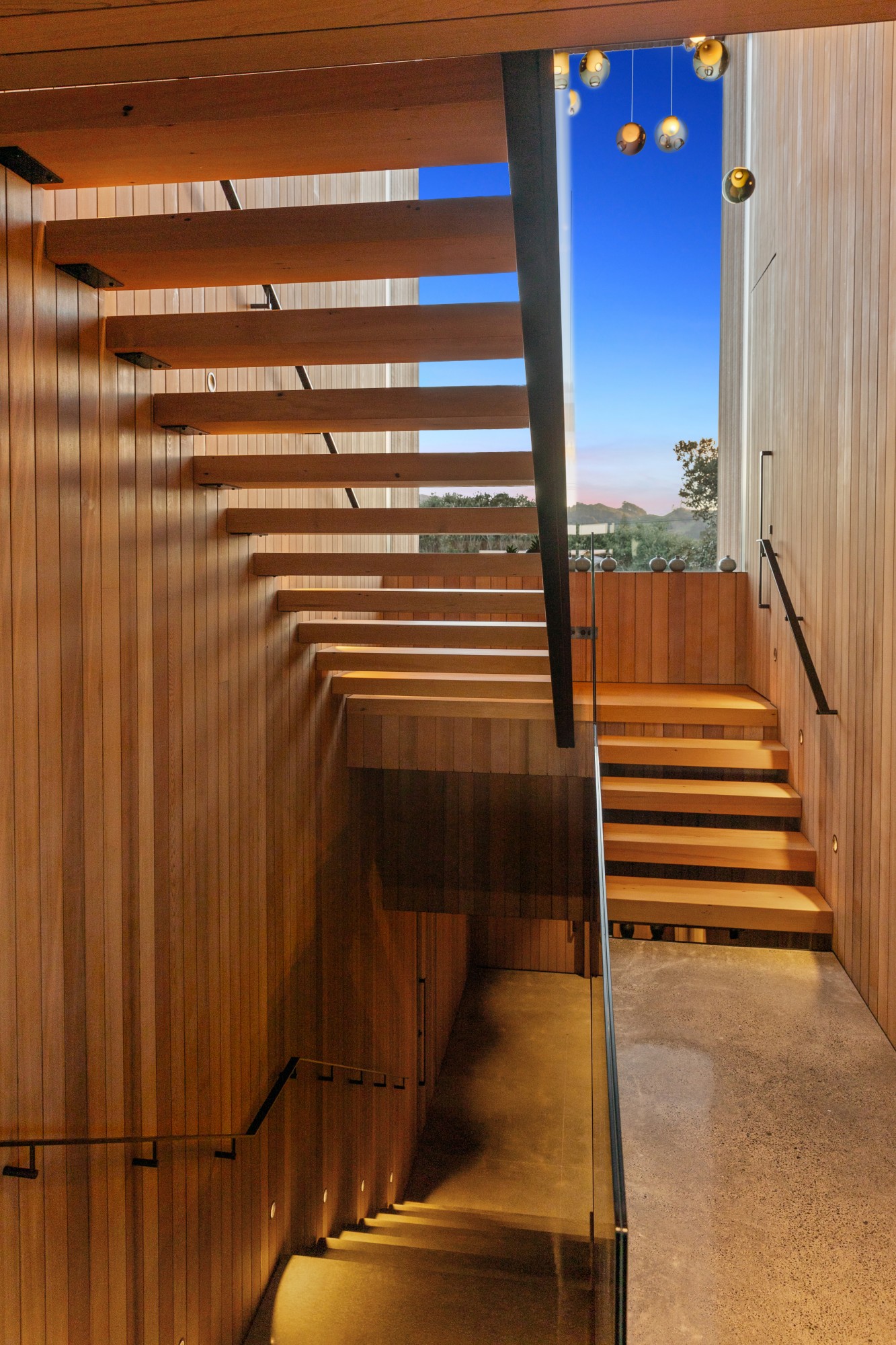 When it comes to the dramatic staircase that anchors the property’s northeast, uncomplicated exposed concrete allows the through-line cedar from RK Timbers and recycled kauri from Mainframe Flooring to shine. Contrasting textures prove a match made in design heaven.