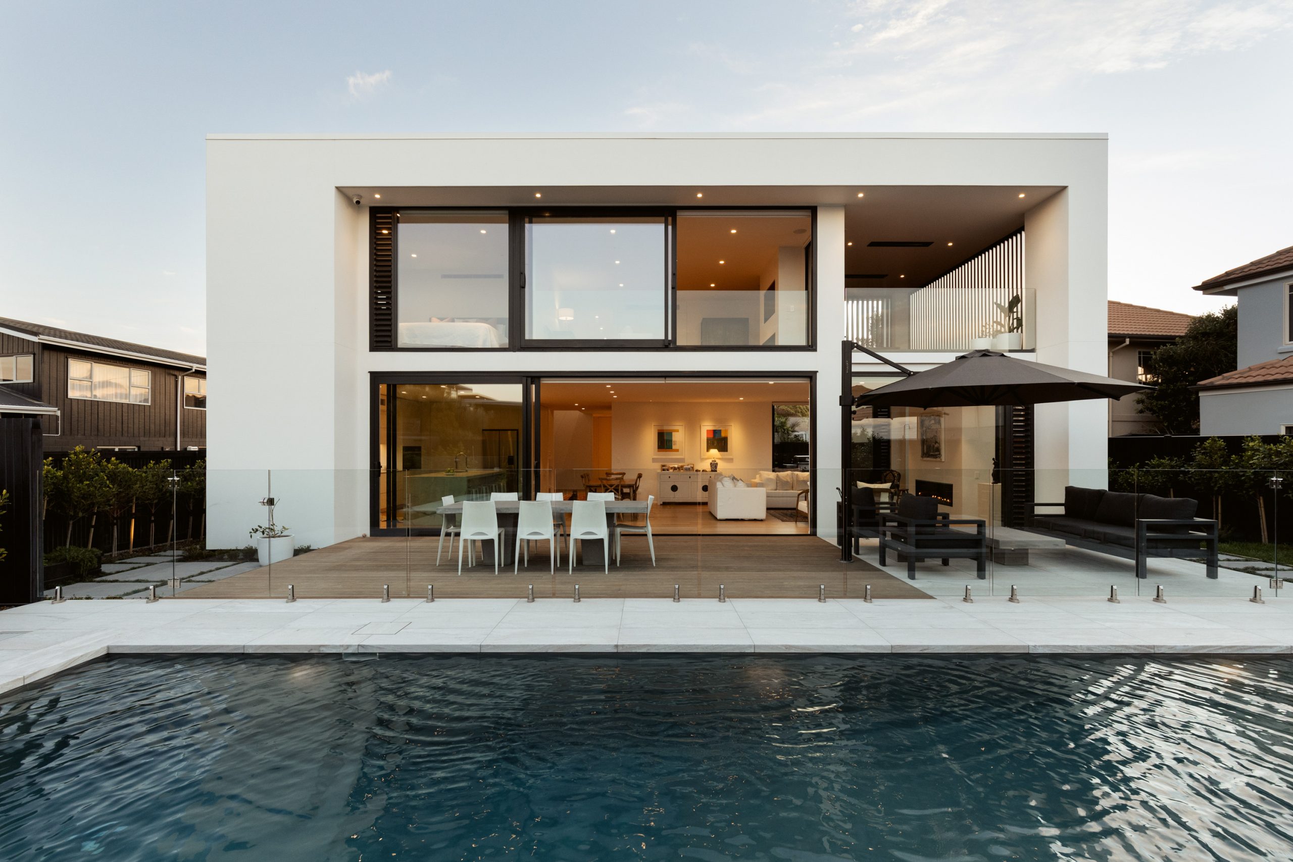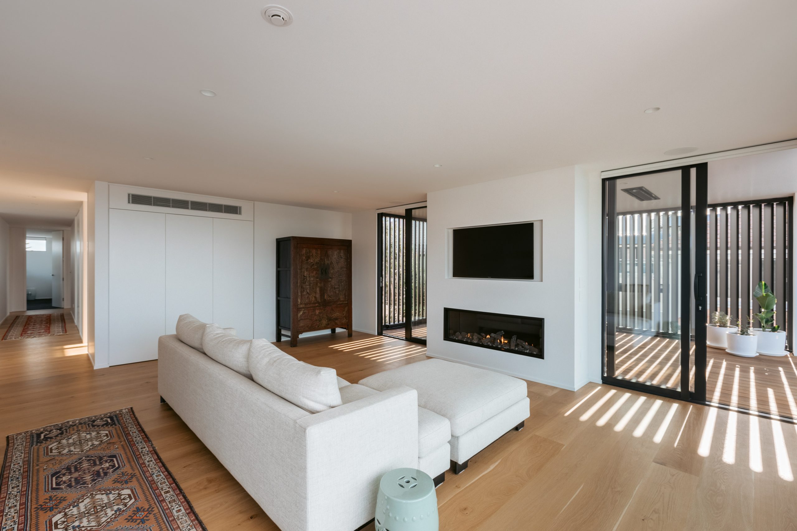 The minimalist and almost all-white materiality of the exterior is softened with cedar cladding. This neutral warmth is featured inside in the form of Hurfords timber flooring. The minimalist inspiration continues throughout the interiors with white washed walls expressing the pared-back simplicity of the design. The doors are floor to ceiling in height to maximise the sense of space and light, upholding the minimalist aesthetic without any architraves or skirtings to break the clean lines.