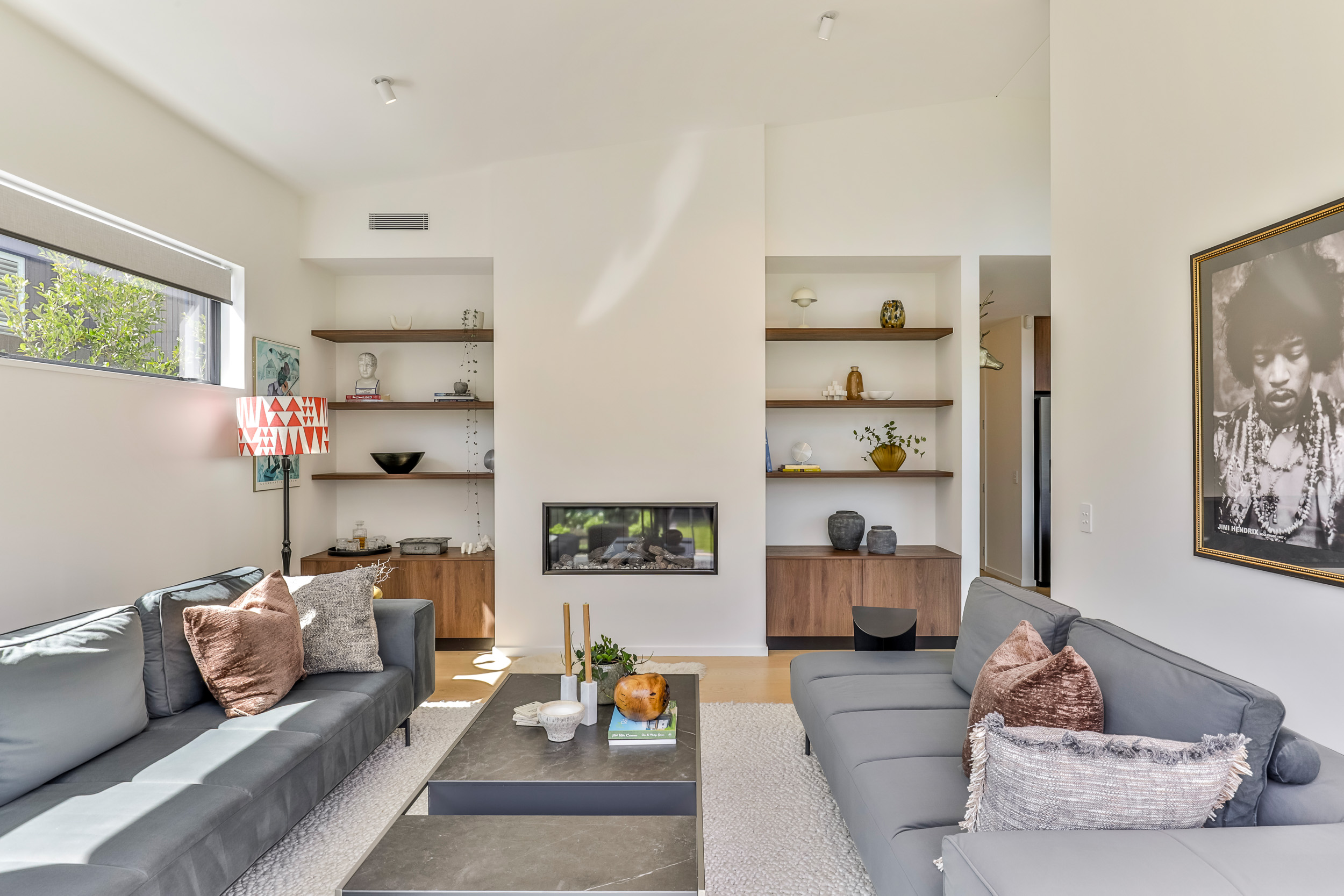 The ability to close off the TV room with a double cavity sliding door adds another layer of flexibility,” says Jeremy. The home uses a fully ducted heat pump system throughout and the gas fireplace is a feature element in the living space with electrical work completed by Axion Electrical.