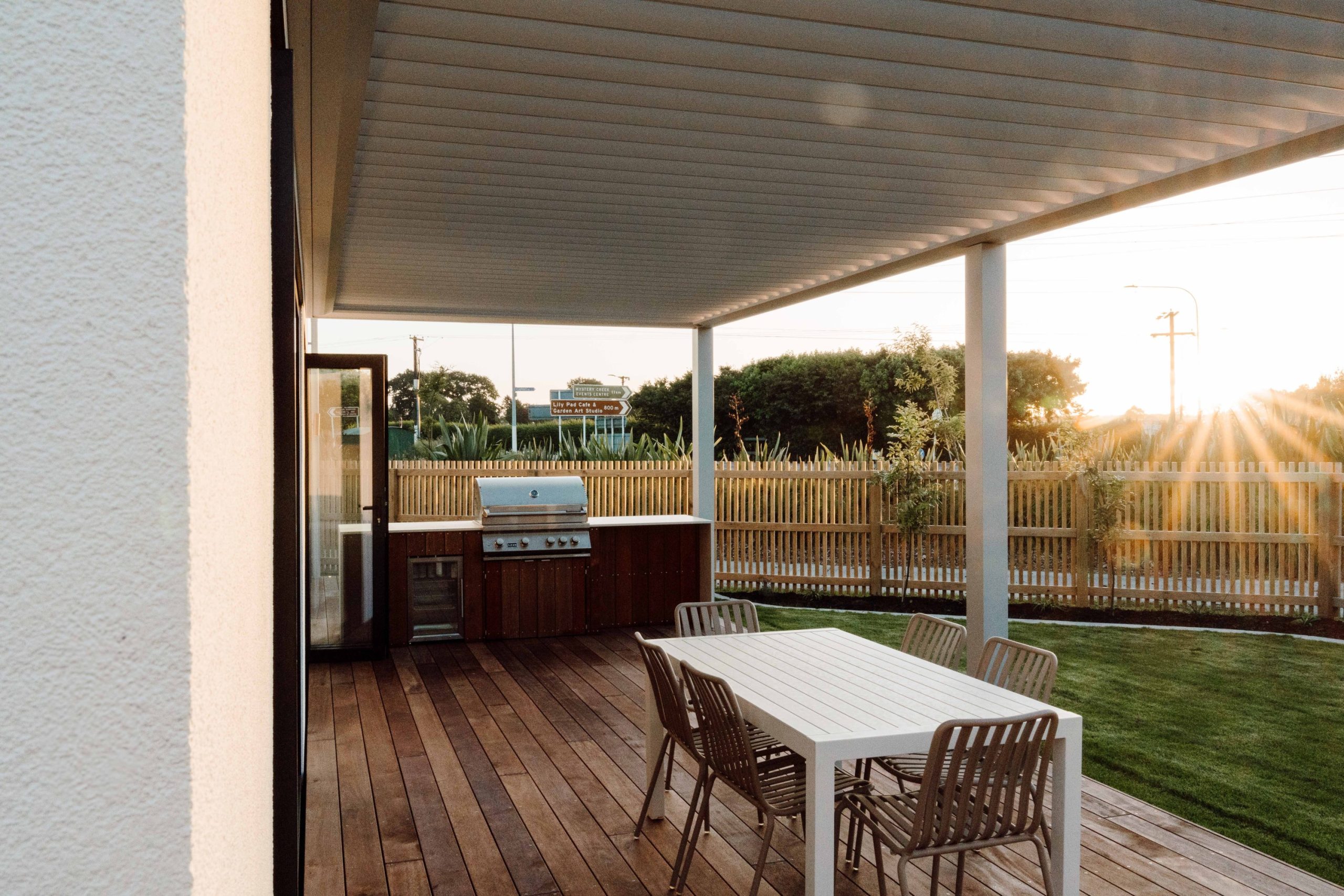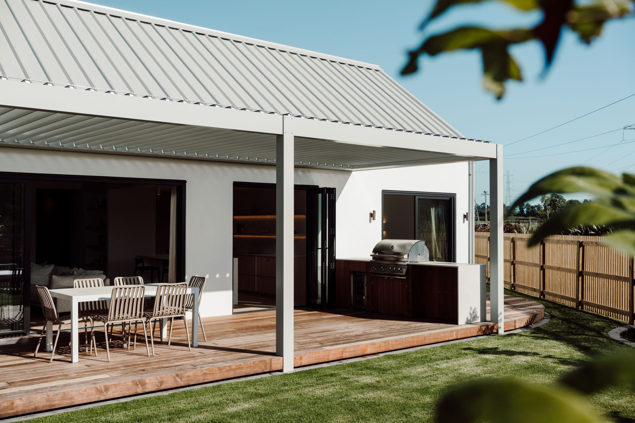 Outside, the indoor-outdoor flow extends onto a spacious deck with a louvre system that adds functional square meterage. “This system is both aesthetic and essential – acting as dynamic shading,” Vanessa says. “In winter, the louvres can be opened to let sunlight warm the home; in summer, they close to block the harsh sun and help maintain indoor comfort.”