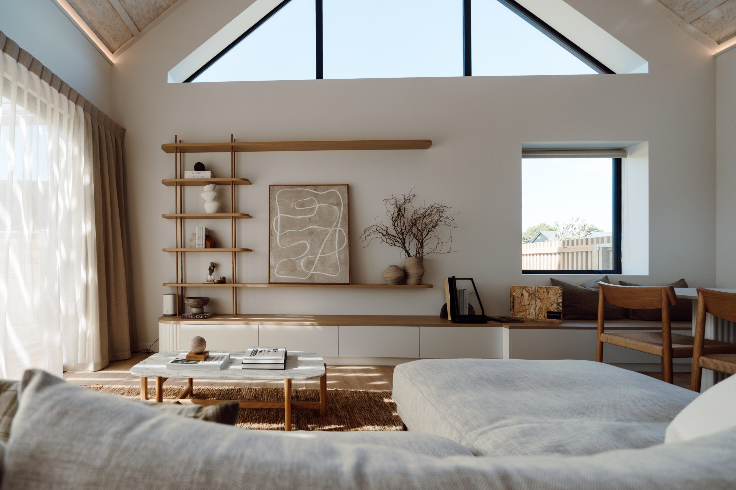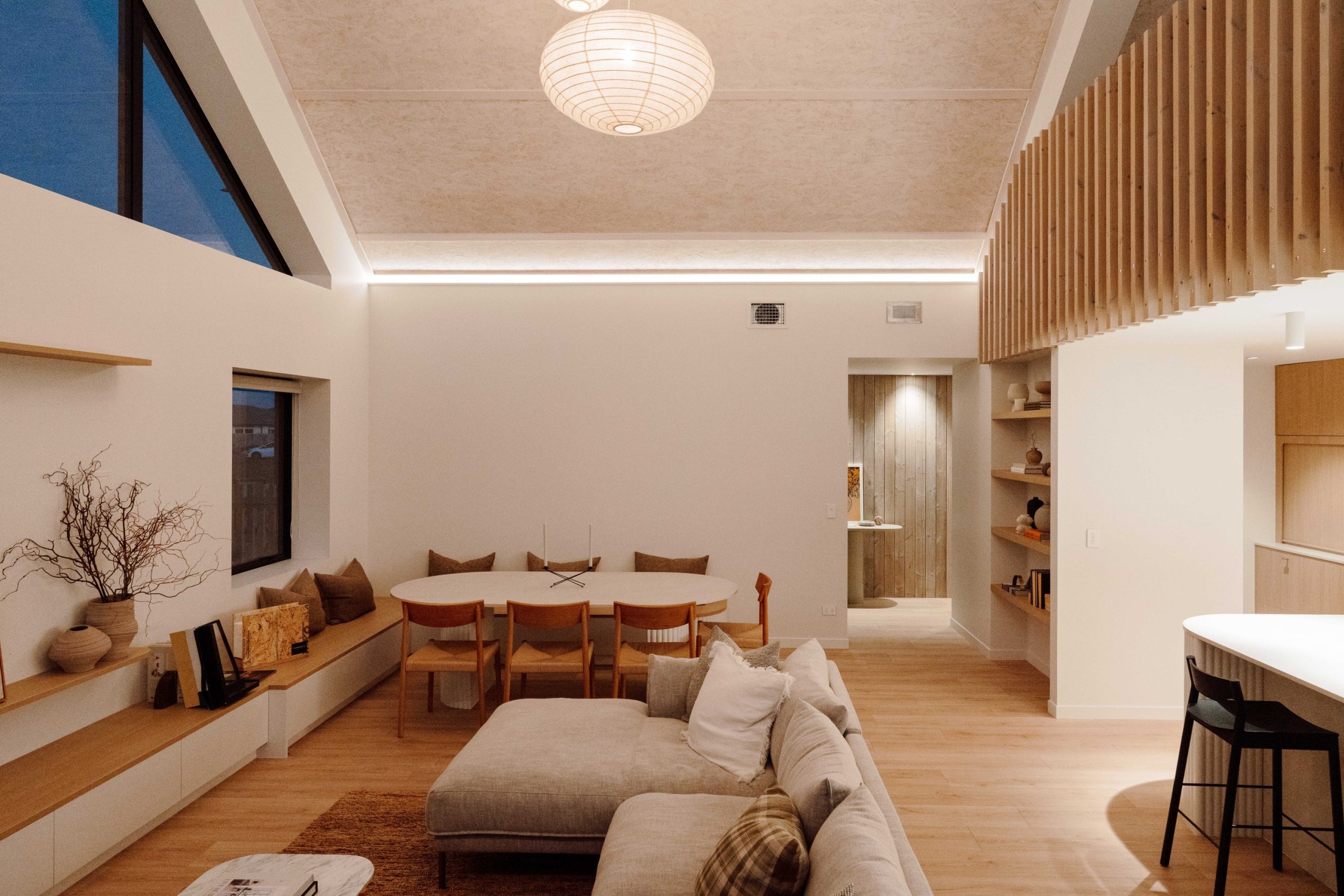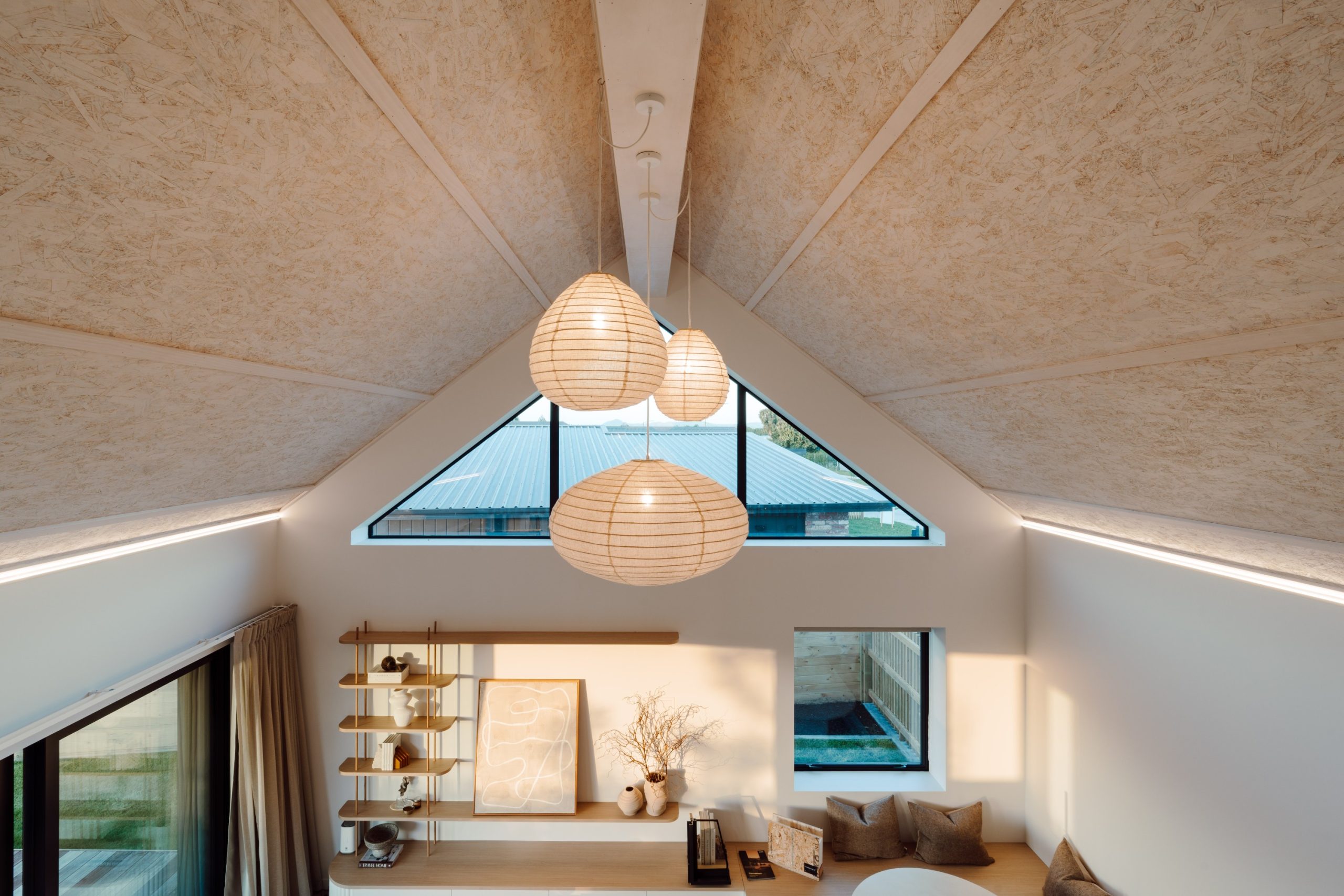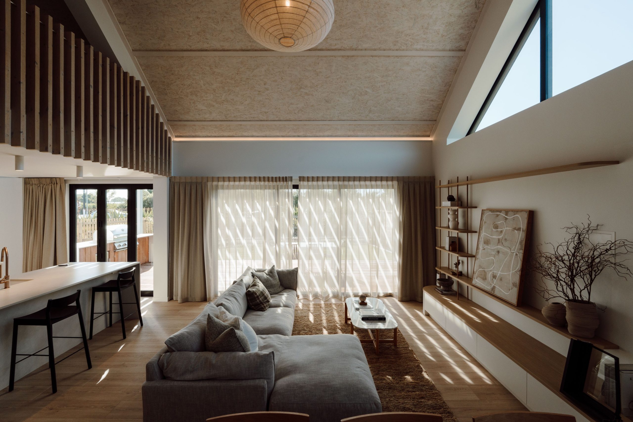 All panel joins had to be sealed with airtight tape, which posed a vital issue if left uncovered. “To resolve this, we designed a solution that concealed the taped joins using timber battens. These not only hid the necessary sealing but became a defining feature on the ceiling design.” Once coated in Natural Paint Co.’s interior stain in Double Whitewash, the result was a refined, tonal finish that acknowledged the SIPs and showcased that this home was built differently. “SIPs are typically covered up with GIB and hidden from view, but we intentionally left them exposed – not only because we found them beautiful, but because we wanted visitors to see and understand the system behind the home’s performance. It became a true talking point for everyone who walked through.”