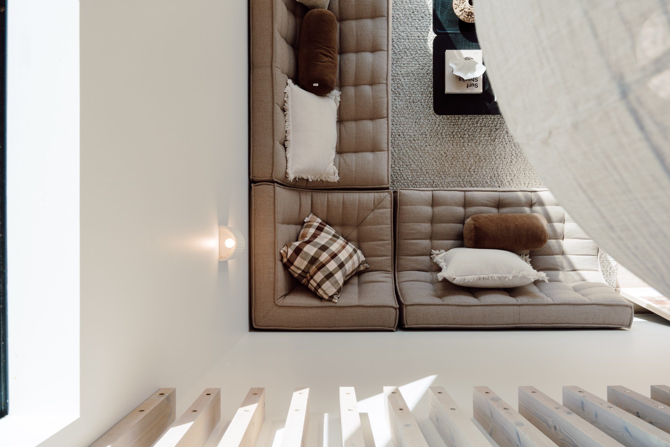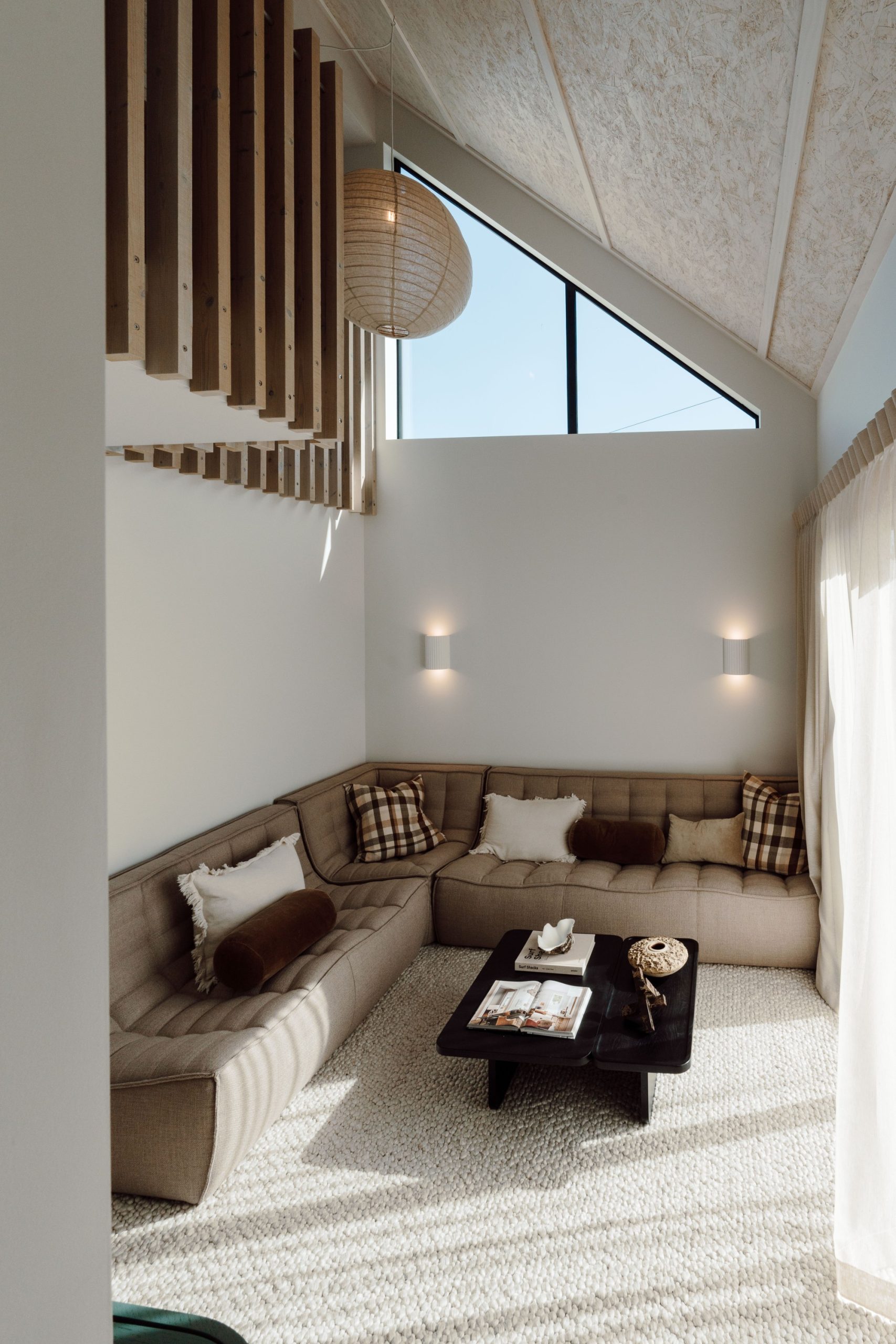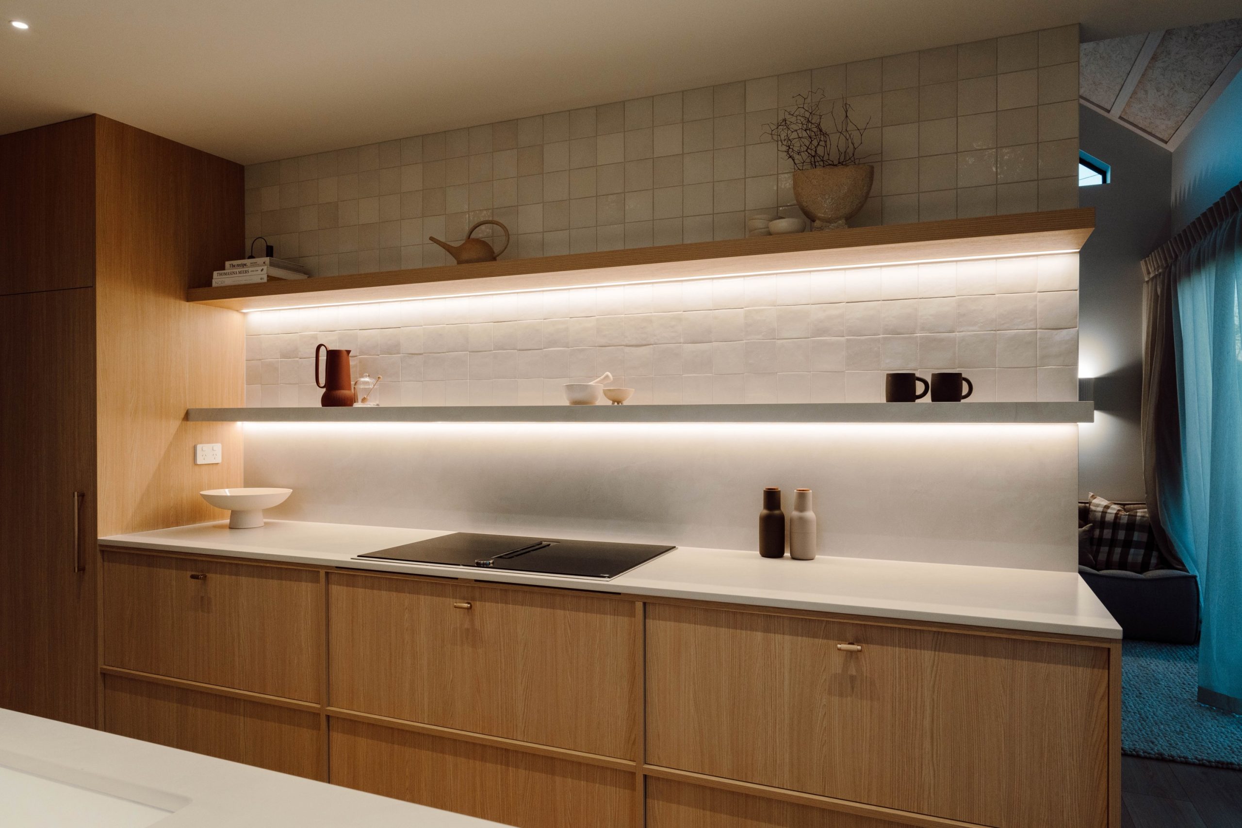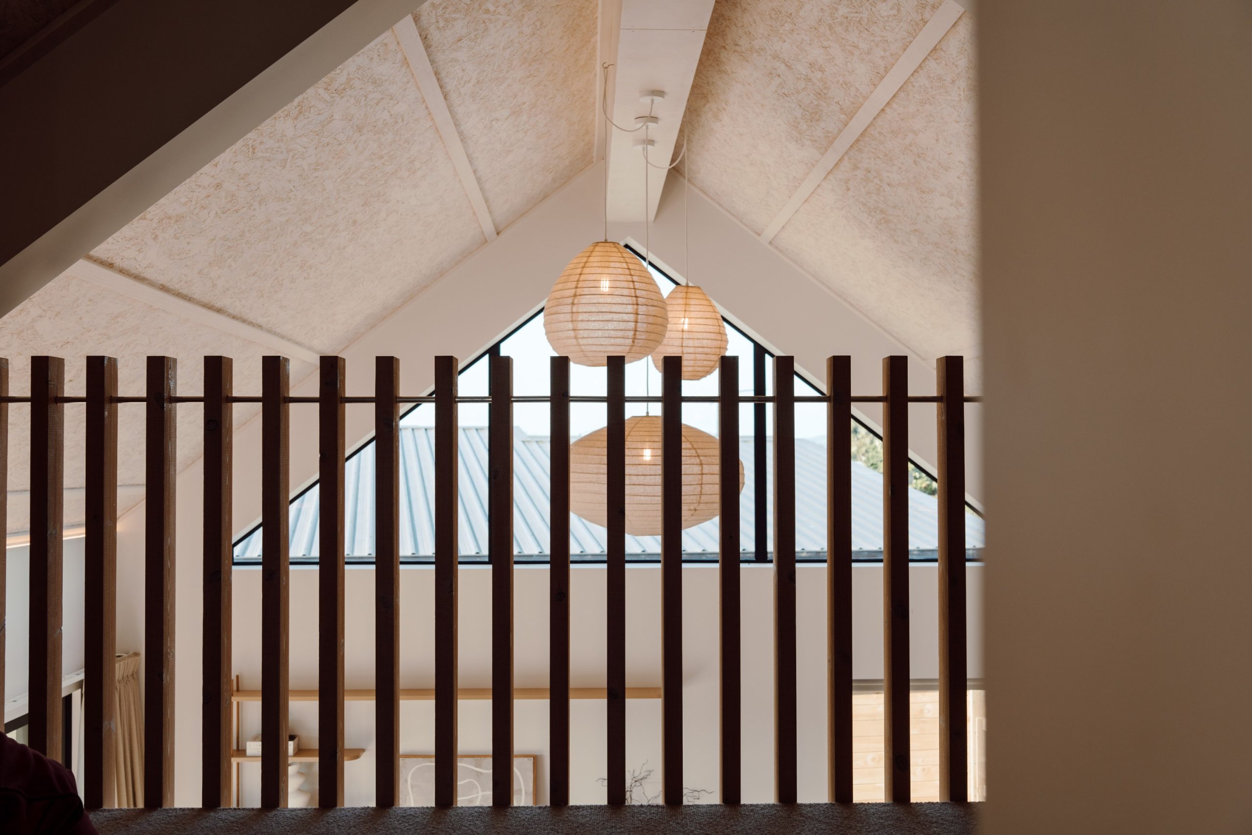 All panel joins had to be sealed with airtight tape, which posed a vital issue if left uncovered. “To resolve this, we designed a solution that concealed the taped joins using timber battens. These not only hid the necessary sealing but became a defining feature on the ceiling design.” Once coated in Natural Paint Co.’s interior stain in Double Whitewash, the result was a refined, tonal finish that acknowledged the SIPs and showcased that this home was built differently. “SIPs are typically covered up with GIB and hidden from view, but we intentionally left them exposed – not only because we found them beautiful, but because we wanted visitors to see and understand the system behind the home’s performance. It became a true talking point for everyone who walked through.”