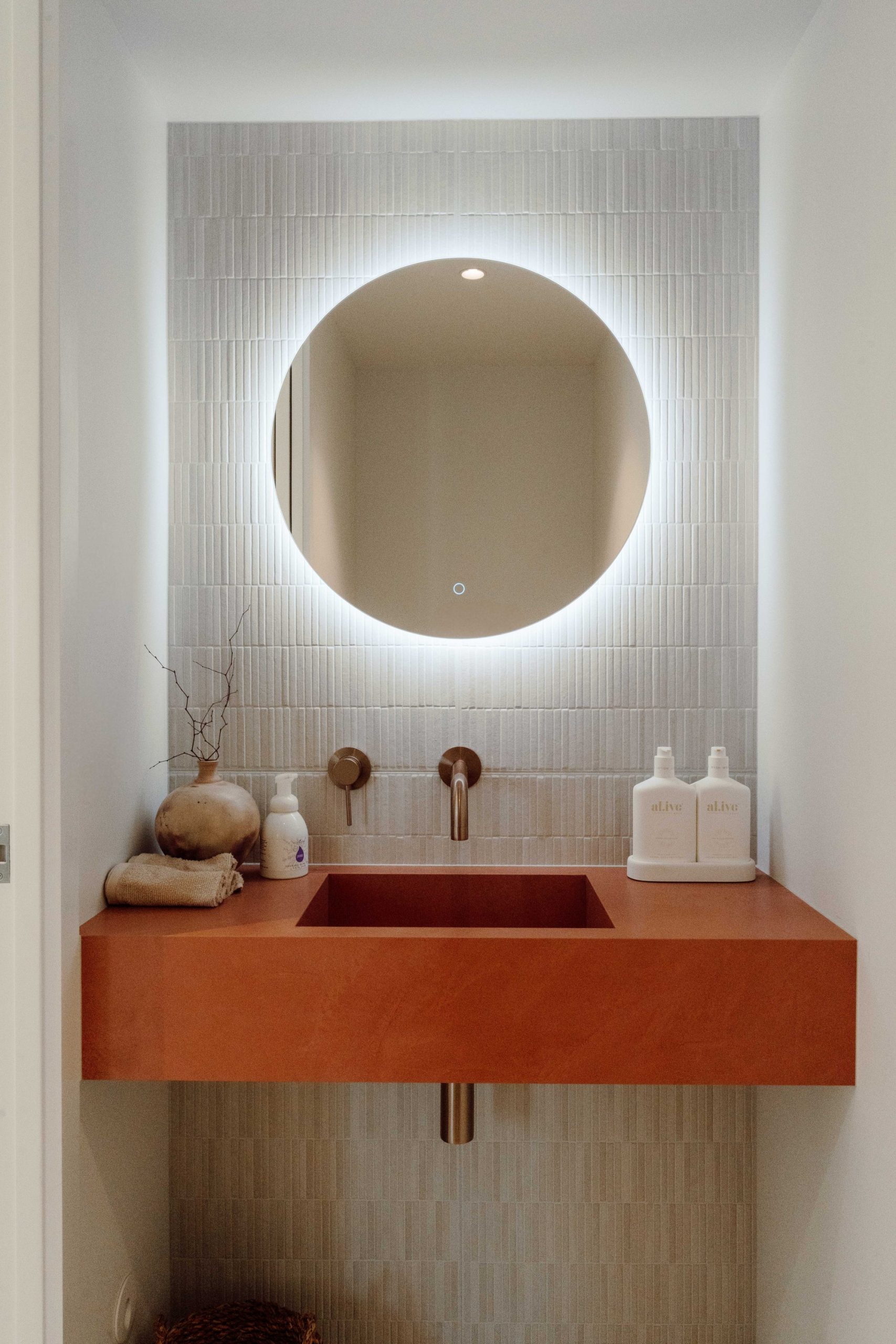 The ensuite features Japanese finger tiles that wrap around a curved shower with a large rain head – a detail that brings both elegance and intimacy. For the main bathroom, Abbie says they wanted to create a room that felt open and bright, but also welcoming and easy to use. “Tawa Architecture’s simple design elements such as half-height walls add interest as well as a functional design element. Small subway tiles stacked vertically gave relief from the larger format terrazzo.” To add more warmth to the space, champagne nickel tapware was chosen rather than brushed nickel. Abbie says that another way to add to the overall design was through lighting, “It is all about creating interest in layers from the tiles, to the fittings, and then the lighting.” A key design element from this project came from the powder room under the stairs. “These are small spaces where you can create design features in. Such as the floating custom vanity basin. Having the powder room under the stairs, as Tawa Architecture has created, is a great way to utilise the space.”