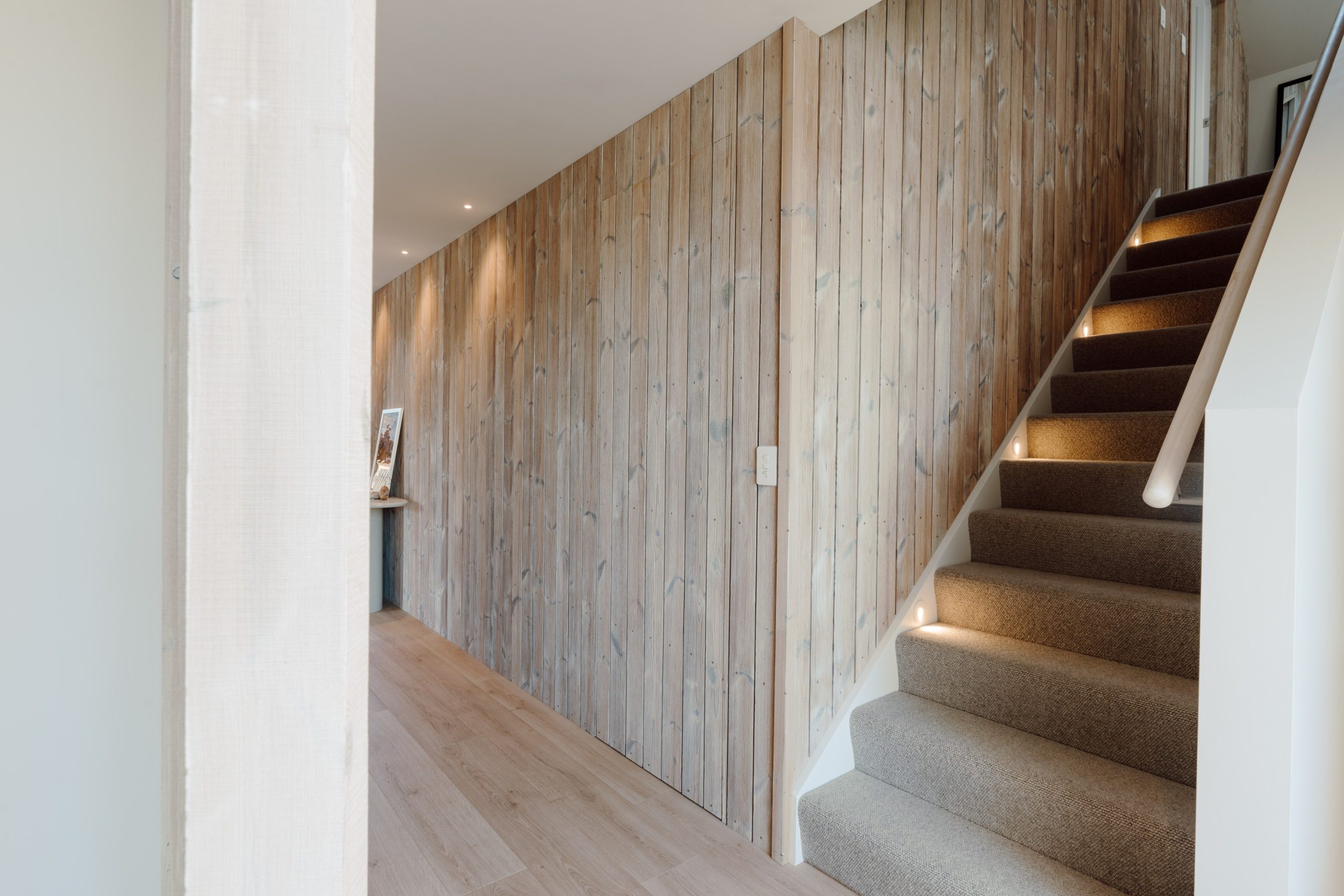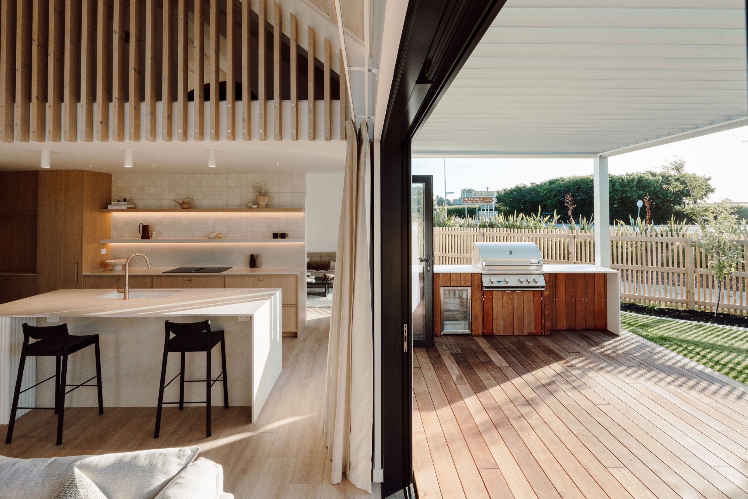 Visually, a specific standout feature of this home, in Vanessa’s opinion, is again the Taiga timber used throughout the home. “It wraps the exterior, continues indoors, and flows seamlessly across stair balustrades, and feature walls – creating a consistent calming rhythm. Its wire-brushed texture and warm tone bring a sense of softness and craftsmanship to the architecture.” Kate Van Aarde, from JSC Premium Architectural and Building Solutions, says that “as both a manufacturer and supplier, we work alongside architects and builders from early concept through to delivery, offering product knowledge, technical expertise, and tailored timber solutions suited to New Zealand’s unique environments.” Having not just done the exterior cladding, but also the interior timber panelling and batten detailing, JSC Premium Architectural and Building Solutions have played a key role in the home’s seamless indoor-outdoor flow.