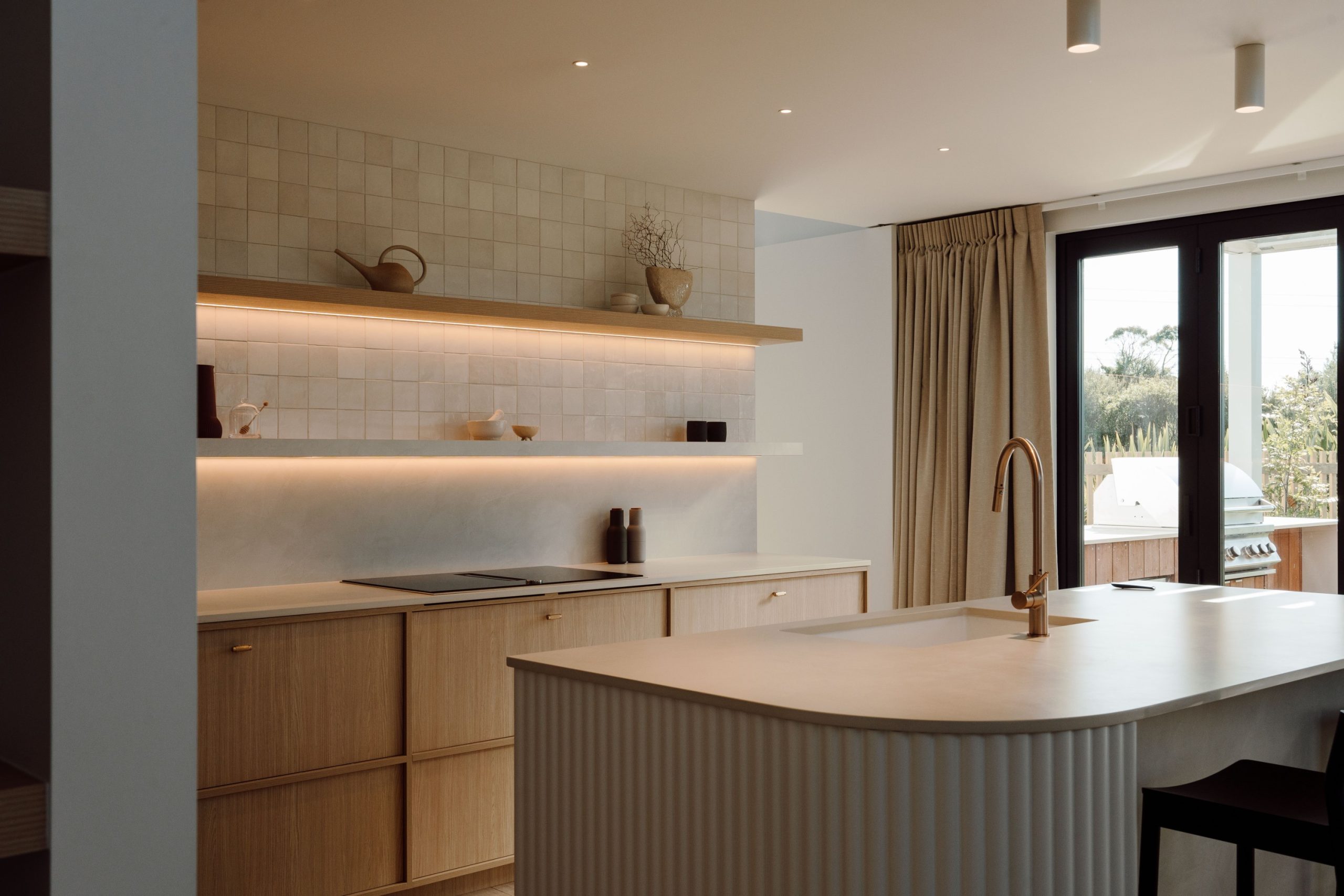 Two of the key architectural design features in the master bedroom are the soaring six-metre-high vaulted SIPs ceiling and the curved wall, finished in textured Venetian plaster, which wraps around into a generous ensuite. “This sculptural feature required careful framing and lining to achieve a perfectly smooth, sweeping form. The skill involved in executing this uninterrupted curve, both structurally and visually, was significant, and it draws the eye upward towards the exposed SIPs ceiling above.” The home features many curved design elements, ensuring a soft, consistent feel throughout the build. Working closely with Tawa Architecture and Higgs Building and Co., Paula Waterhouse and Abbie McLean from Paula Waterhouse Design helped shape the interiors palette, kitchen design, and material finishes. Taking reference from the architectural materials developed by the design and build team, PWD expertly carried the palette and textural elements through to the interior spaces, ensuring a cohesive and harmonious design language throughout the home. Building on Vanessa’s strong vision for a Japandi-inspired aesthetic, they expertly translated the architectural intent into refined interior moments, thoughtfully integrating sustainable products and details that align with Ebode’s ethos of creating high-quality, healthy homes. Abbie adds that adding texture to create interest is a main goal they have when it comes to designing spaces. “It’s not only about colour, but how materials add softness and interest to the space. Everything we selected needed to add to the sense of tranquillity that you feel in the home.”