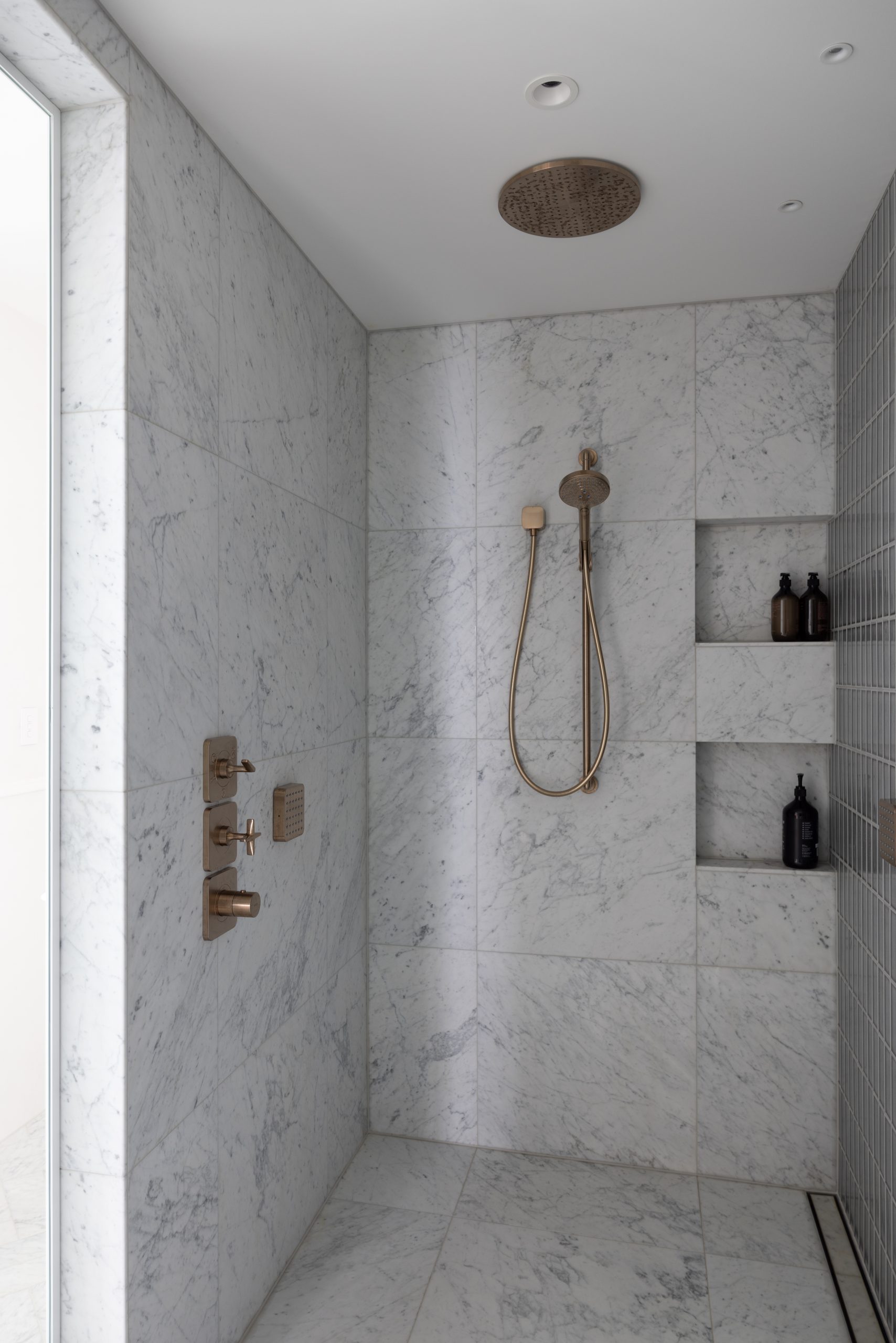 Carrara marble supplied from CDK stone for the flooring was all hand cut, and Alaska Quartzite was used for the vanity tops.