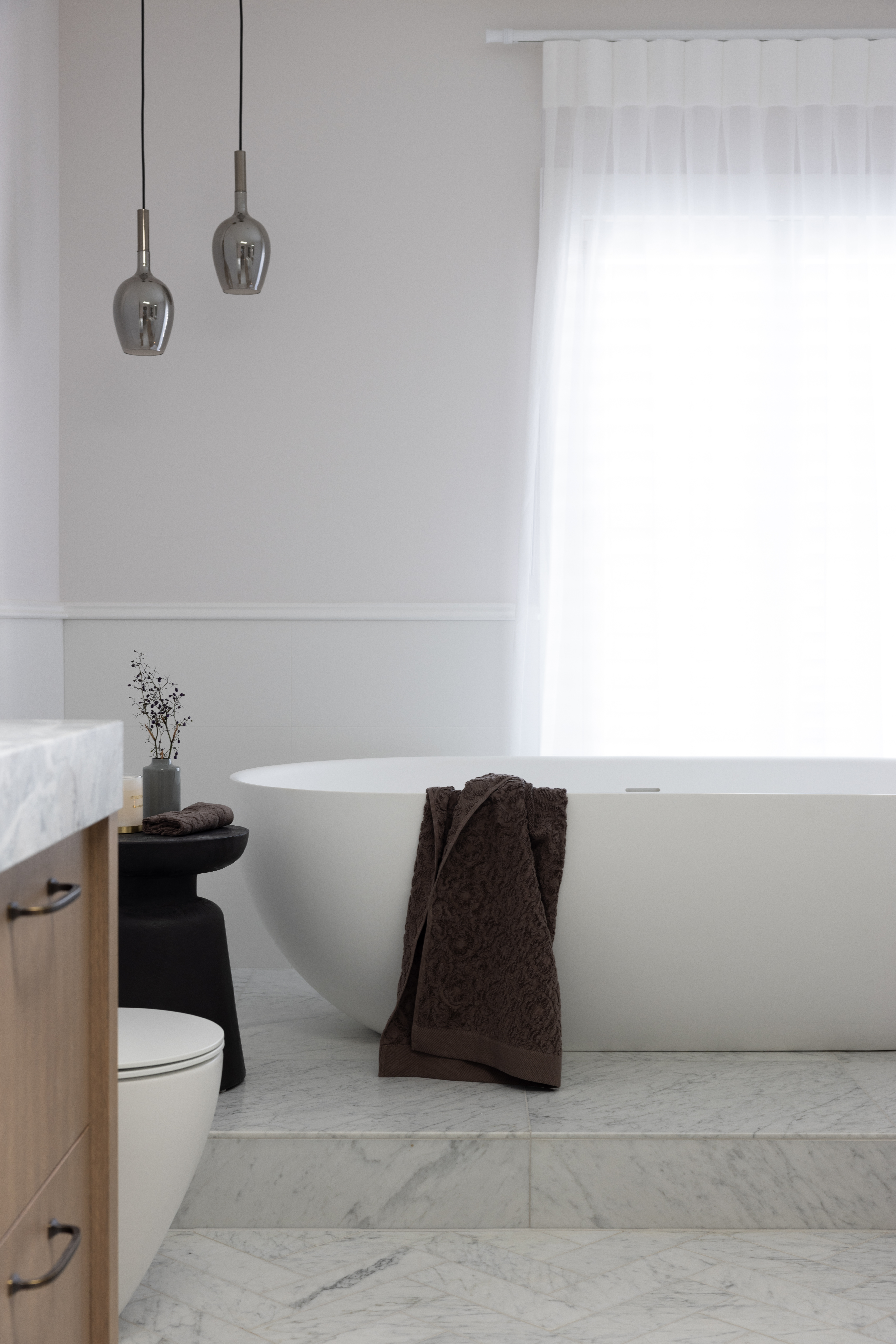 In Lacey’s opinion, one of the heroes of the bathroom design was the marble herringbone floor, which was part of the client’s initial brief and scope to start with.