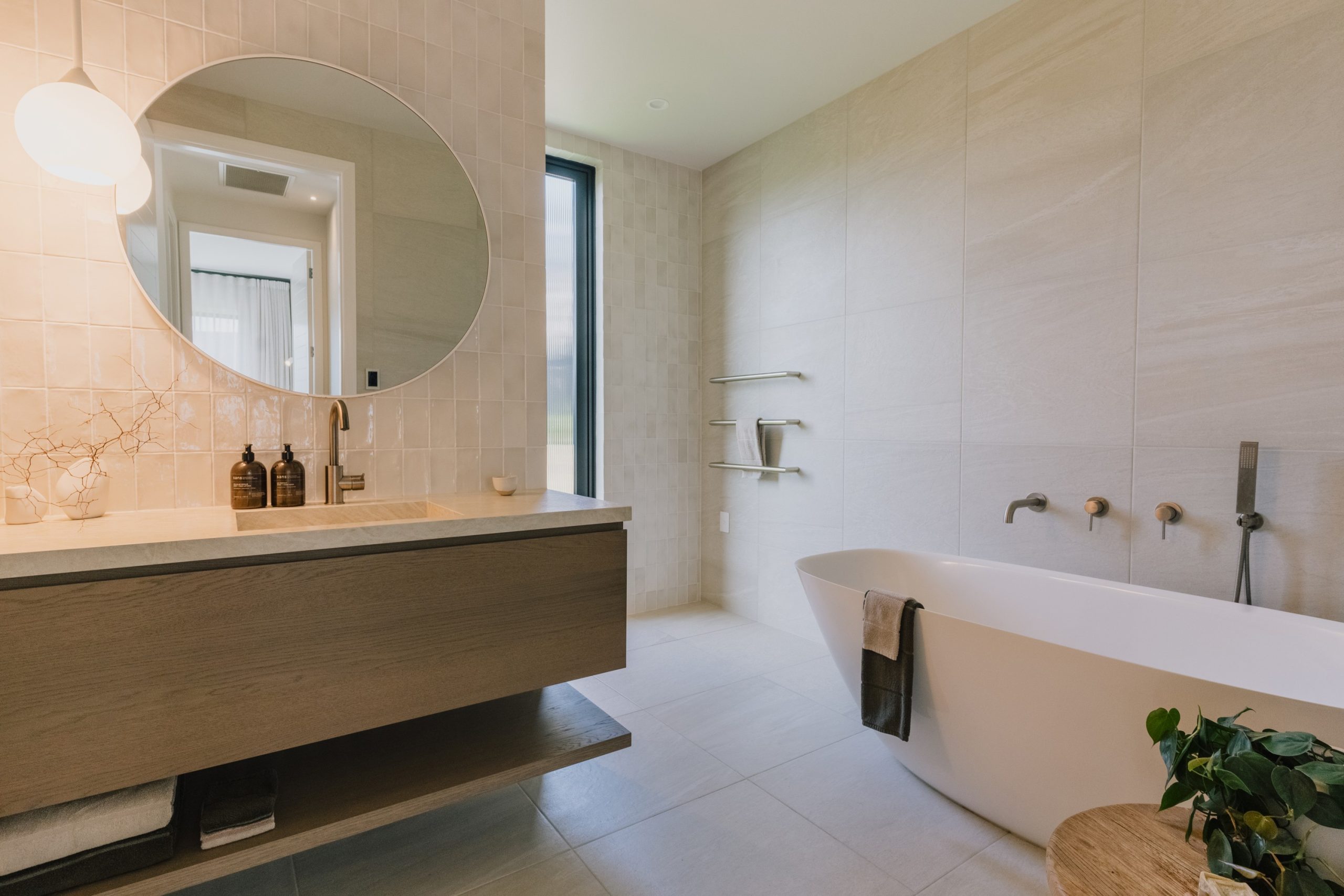 The kitchen island features a mitred Consentino Dekton Liquid Shell benchtop. The same Manhattan Oak and Dekton carries through into the bathroom, with integrated sinks in the vanity benchtops as a focal point. Momento Blanco tiles from Tiles on Devon bring a light coastal style warmth to the backsplash with brushed brass tapware from ABI Interiors. Some of these elements have also been installed in the laundry to ensure a cohesive look. In the bathrooms Jack wanted dual mixers for the bath and showers. Momento Blanco wall tiles and large format Blanco wall and floor tiles are a soothing neutral backdrop in the bathrooms.