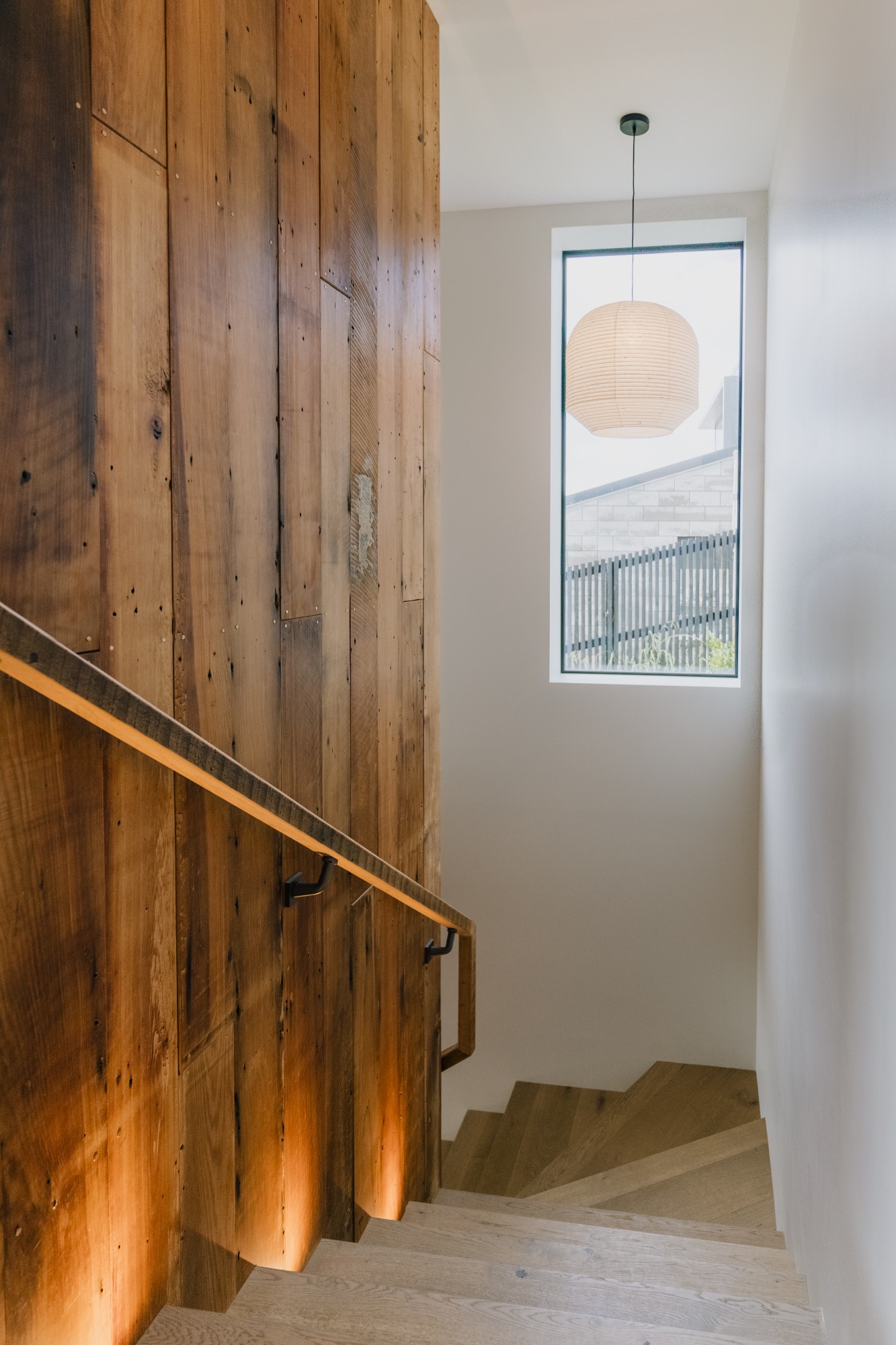 The striking timber feature wall in the stairwell is made from recycled kauri boards. “These were the internal wall underlay for one of the first homes built in Raglan which was shipped down on a barge from Northland over 100 years ago,” says Jack. “These boards had old newspaper clippings on them, some of which were preserved on the timber to play into the feature adding depth of place to the home. We milled these down on site and the end result worked out beautifully. Repurposing the old is something we thoroughly enjoy.”
