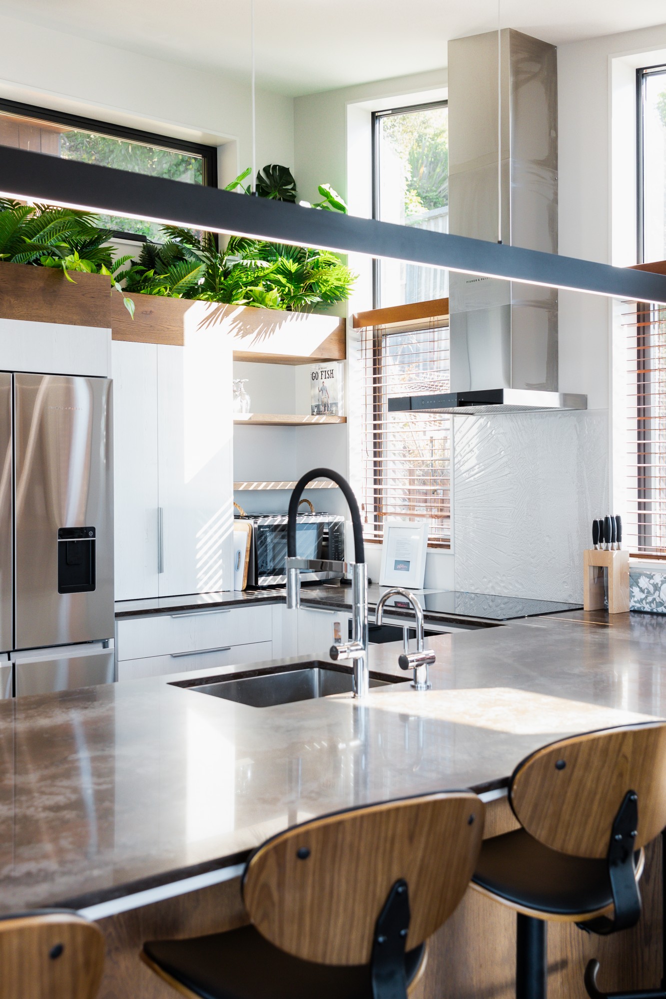 The main challenge, he adds, was the narrow and steep site. To overcome this, the team had to construct a six-metre-high retaining wall driven six metres into the hillside. “We had to work from the top down, cutting dirt away as we worked towards the ground level before starting the house. We had to be strategic when working out this plan, as it also consisted of using hiabs to lift diggers up and down the hill to backfill the retaining wall.”