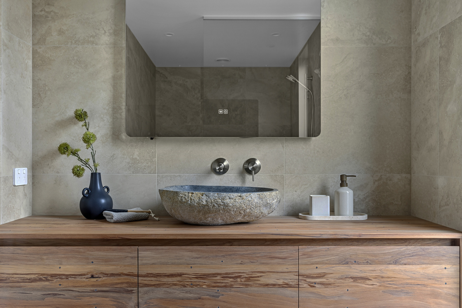 Nikhil believes the standout piece in this home is the upcycled Rimu vanities.