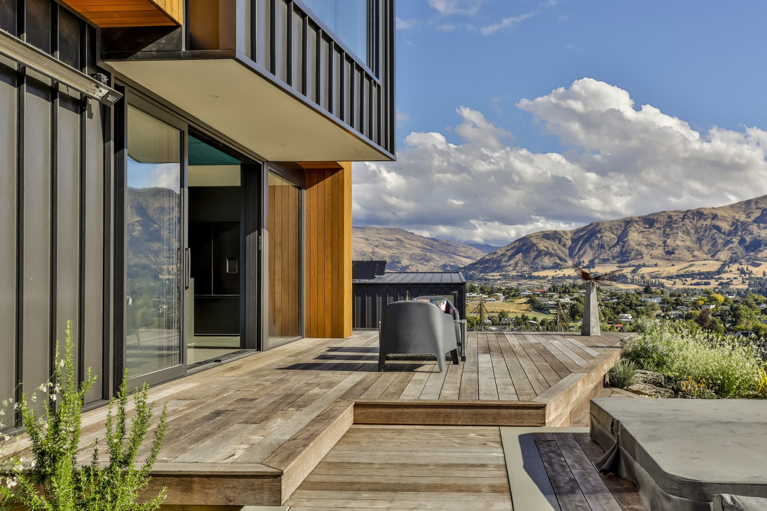 extension of the interior. Bruce highlights the exterior’s playful yet practical personality: “The angular deck and dropdown courtyard with spa and fireplace… really offer a magical area to seat guests and watch the sun set over Roy’s Peak.”