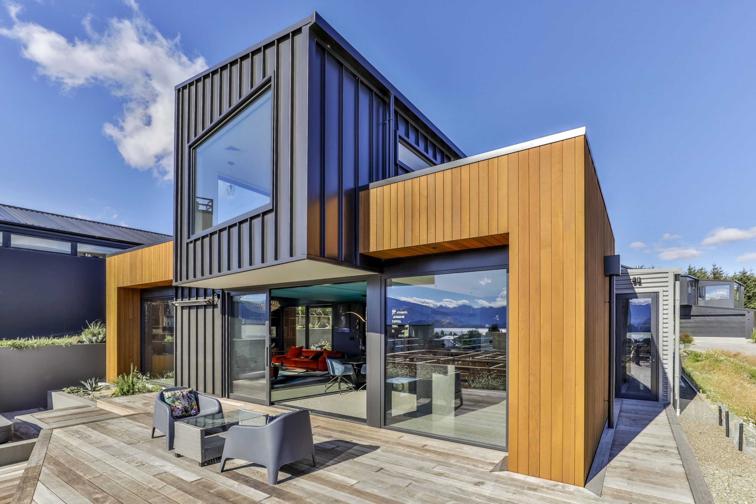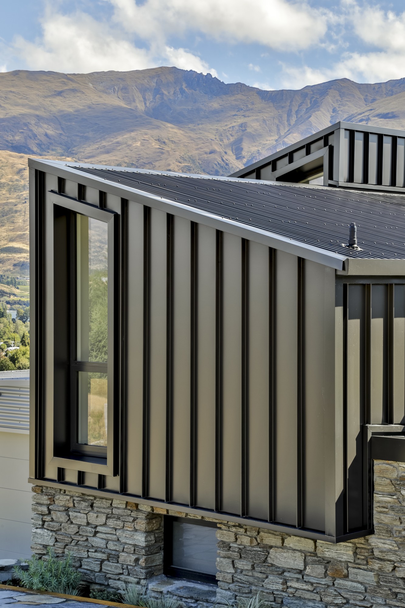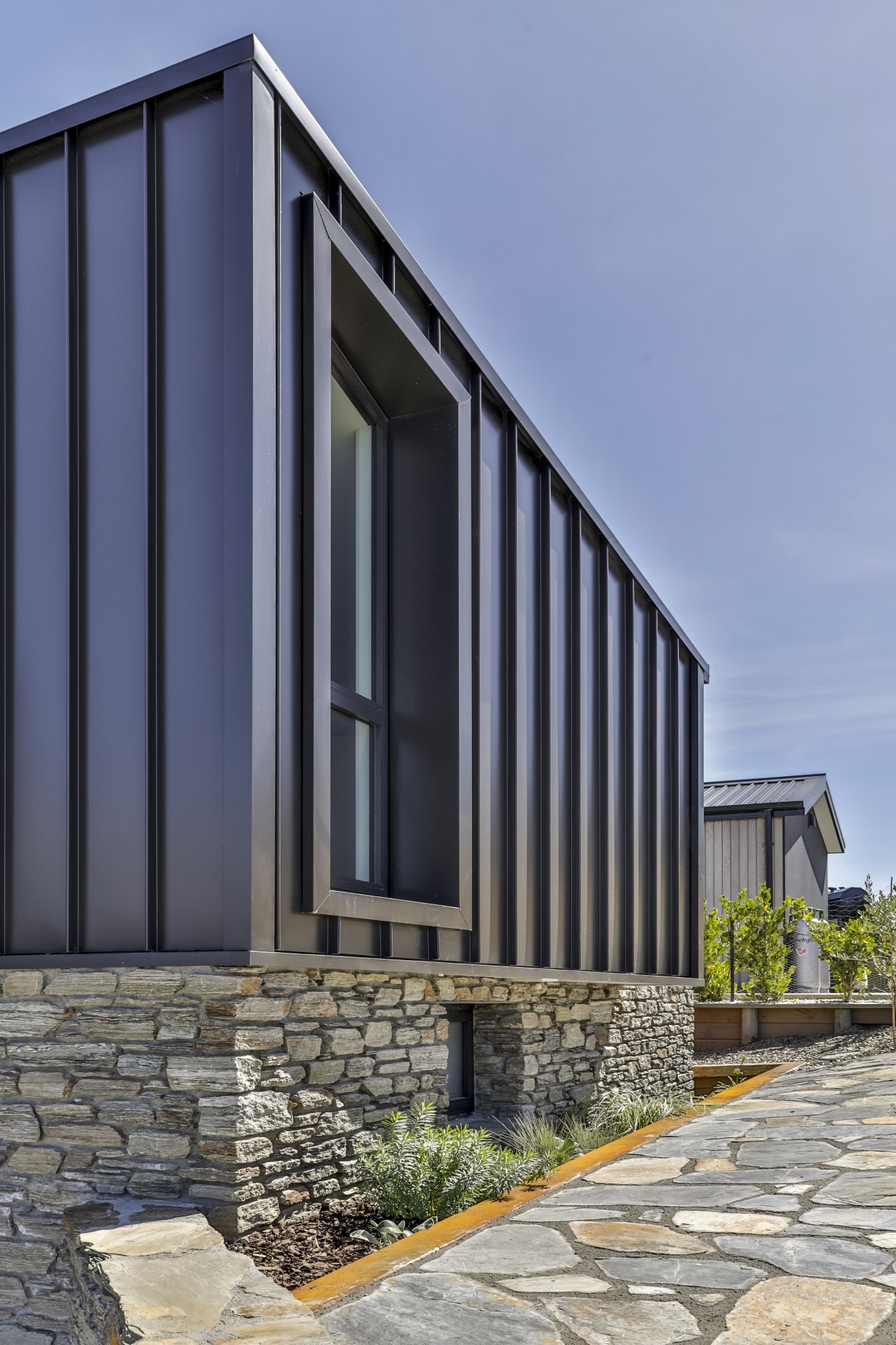 The architectural composition is rich in both texture and tone, using a clever mix of vertical and horizontal metal cladding, shiplap cedar weatherboards, and stacked stone that feel grounded in the Central Otago landscape while offering striking visual appeal.