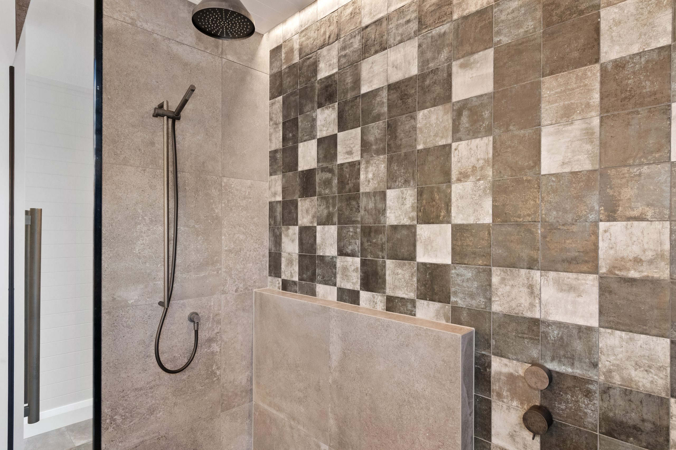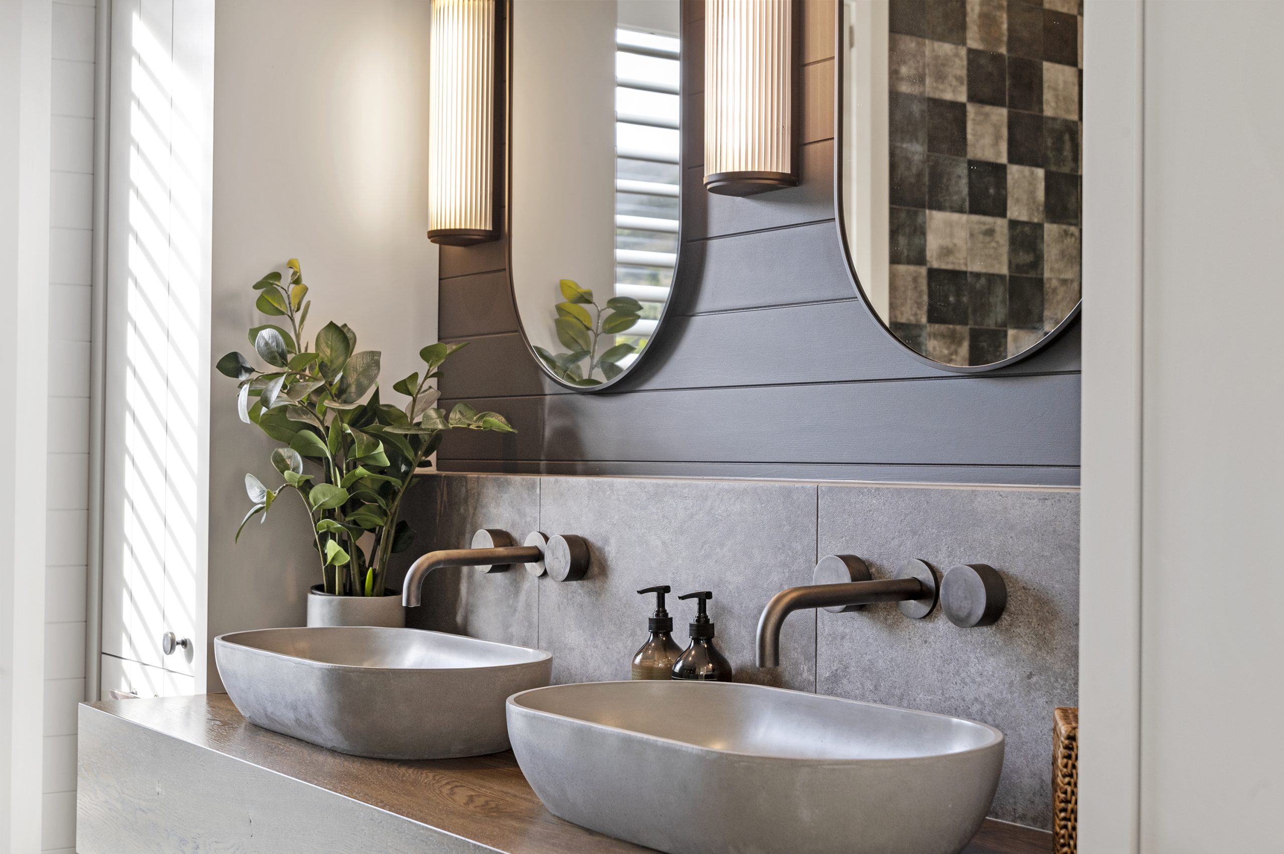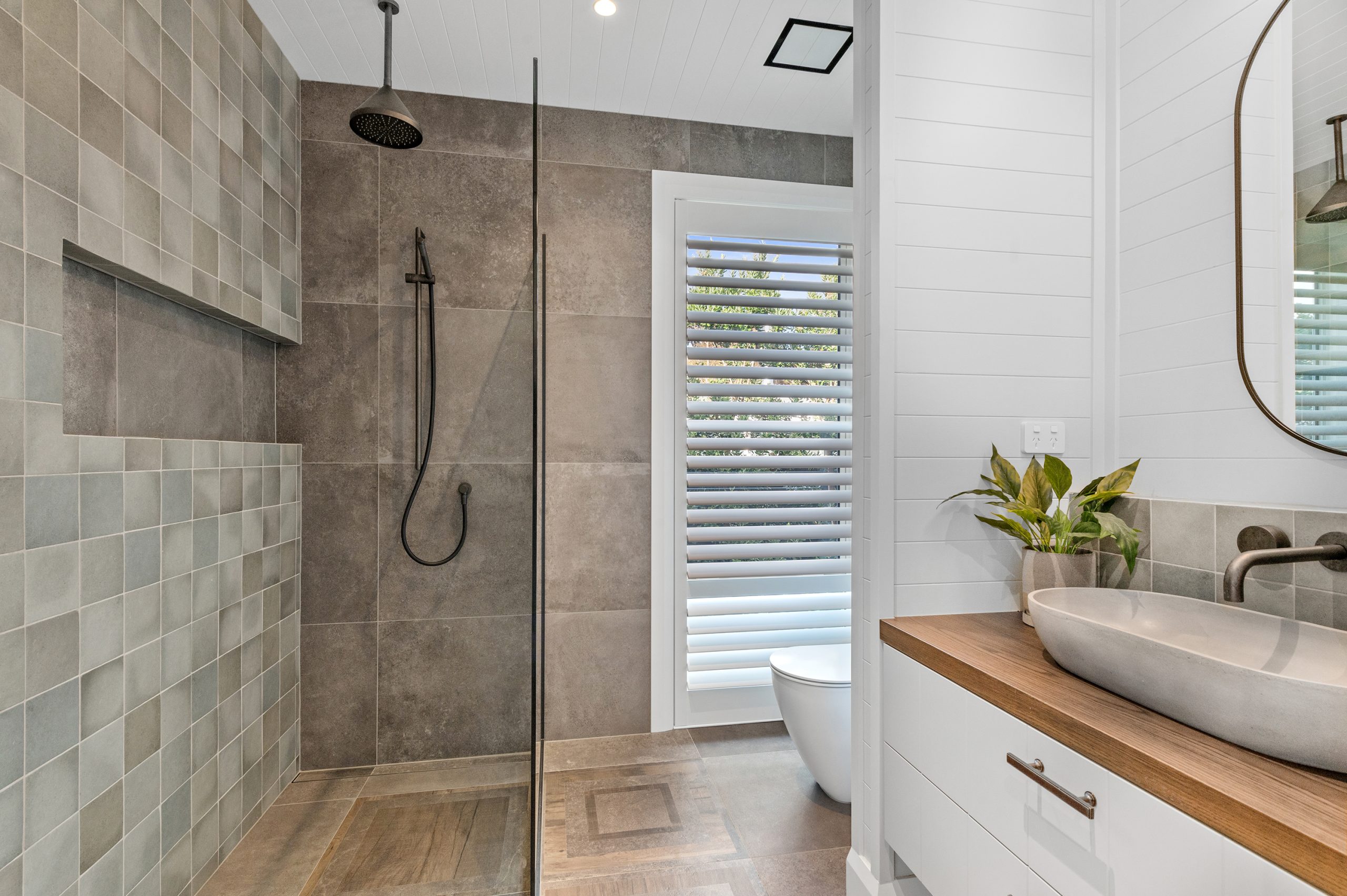 The bathrooms have beautiful natural timber vanity tops, mosaic tiles, and grooved timber and battens, carrying the calm vibe of the home all the way through.