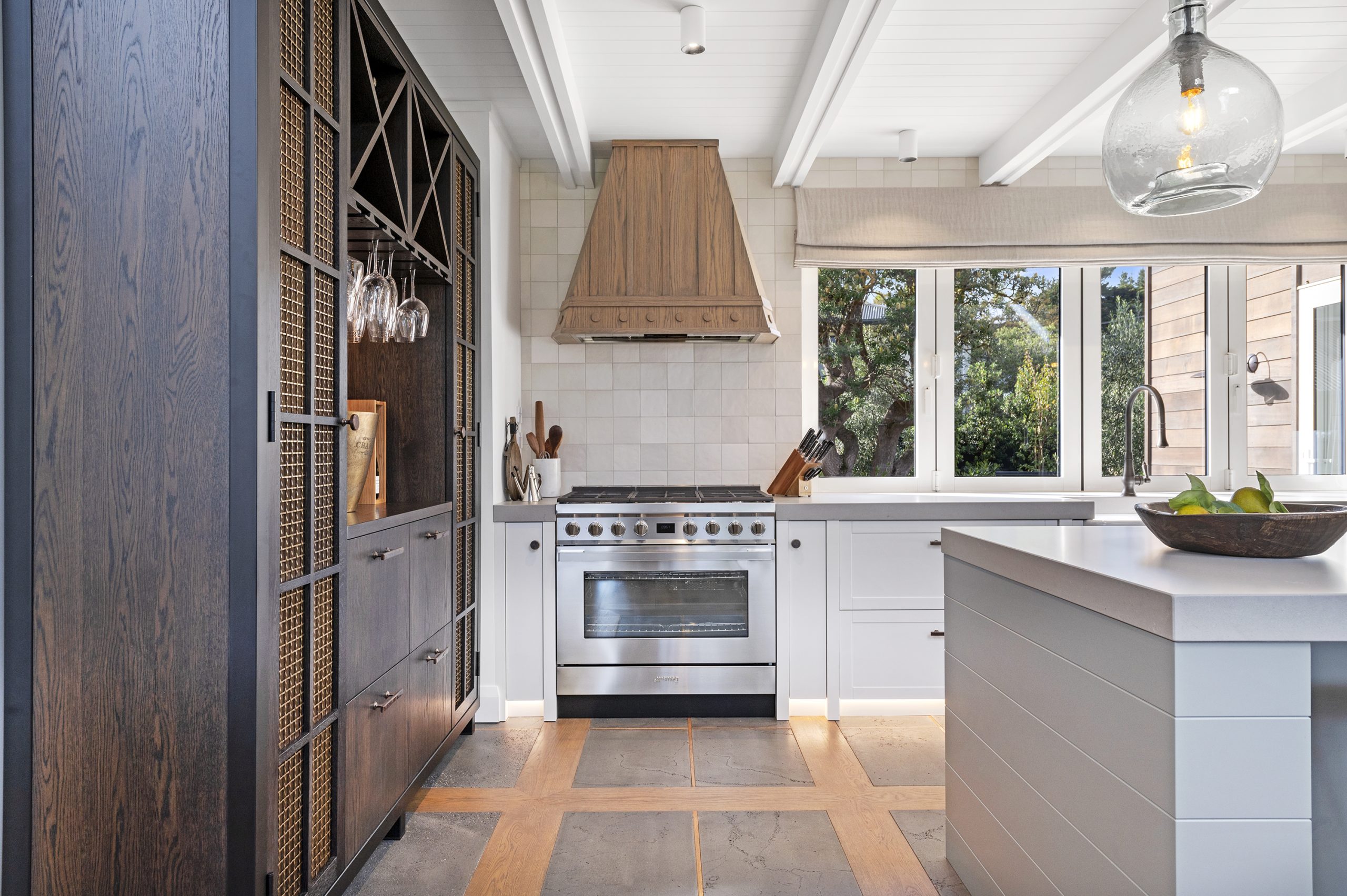 The kitchen has a contemporary style, with an engineered oak timber floor accompanied by bluestone tiles.