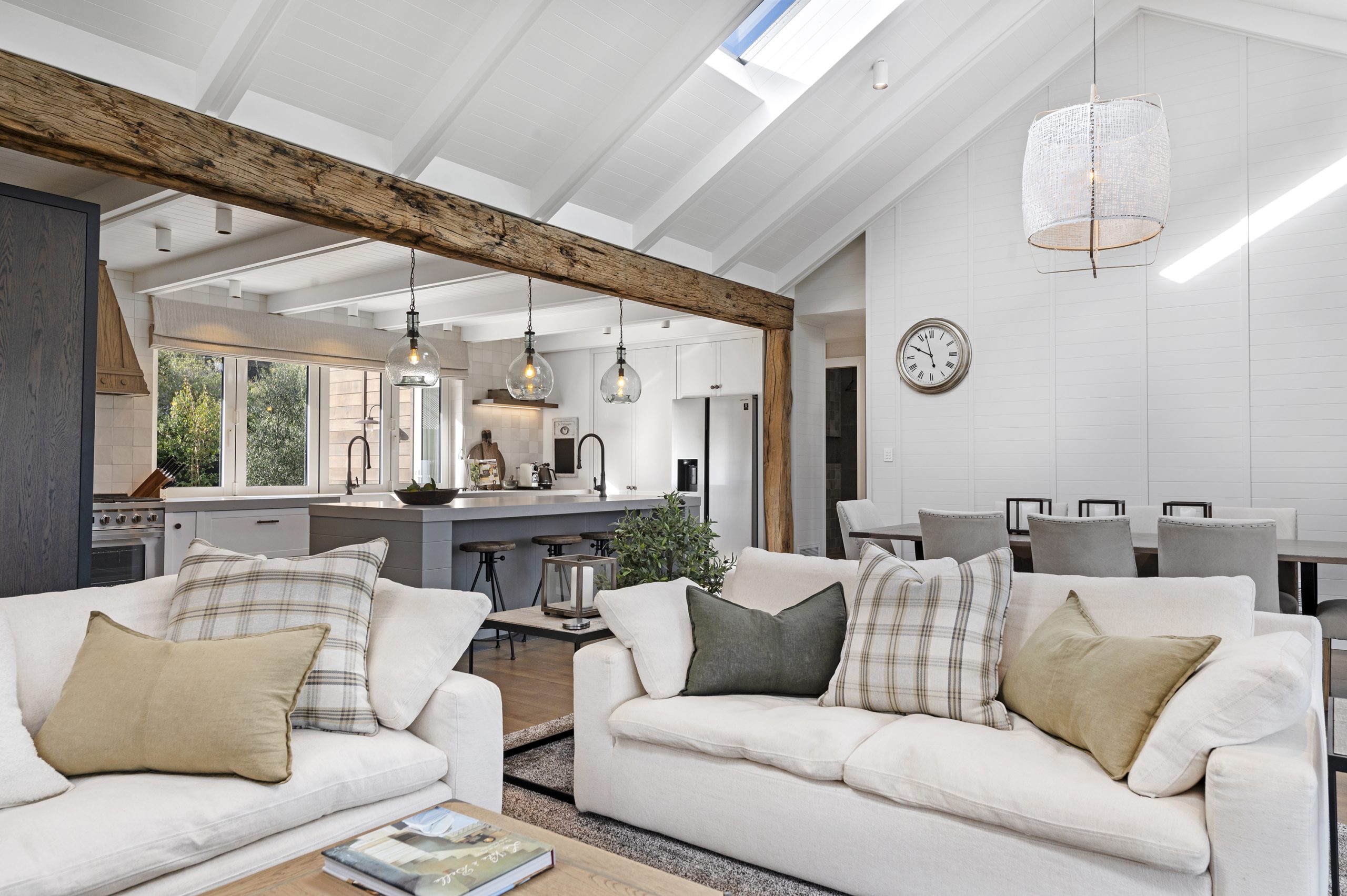 The home welcomes an abundance of natural light due to the four large skylights in the living room.