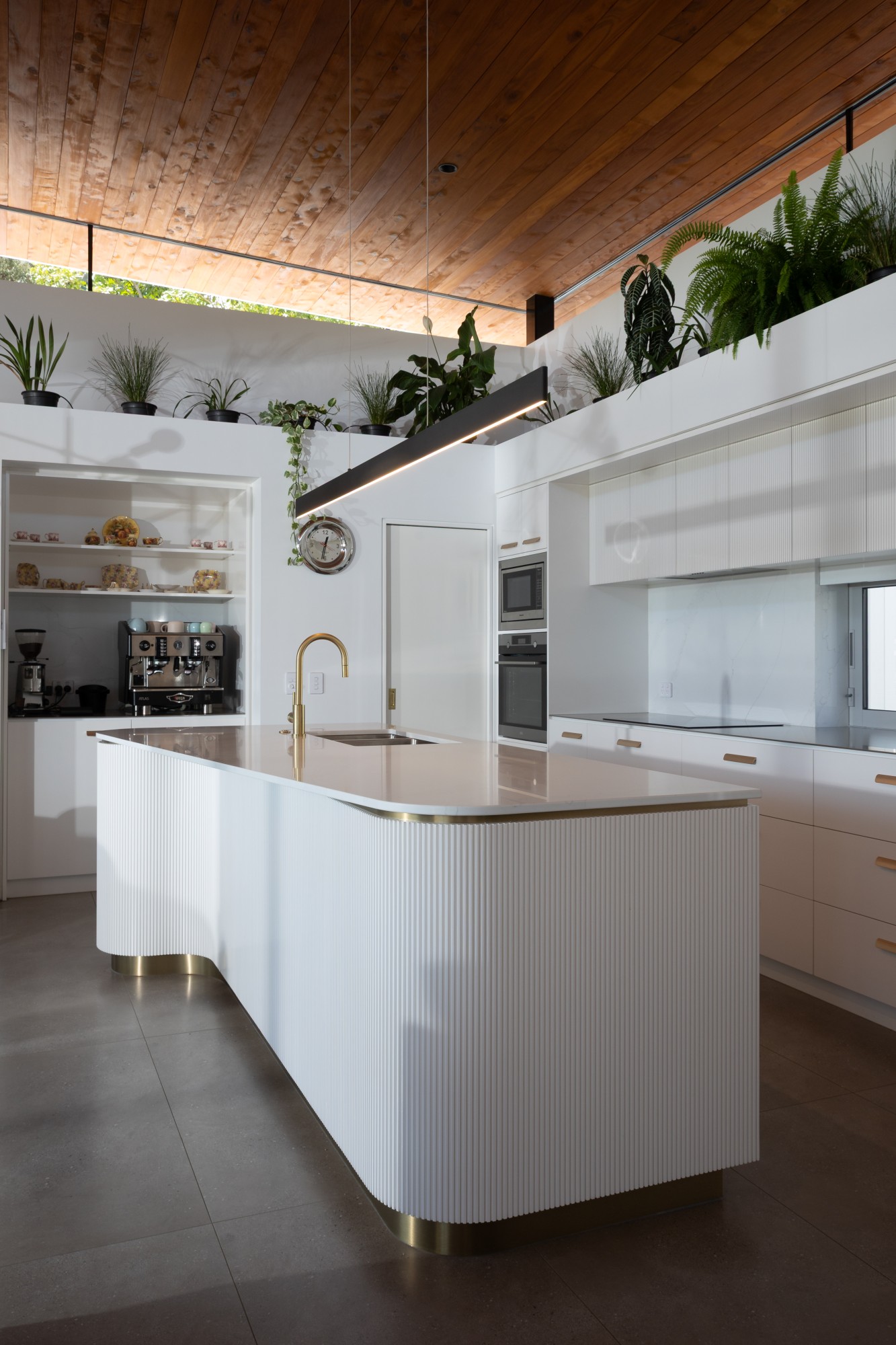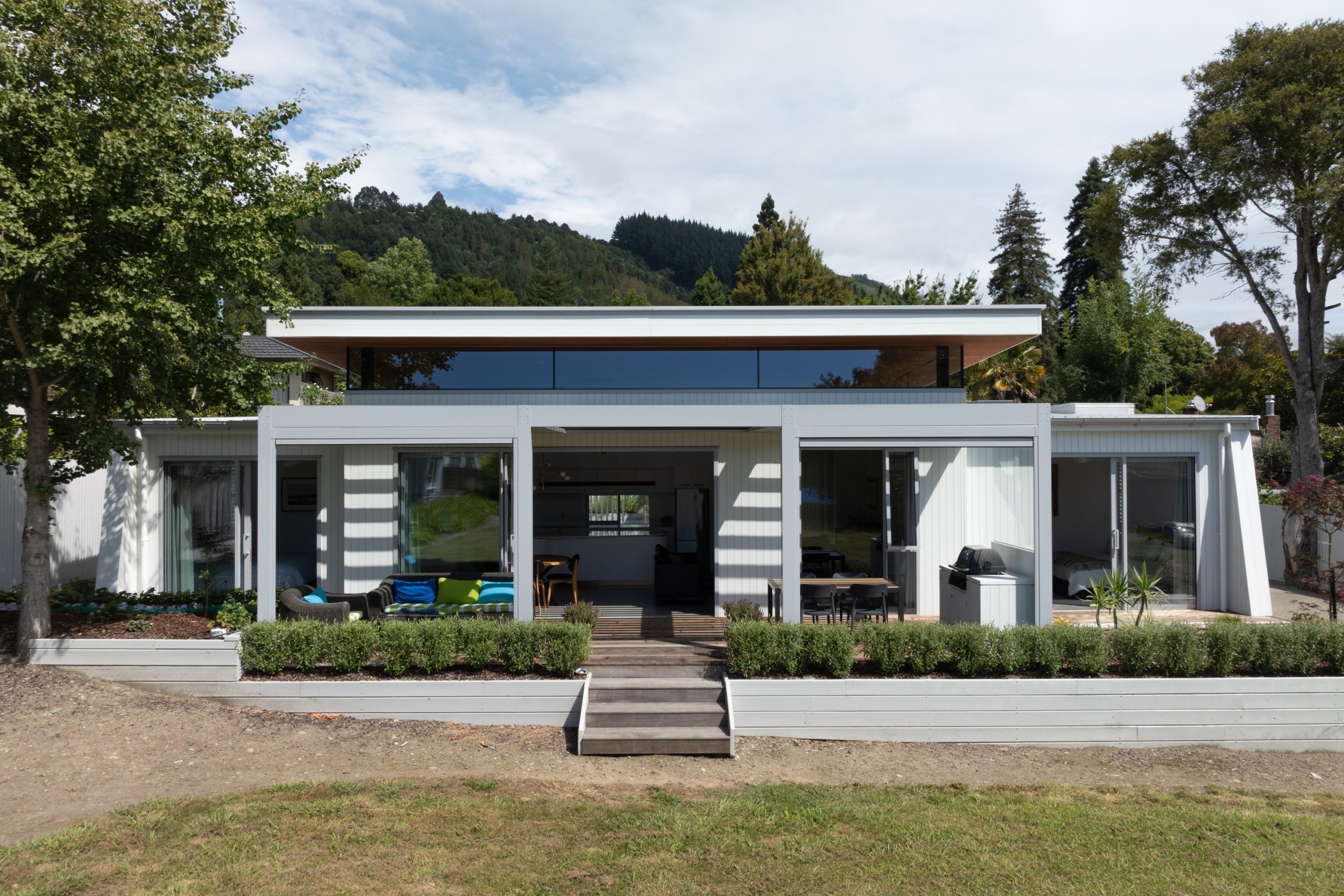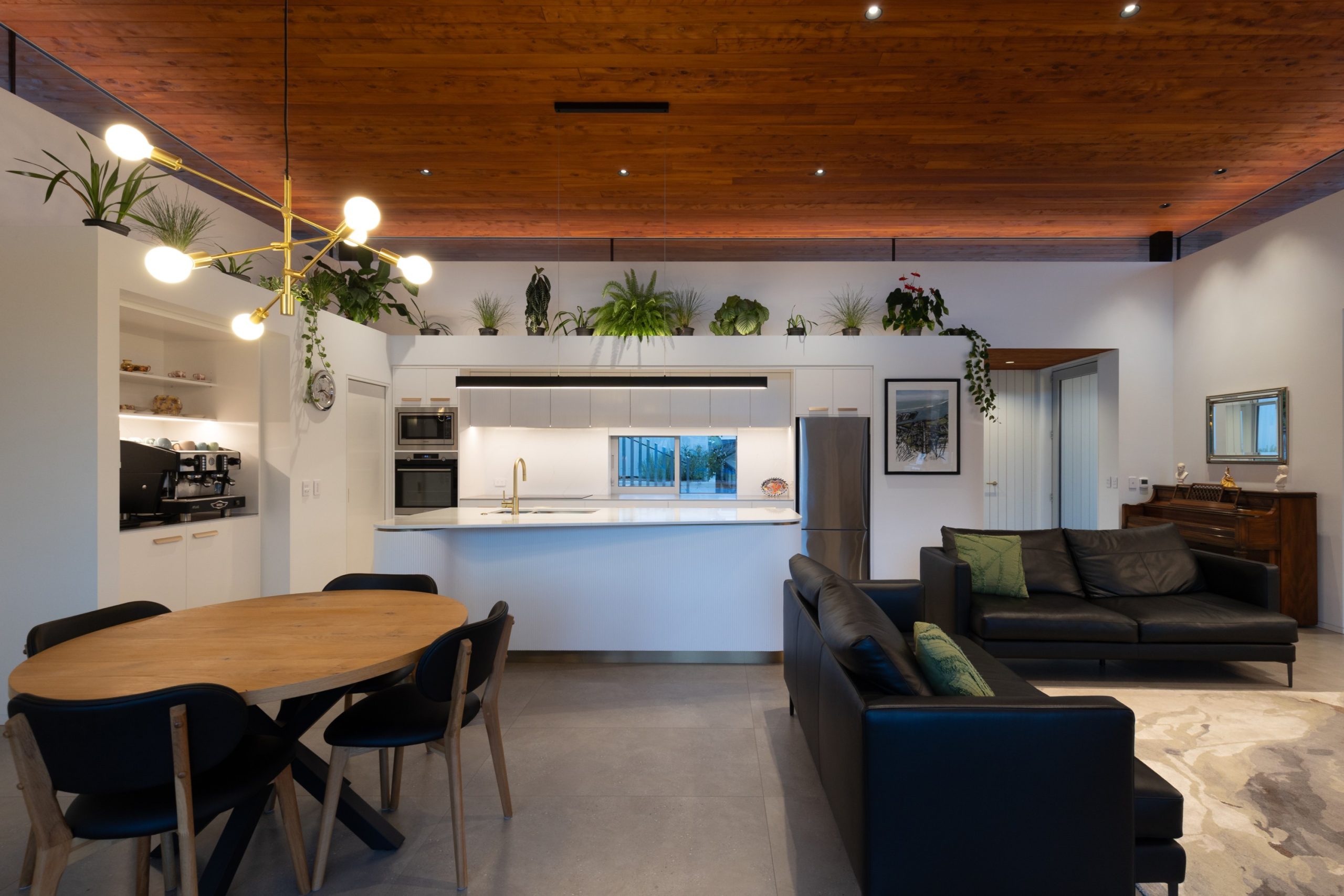 A vertical corrugated cladding beneath the timber rainscreen ensures watertightness and flexibility, while the stained Cyprus timber soffits and ceilings add tonal warmth. “The white on white external colour scheme kept it fresh while the warm stained Cyprus soffits and ceilings were allowed to pop, further drawing your eye to the floating roof.”