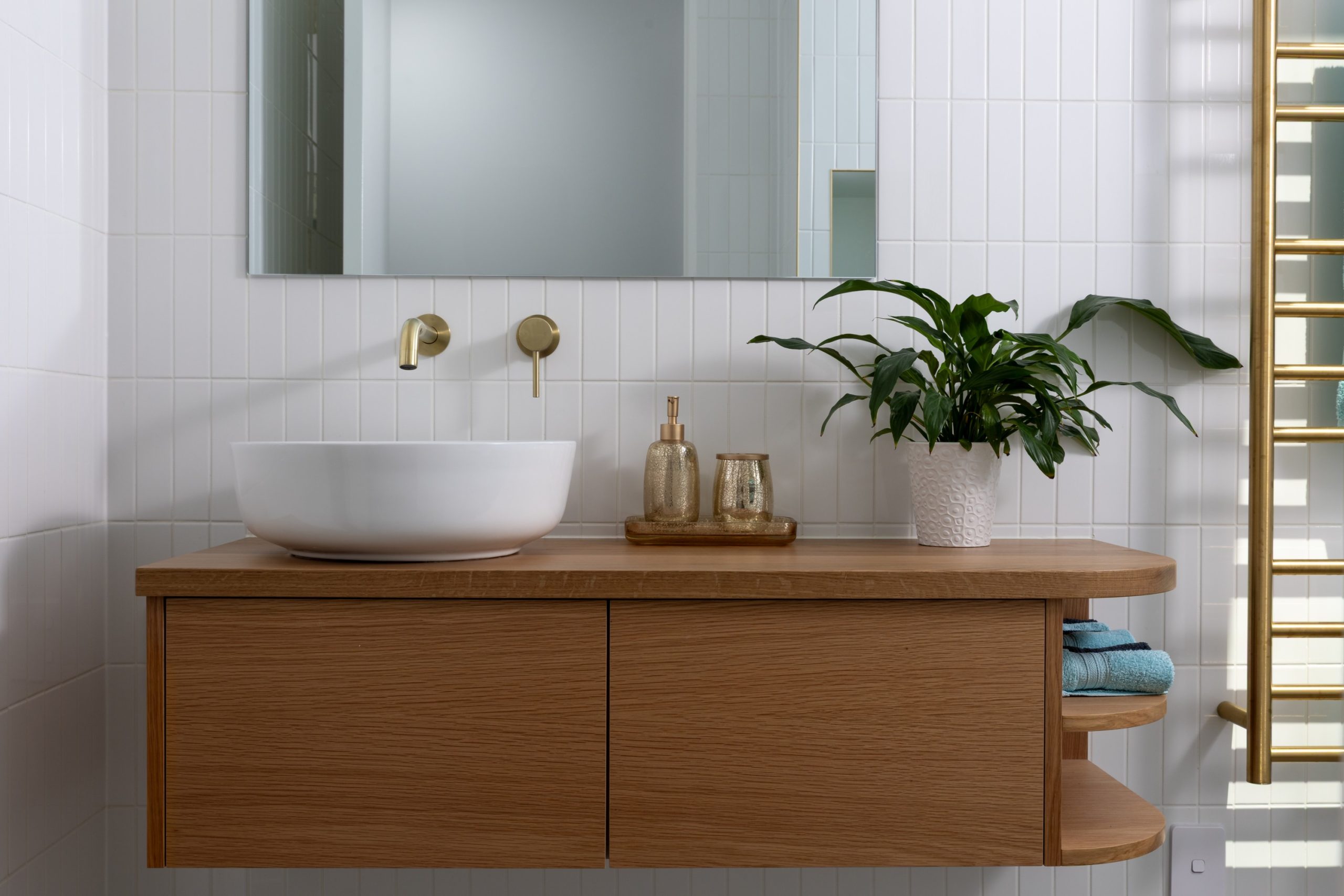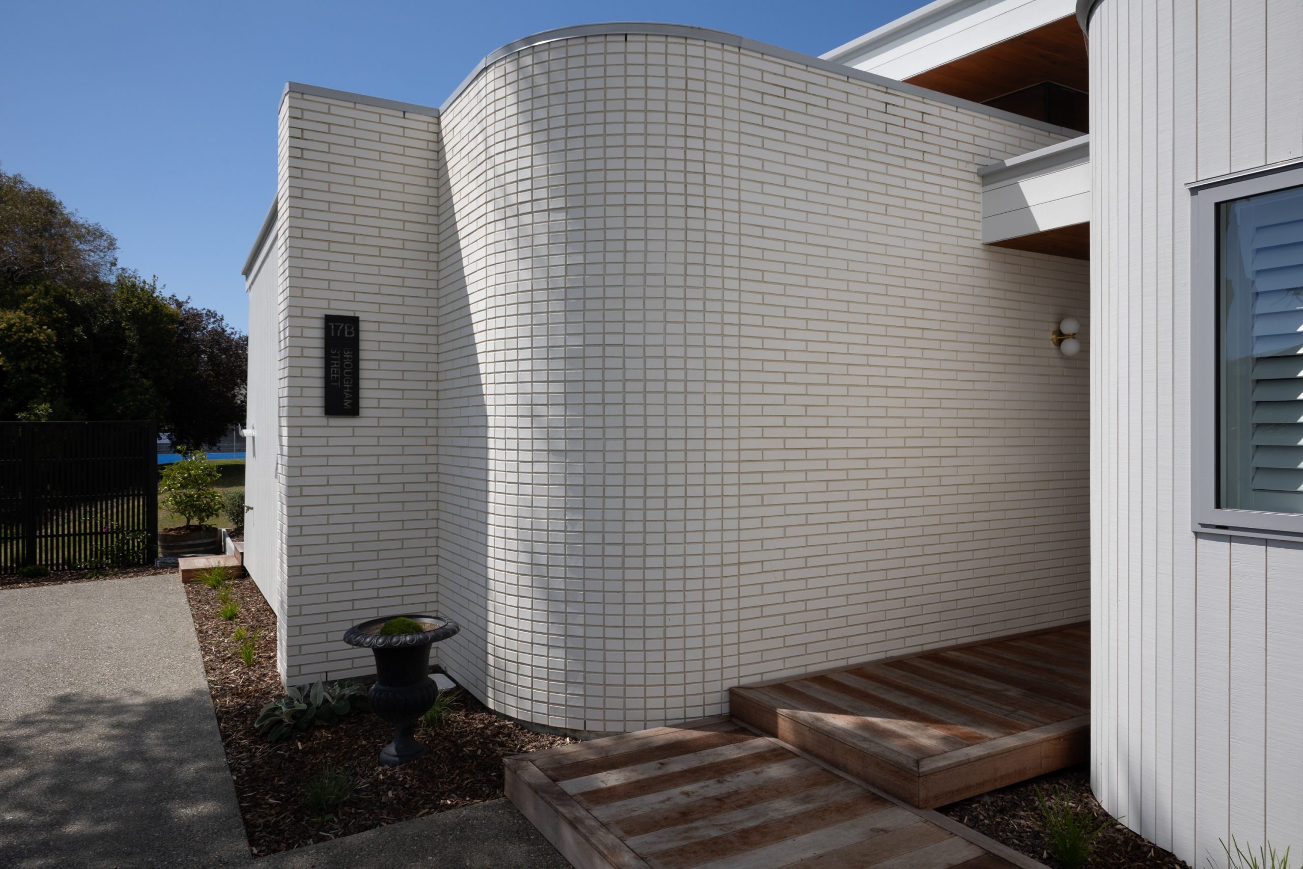 The external and internal curves that define the home were influential in material choice. “The external curved walls meant we needed to select materials suitable for going around fairly tight bends – the bricks and timber could be cut smaller to allow for flexibility of curve radius. This was also the case with the internal curved tile shower; smaller tiles were required to seamlessly go around the internal curve.”