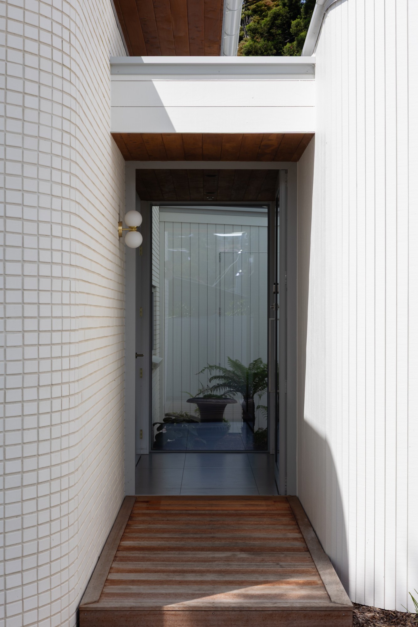 The materials chosen played a key role in shaping the home’s result. “Core materials used were brick, timber, and glass,” Brittany says. “They were selected for their low-maintenance properties.” The palette is intentionally restrained, with white-painted timber cladding adding natural texture while keeping the upkeep simple. The narrow-profile white Palma bricks from Austral bring modern quality to the combination.