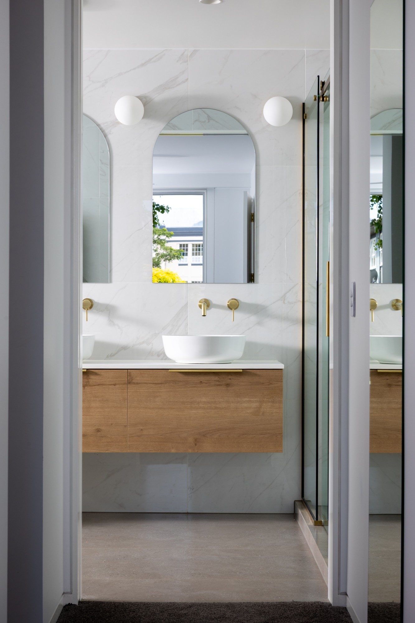 Tasman Tiling installed all the tiling across the project, with products supplied by Nelson Tile + Slate and The Flooring Room. The ensuite features Lux Carrara Polished tiles in a 600×600 format. To create cohesion throughout, 1200×600 Portofino Light Grey matt tiles were laid across the flooring, bringing a consistent and contemporary base to every space.