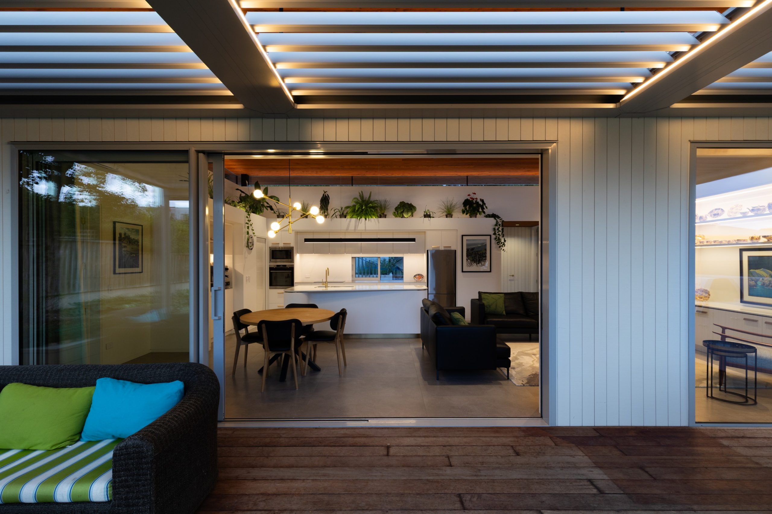 Delivered through a fully glazed perimeter designed in collaboration with Viridan Glass, the roof appears to hover above the home. “The concept was to have all four sides completely glazed with minimal structure (silicone joints to the glass only),” she says. “With a bit of structural engineering, we managed to get it to four corner exposed steel posts that sit inside the glazed surround.”