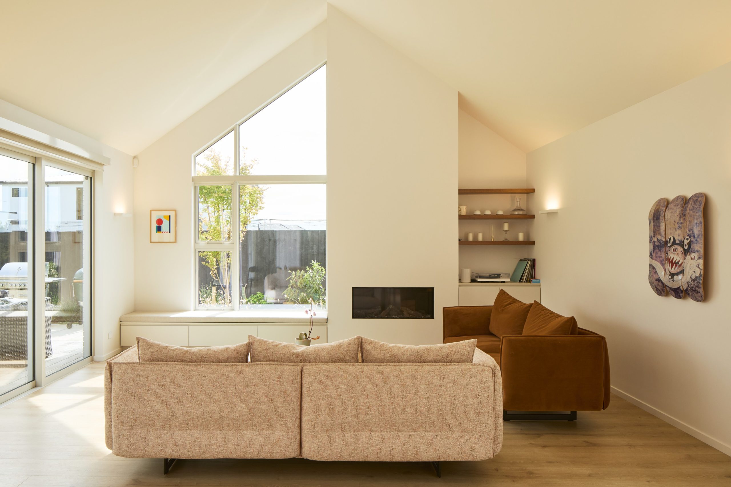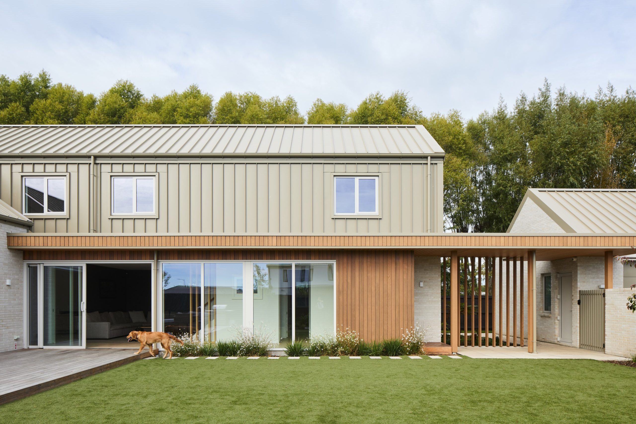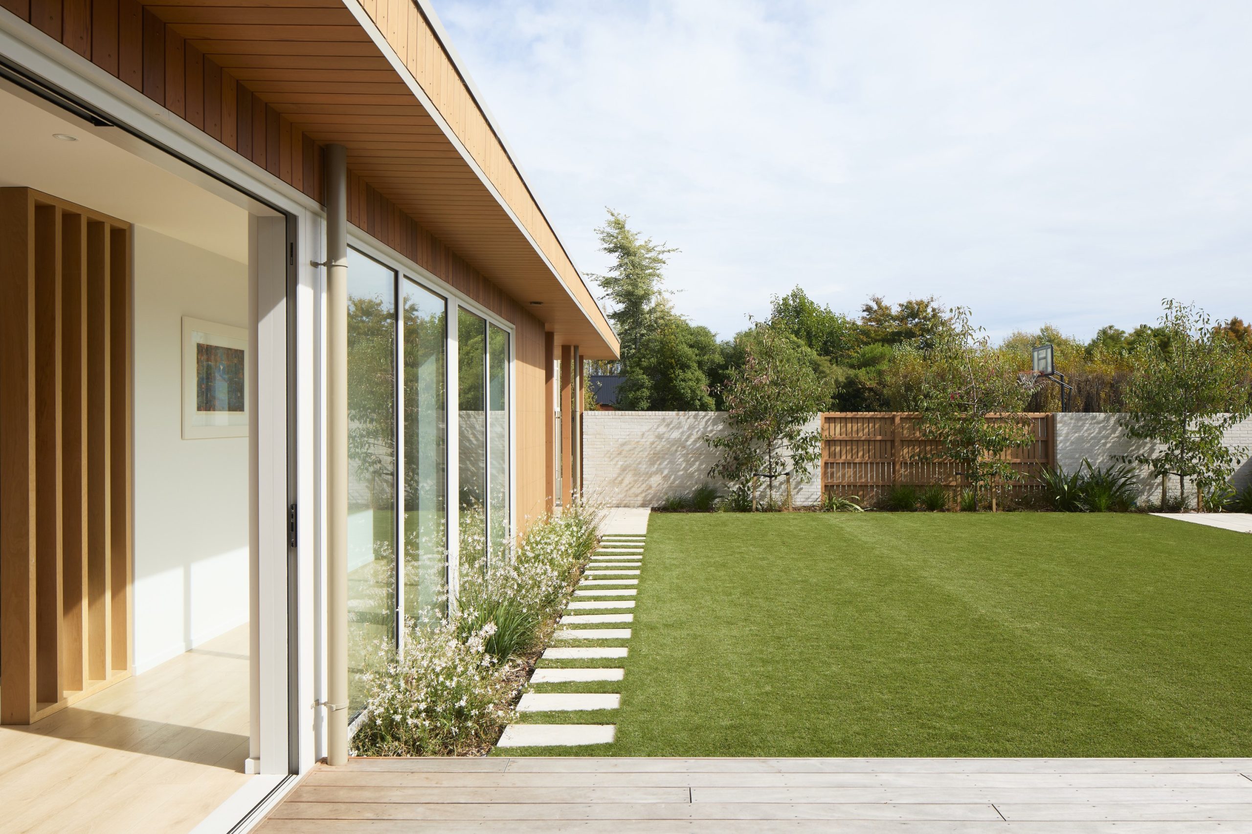Energy efficiency, natural light and durability are key aspects of the design. A downstairs office and a separate but generous detached garage connect to the home via a covered path backed with vertical cedar battens. Soft landscaping balances privacy with a sense of connection to the neighbourhood.