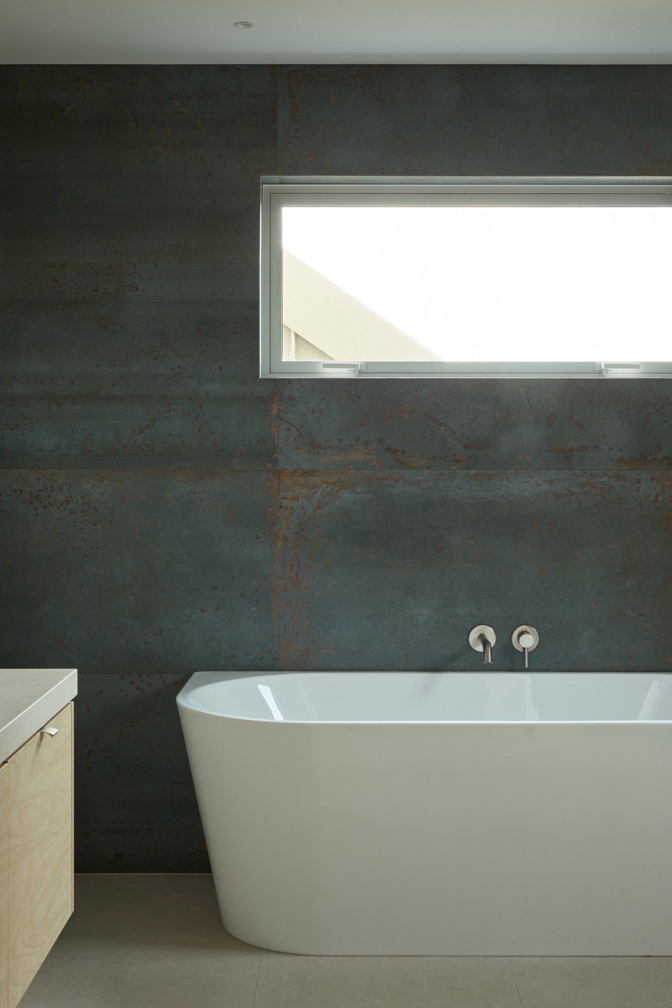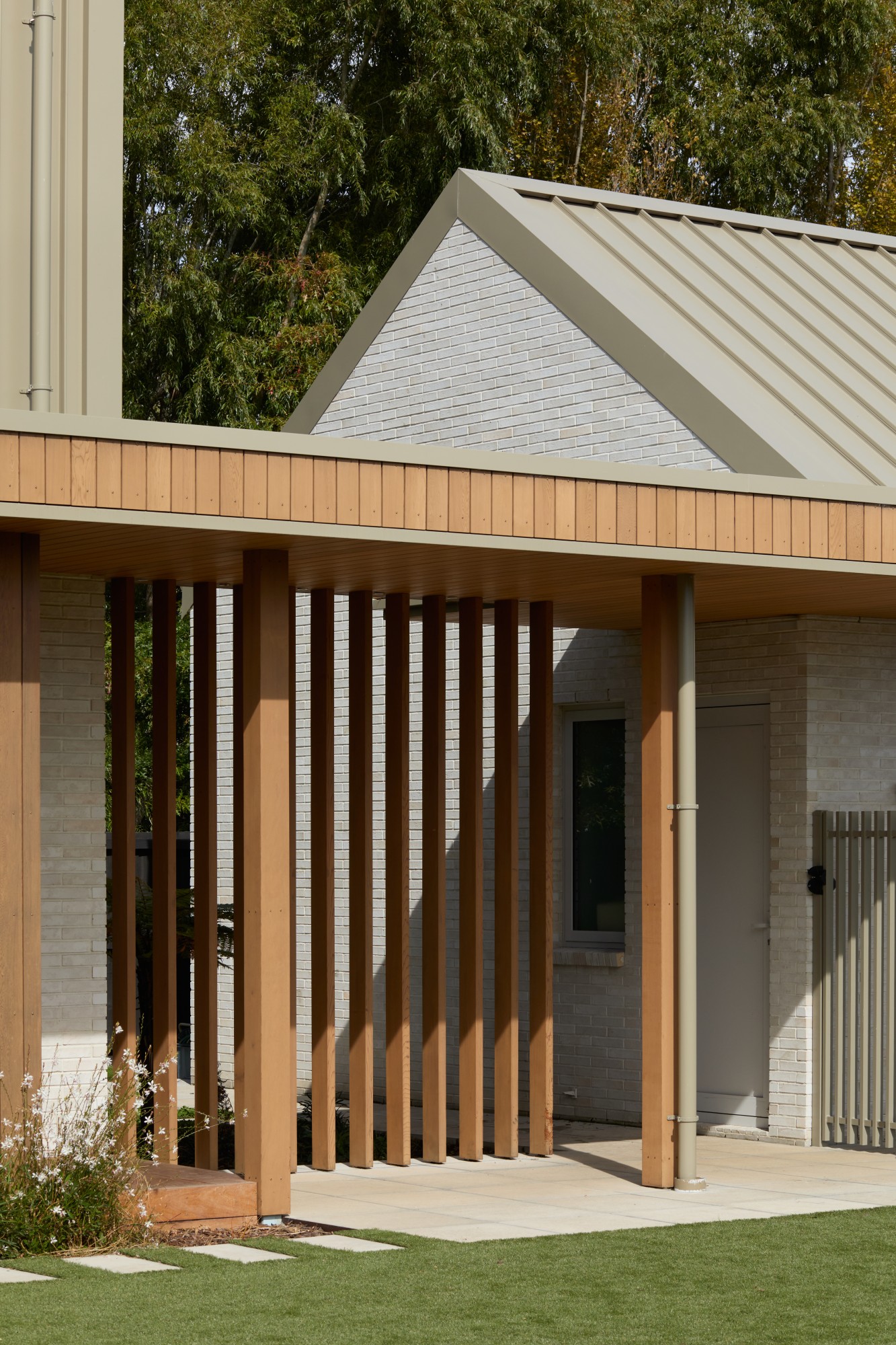 Both the exterior and interior palette were selected by interior designer Jane Swinard, including the steel tray Colorsteel Espan cladding in Lichen, the Hermpac cedar weatherboards and custom brick. The slimline Roman style Canterbury Clay Brick cladding was made to order from the bespoke Create Range.