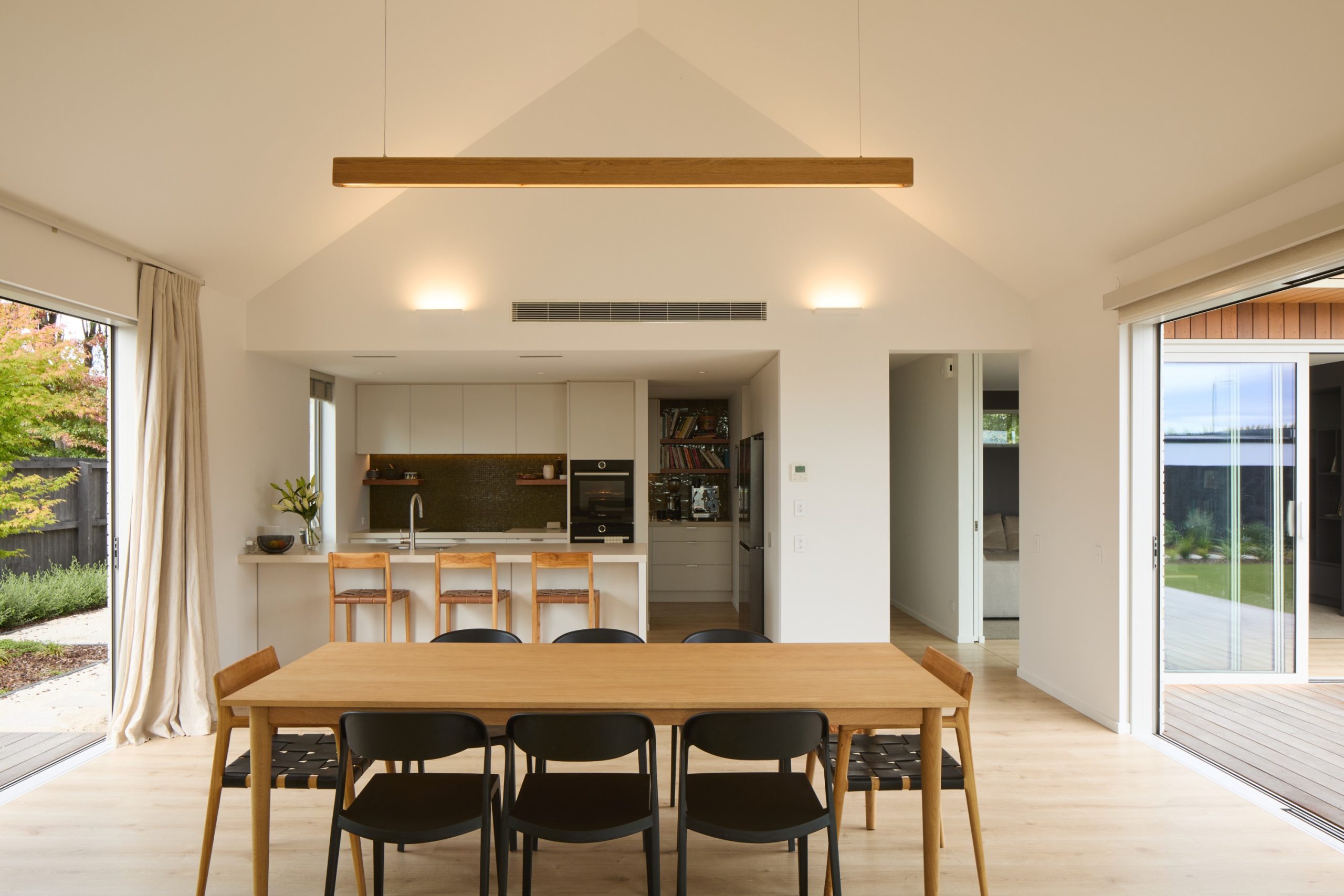 The home is oriented for natural light and warmth with sheltered outdoor spaces positioned to embrace the sun. A central spine runs through the building, leading from the entry canopy through to distinct living zones. The communal living spaces feature pitched ceilings and generous glazing to create light filled areas of connection that open directly to the north-facing courtyard. Upstairs, the bedrooms offer spaces for quiet retreat.