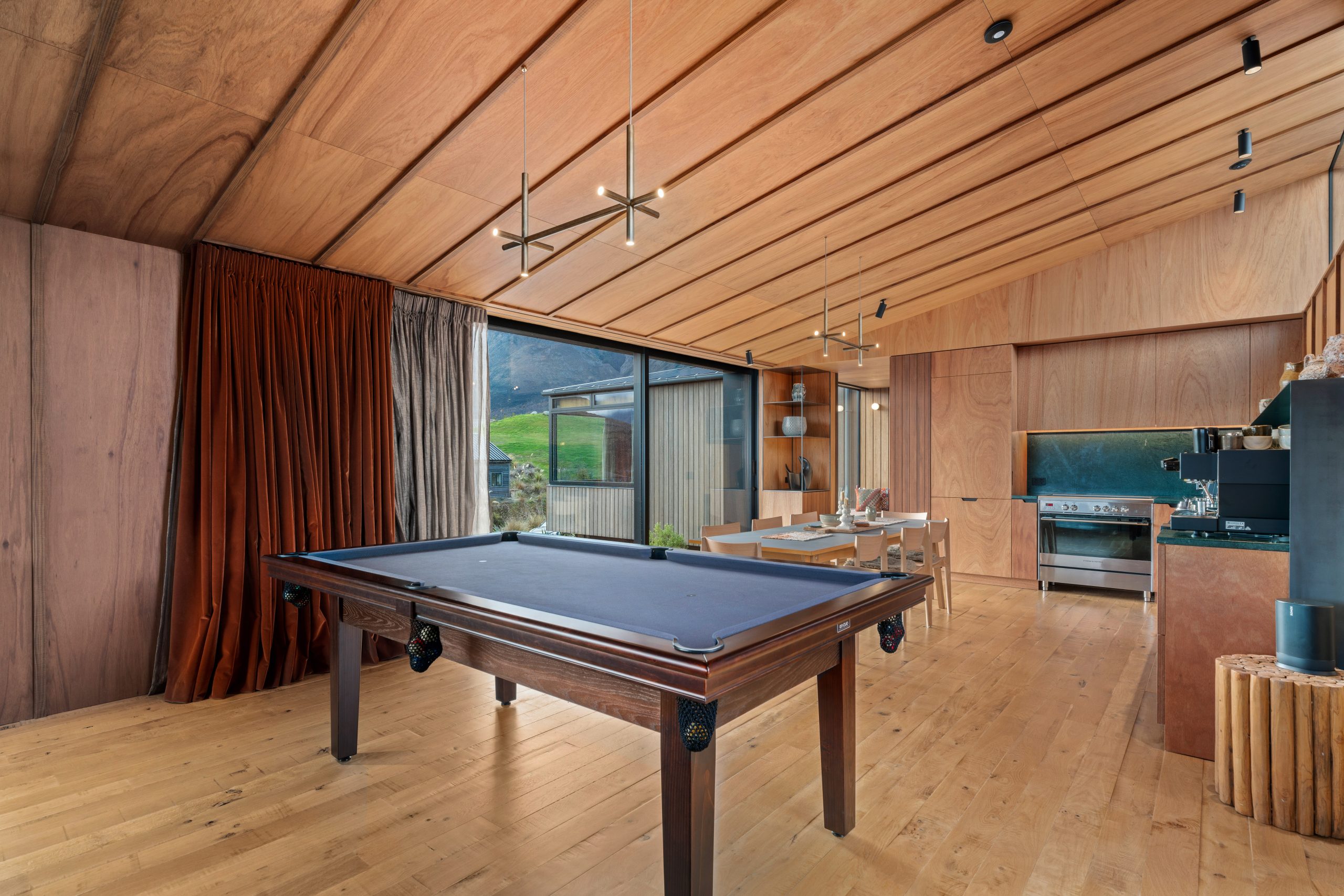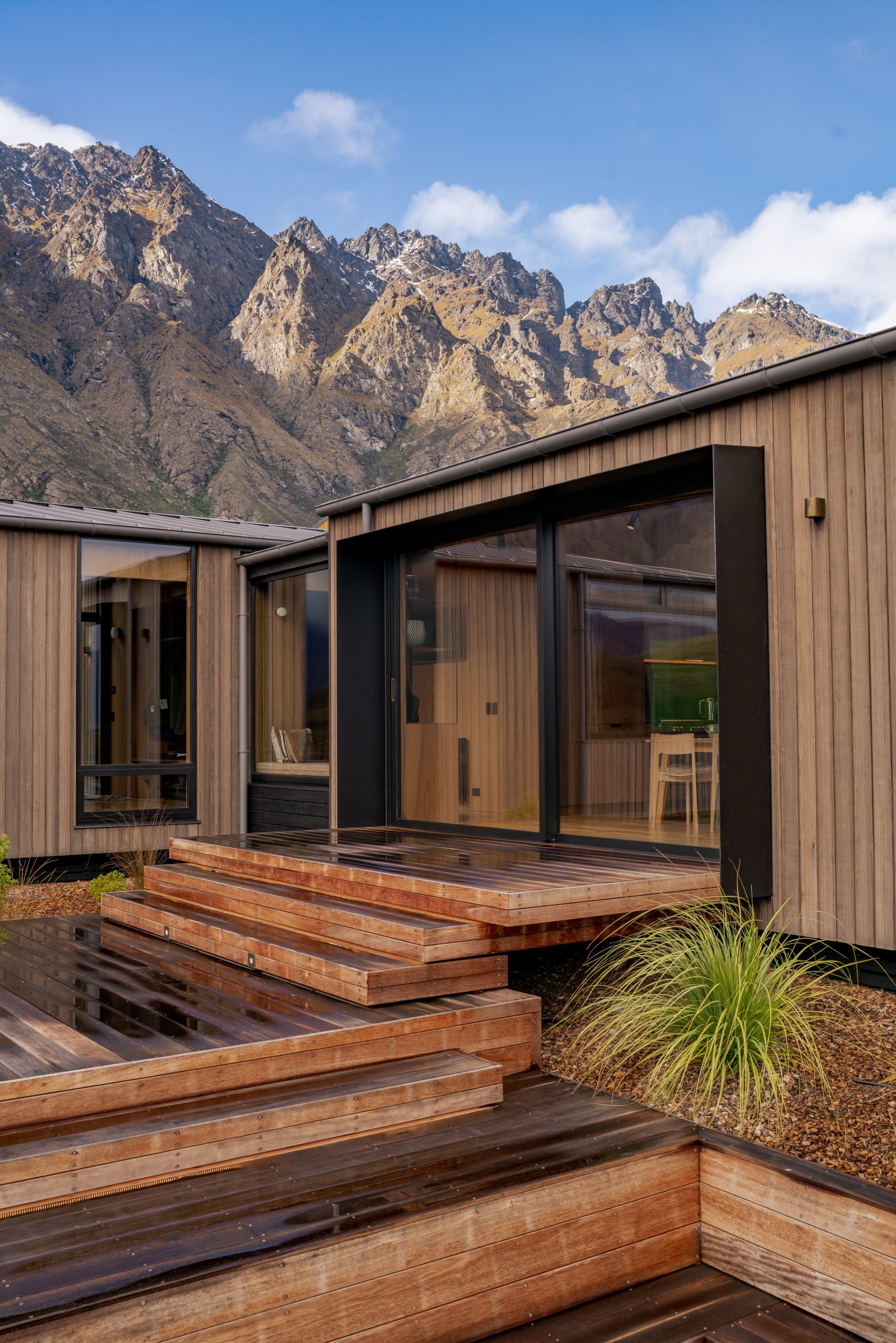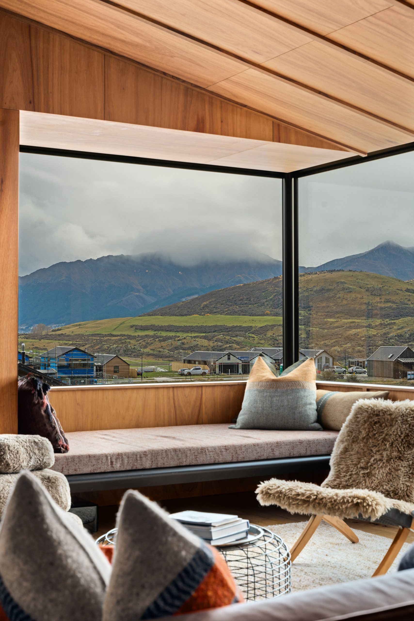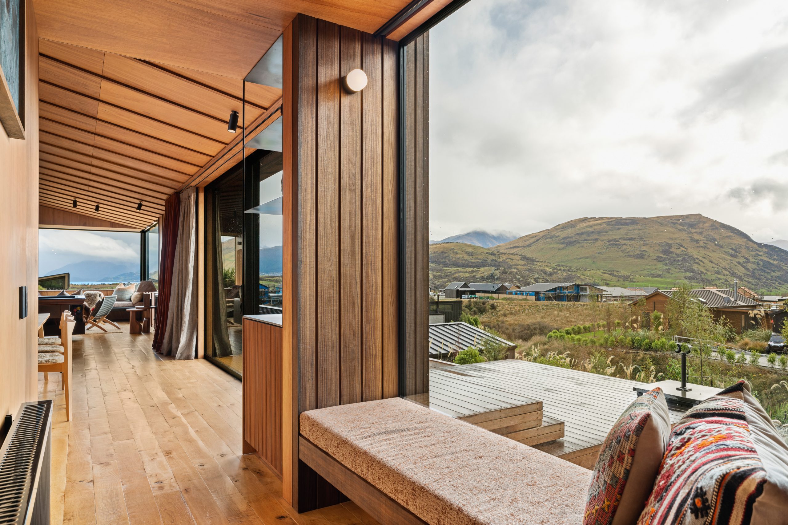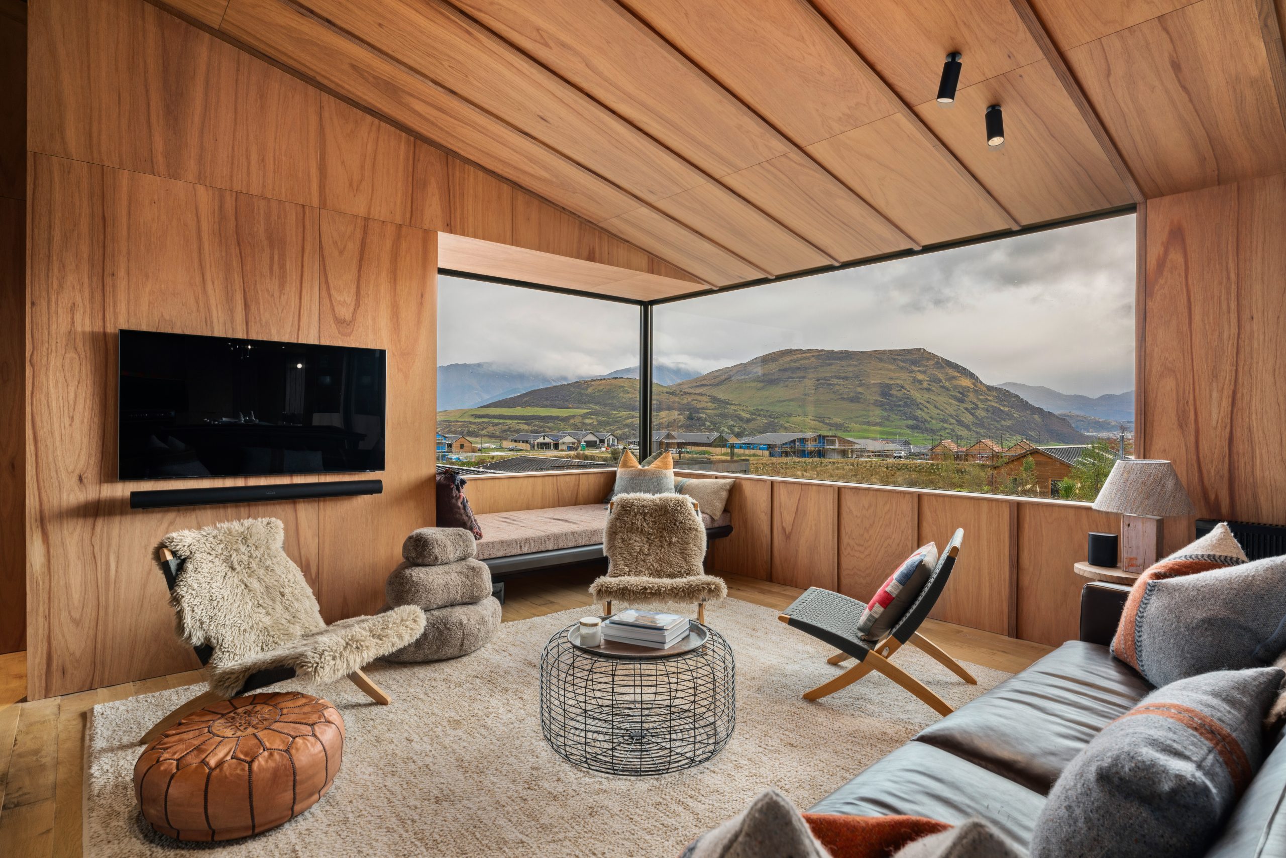 The home’s T-shaped design features vertical timber cladding, giving it a clean, modern look that blends seamlessly with its surroundings. Steel-eyebrow eaves and expansive aluminium windows and doors, supplied by Aitken Joinery, add to the home’s contemporary style. These windows flood the interior with natural light and frame the incredible views of the Central Otago mountains, creating a strong connection between the home and its environment.