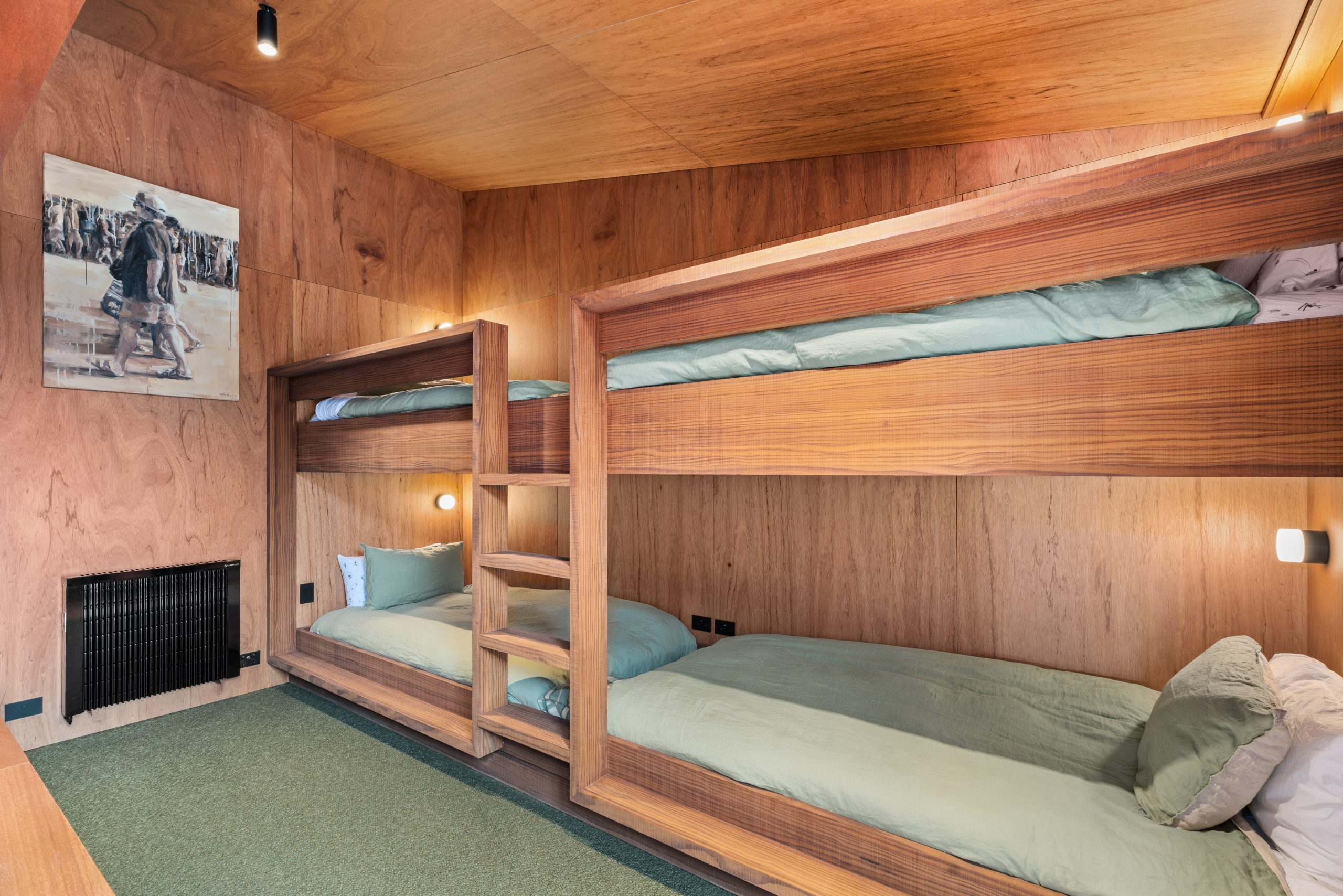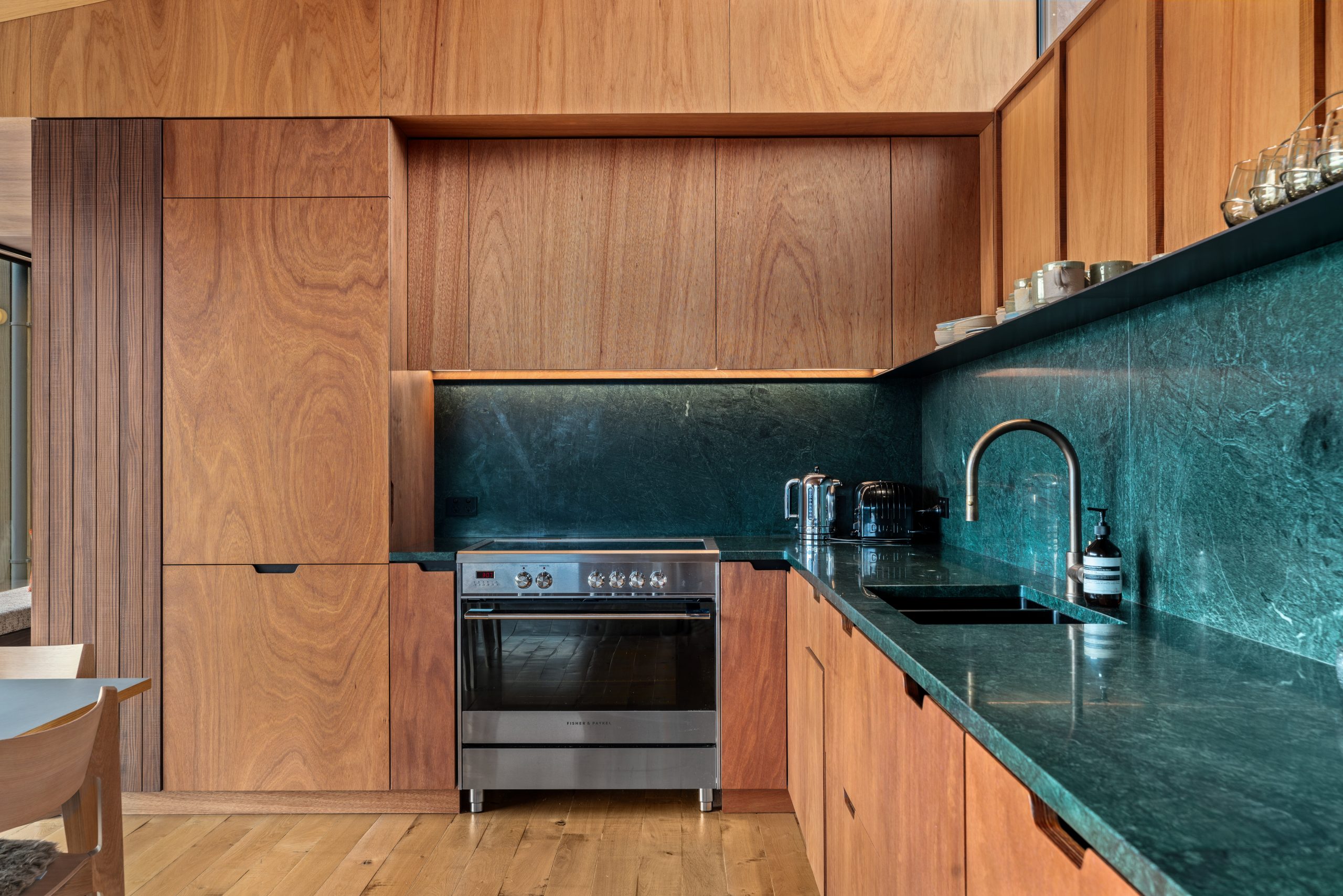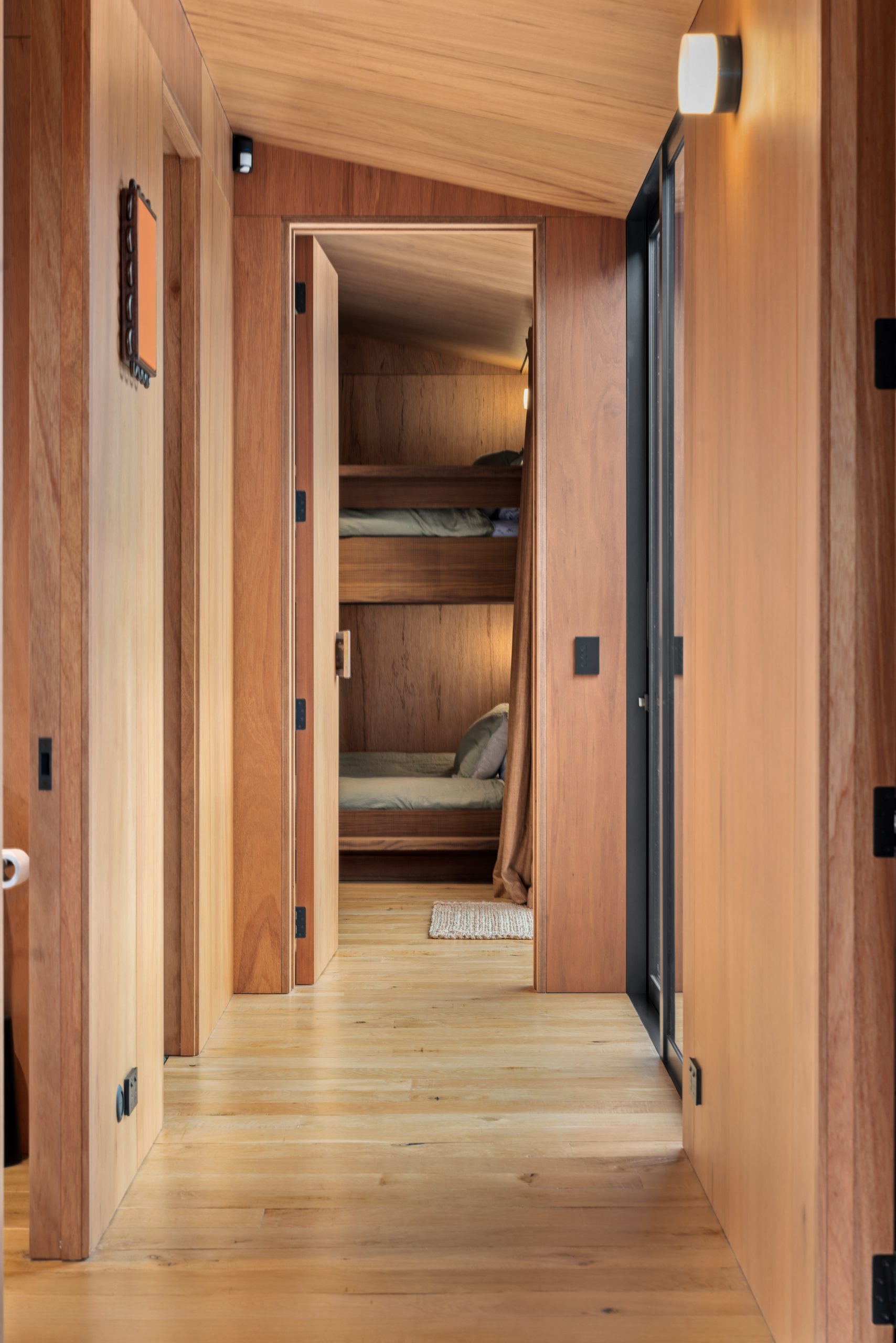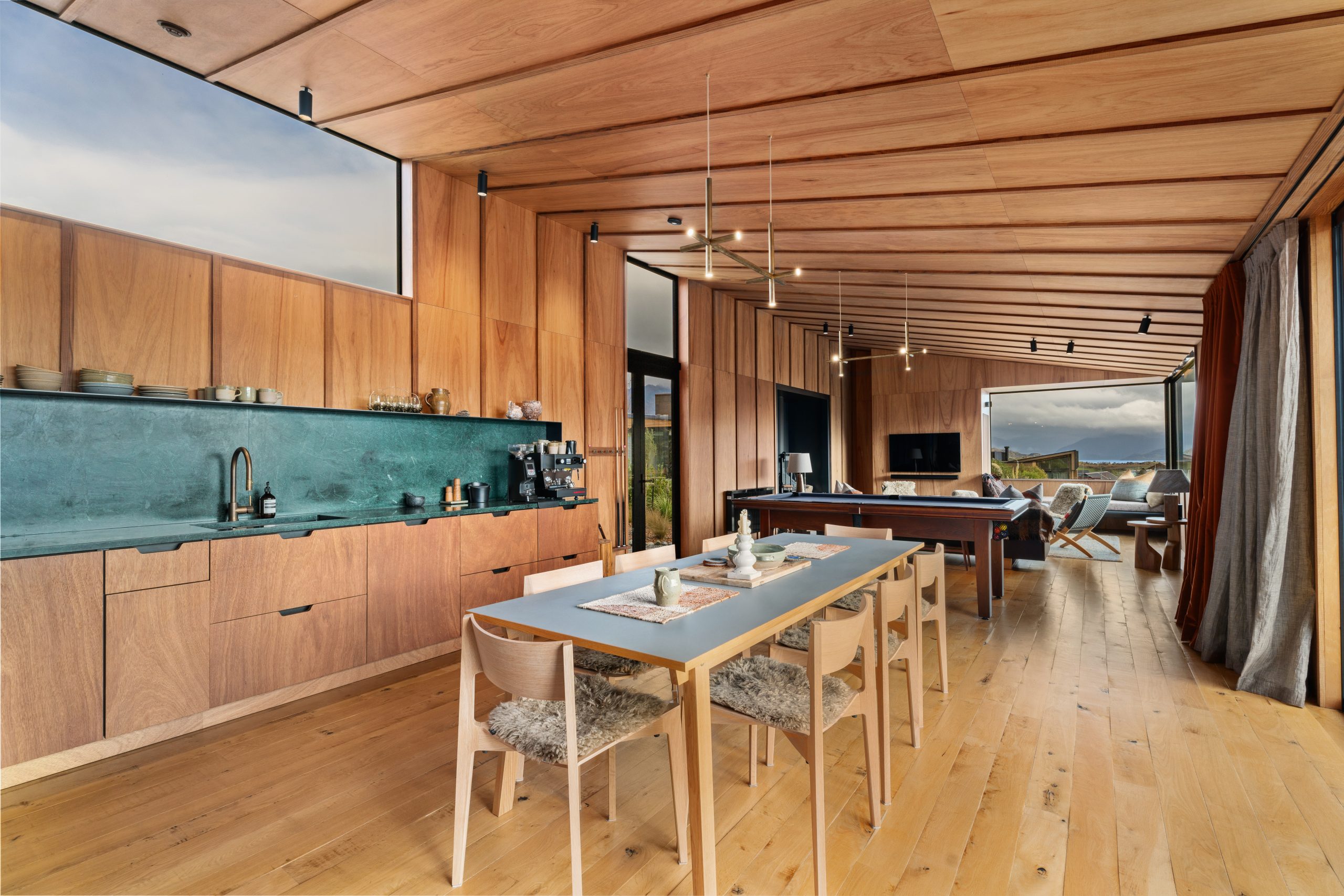 Inside, the home features negative-jointed Meranti plywood walls and ceilings—a creative solution to the Gib board shortages caused by the Covid-19 pandemic. This material required precision and skill, as there was no plaster to cover any imperfections. The result is a seamless and polished interior that highlights the builders’ expertise.