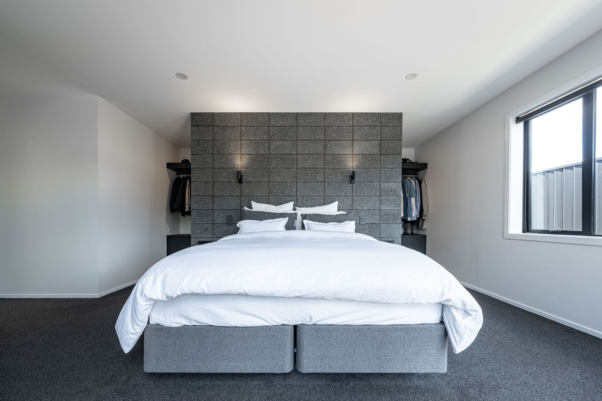 The property stands firm in James Hardie Stria cladding with complementary areas of polished, honed blockwork, a contrast that the homeowners love. So they seamlessly disappear when closed, reinforced garage door frames and commercial-strength door motors bear the weight of the custom-made garage doors.
