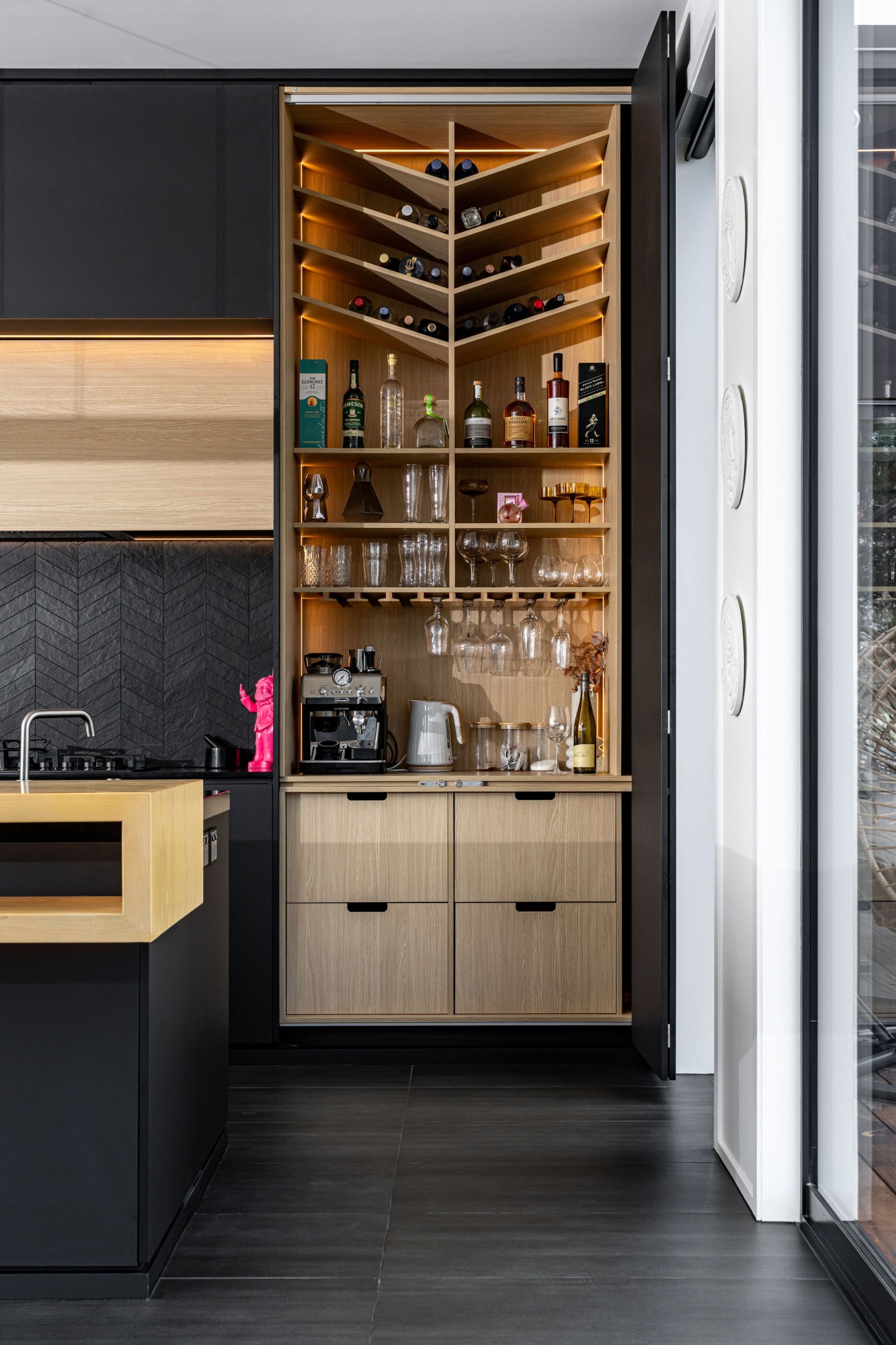 The few American Ash timber accents give the room depth and perspective. Left of the generously sized cooking appliances are floor-to-ceiling pivot doors that lead to a hidden scullery. To the right, the same-sized doors bi-fold against the wall, revealing a lit coffee and bar nook.