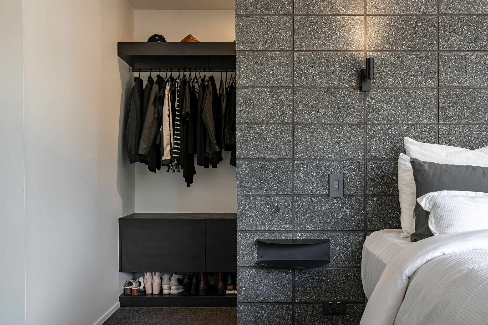 “Upon entry, a continuation of the honed stackbond masonry greets you, echoing the exterior and reinforcing the architectural narrative of strength and texture.”