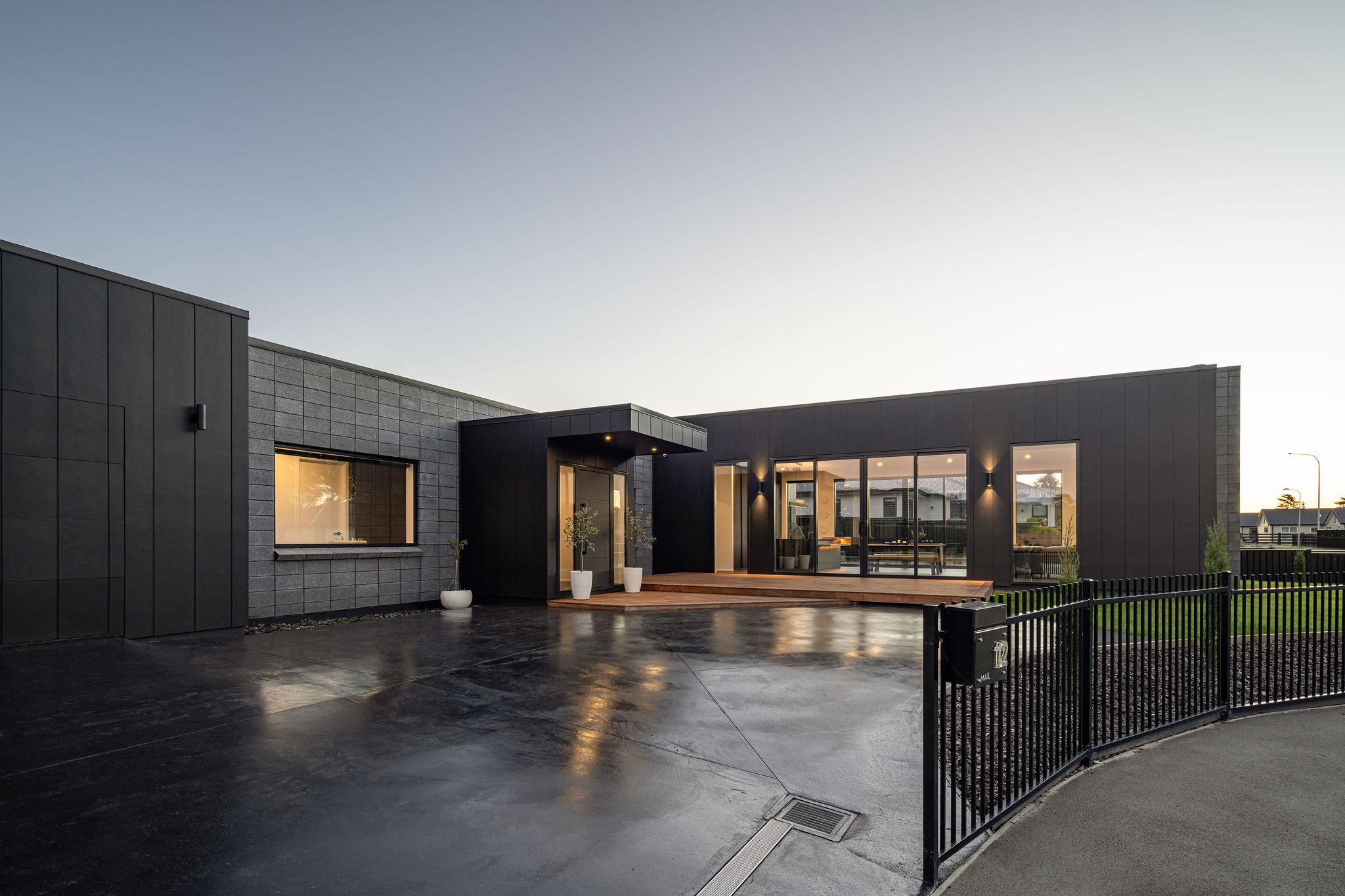 Kwila decks on each side of the living wing expand the open plan. A retaining wall encloses the entire property, featuring raised garden beds. Gloss-finished black oxide concrete and well-manicured lawns