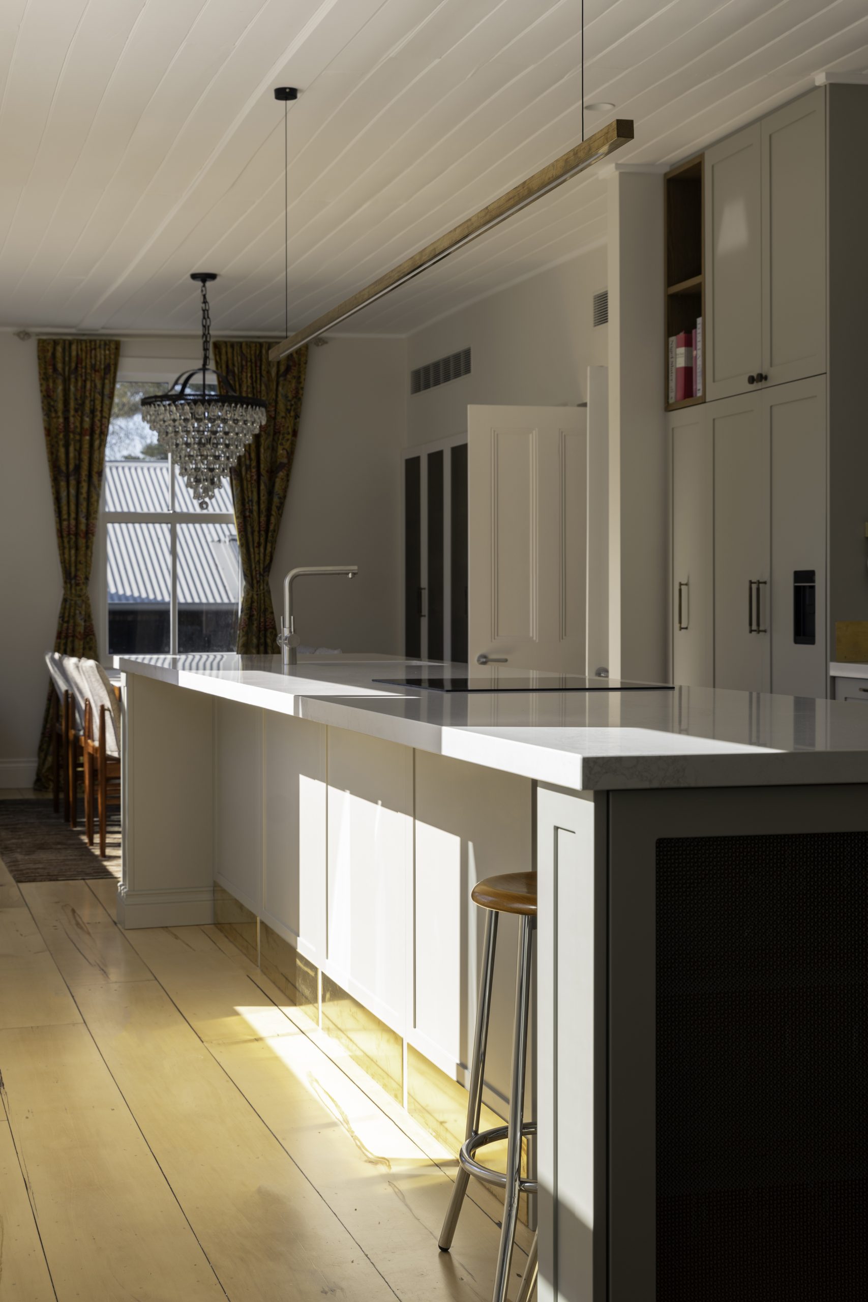 Timber doors and wide windows create indoor-outdoor flow and enhance the interior character, preserving the cottage’s historical charm while improving its functionality and aesthetic appeal. Natural textures, materials and fixtures prove seamless design choices, cohesively grounding the entire build.