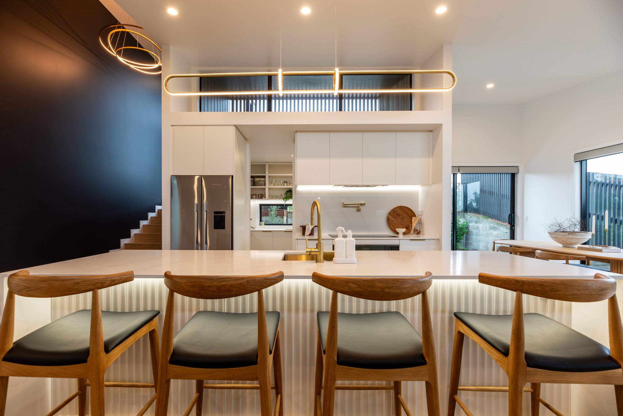The joinery by Pacific Coast Kitchens includes the bar area, laundry and garage storage. The kitchen benchtop is Trendstone Cala Eleganza, with Melteca Warm White satin doors and panels. The beautiful fluted feature panels on the island are a painted Laminex Surround. “The stone benchtops are practical and luxurious with waterfall edges and continue up to the splashback to give a beautiful luxurious effect while also being very practical for this busy family. Another stunning feature is the ripple panelling under the breakfast bar,” says Nicola.