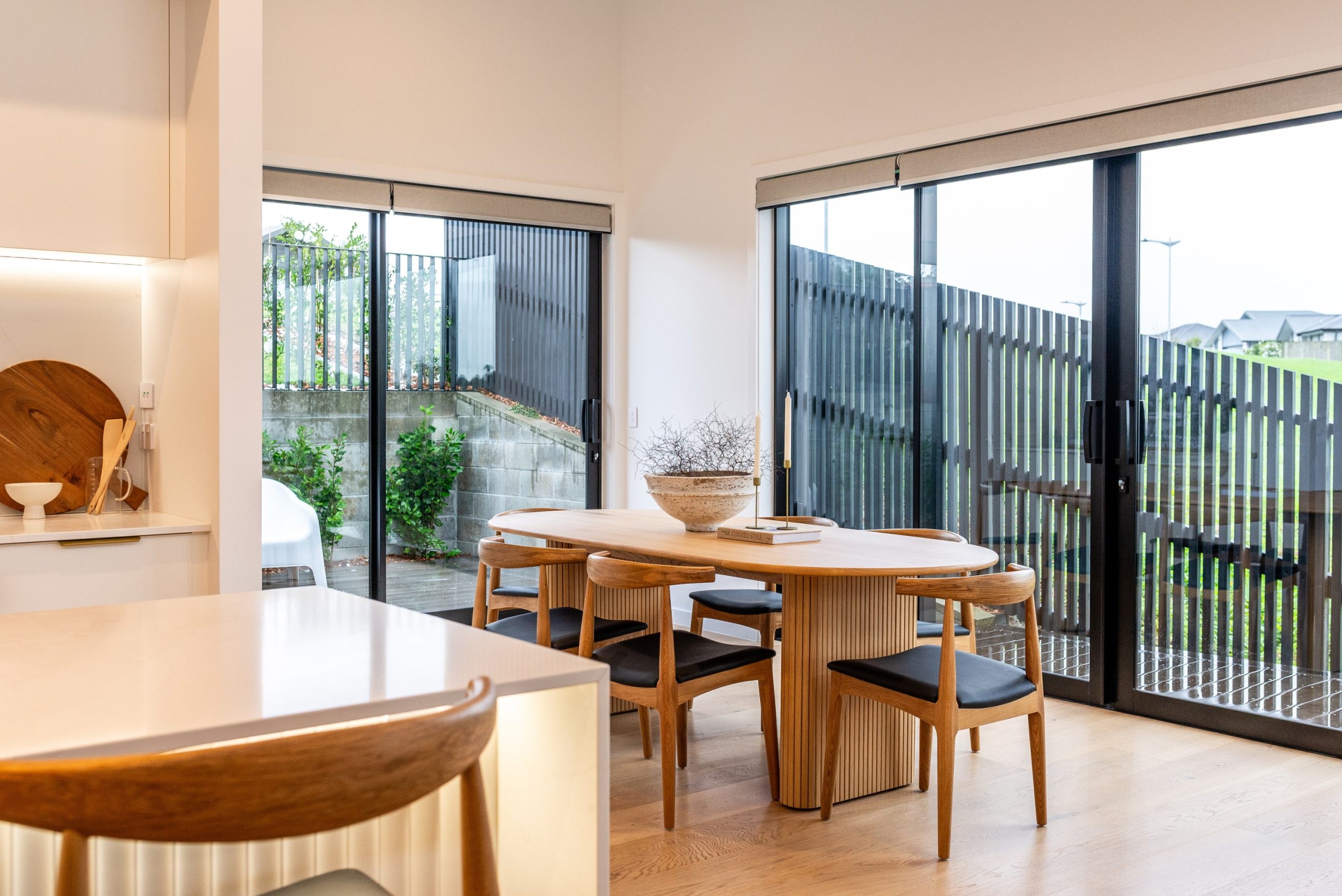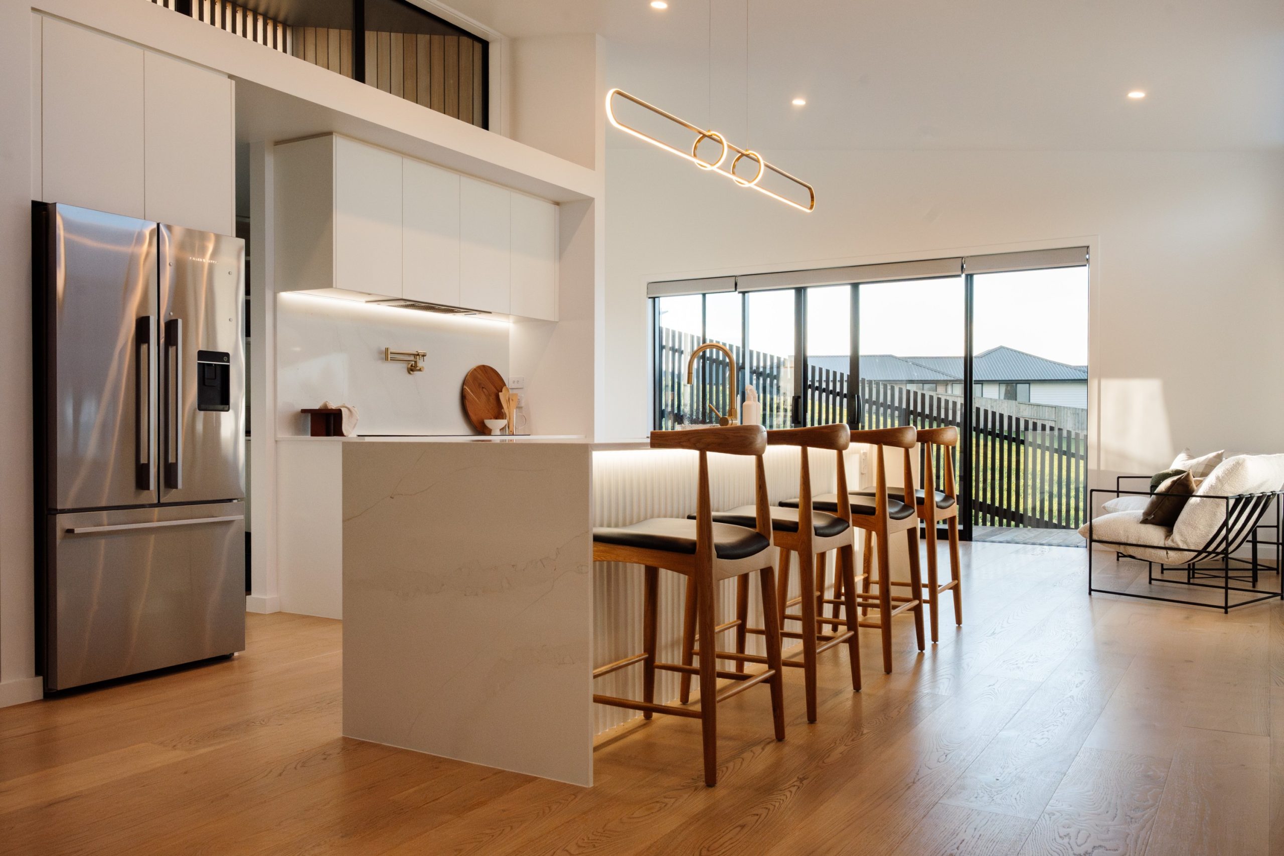 Nicola worked with homeowner Faye selecting finishes, colours, materials, lighting, cabinetry details and advising on all those big decisions needed to be made throughout the building process. The interior of the home was expertly painted by Hamish Ross Painters. White was the base colour with warmer elements of brass and Hurford’s Oak timber flooring installed by Abstract Floors to elevate the interior with softness, warmth and practicality. Colour has been used sparingly, with a soft green fluted feature wall in the primary suite and a touch of black coming in from outside in the entrance feature wall that continues down a level into the kitchen area. Shades of soft grey and taupe feature in the tiles, installed by SRL Tiling and wool carpets bring timeless neutral colour.